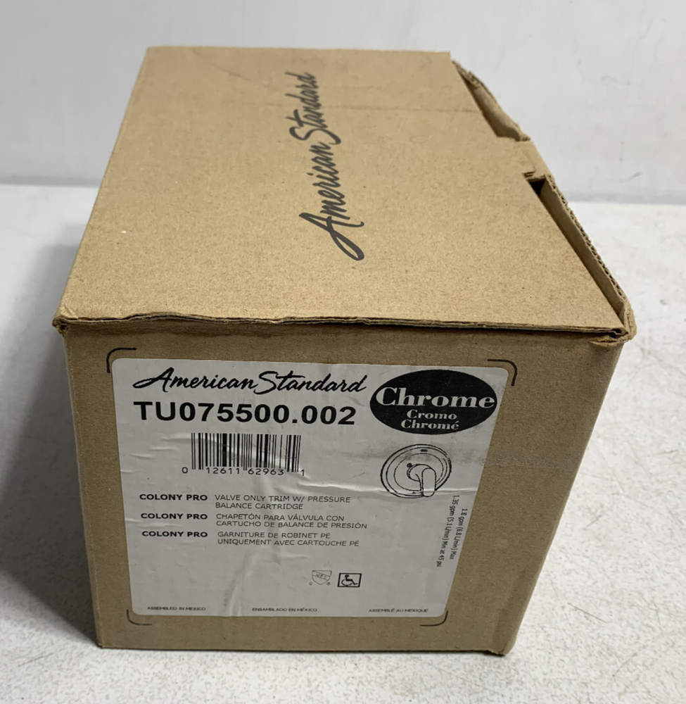 This is a NEW - unused American Standard TU075500.002 Colony Pro Valve Only Trim w/Pressure Balance Buyers and Re-sellers, don't miss this opportunity to purchase quality surplus equipment at a great price! There are many more surplus parts on our store, check it out! Return Policy: Returns are accepted within 60 days of the delivery date. Rest assured we will cover all return shipping costs! All returns must be in "as shipped" original condition to qualify for a refund. Photos of packing and product is required for damaged items. Customer returns that satisfy all of the above requirements will be issued a refund including any applicable sales tax Colony Pro is simply elegant and designed to complement any bathroom, from traditional to modern. It’s equipped with double ceramic pressure balance technology for consistent water temperature, anti-scald protection, and smooth, flawless operation. Engineered for dependability and superior performance, features tarnish and scratch resistant finishes to coordinate with the entire collection. Requires flash shower rough-in valve, sold separately. American Standard TU075.500 Features: Covered under American Standard's limited lifetime warranty Includes one-piece cartridge: simplifies installation and maintenance Double ceramic pressure balance cartridge: combination of ceramic disc mixing valve and a ceramic balancing spool in a one-piece cartridge Ceramic disc mixing valve assures a lifetime of drip-free performance and smooth handle operation Ceramic balancing spool maintains a constant output temperature in response to changes in relative hot and cold supply pressure Ceramic material is unaffected by mineral deposits and harsh water conditions Integrated check valves are engineered to eliminate cross flow Adjustable hot limit safety stop limits the amount of hot water allowed to mix with cold - reduces the risk of accidental scalding