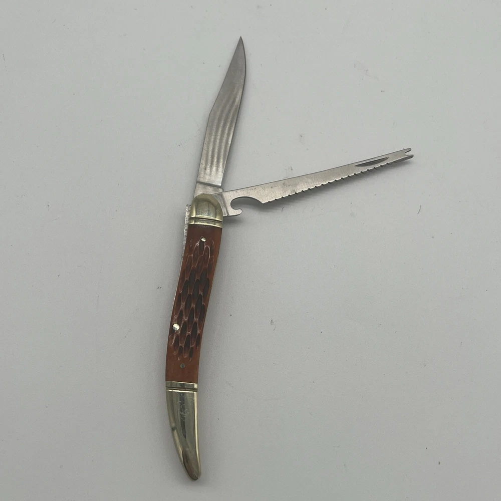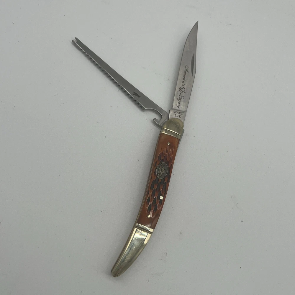 This Americas Legacy folding bone knife with bone and brass handle pocketknife is a must-have for any collector or outdoor enthusiast. Its manual opening mechanism allows for easy access to the 2.76 - 4in. plain edge blade, which is perfect for everyday use or outdoor adventures. The knife also features a bottle opener tool, making it a versatile addition to your collection. The brown color of the knife and the modern folding design make it a stylish and functional accessory. Whether you're using it for camping, hunting, or everyday tasks, this knife is sure to impress. Add it to your collection today and experience the quality and durability of Americas Legacy.