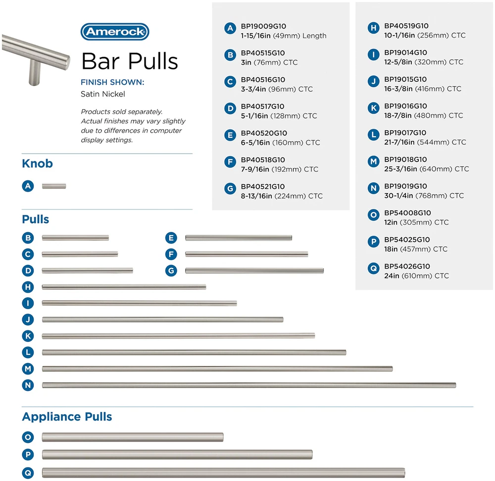 Powered by Frooition All Categories Amerock BP54008 Bar Pulls 12 Inch Center to Center Bar Appliance Pull Overview Item Description Features: Constructed of solid stainless steel for durability and dependability Coordinates with other items from the Bar Pulls collection Includes mounting hardware: #10-24 x 3/4 in., #10-24 x 1 in., #10-24 x 1-1/4 in., #10-24 x 1-1/2 in. and #10-24 x 1-3/4 in. Phillips Head Screw Covered by Amerock's limited lifetime manufacturer warranty Includes a single (1) pull Contemporary style adds an easy designer upgrade to any cabinet drawer, cabinet door or furniture piece Dimensions: Center to Center: 12" Length: 14-5/8" Width: 3/4" Projection: 2" Why Choose BuildInc? OUR PROMISE TO YOU About Us At Build, we promise to provide the best selection we can, most competitive pricing, and unmatched customer service. Our store has quality home improvement products from trusted manufacturers like Moen, American Standard, Delta, Kraus, Kichler, Progress Lighting, Schlage, Kwikset, Baldwin, Broan, NuTone, Air King, and Rev-A-Shelf. With over 200,000 home improvement products for you to choose from, we have just what you need to get your project done. Fast & Free Shipping We promise to make it our priority to get you your items as fast as we can. We ship from 440 warehouses around the country, ensuring that your product will get to you as soon as possible. We know you're eager to get your hands on your new purchase, we would be too. As a bonus, most items ship for free. Returns We are happy to accept returns of unused or defective items for a refund within 30 days from the date of delivery. For returns outside 30 days, please contact our Customer Service team to go over our options. For full details, please view the Shipping and Payments tab above. To initiate a return simply go to the eBay Returns Portal and submit a return request. We ask that all items be returned with all original components via a traceable method. Once your return is received and processed, we will quickly get your refund or replacement issued. If for any reason you are unsatisfied with your purchase or for product or warranty questions, please contact Customer Service team for assistance. More Items! View more great items! About Us | Shipping | Returns | Contact Us | FAQ | Collections | Special Offers! Powered by Frooition Frooition Frooition | No-js Template | eBay design, eBay store design, eBay shop design, eBay template design, eBay listing design (ver:froo_no_js) This listing is currently undergoing maintenance, we apologize for any inconvenience caused.