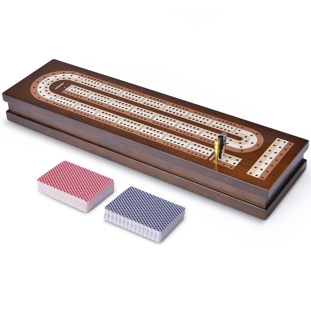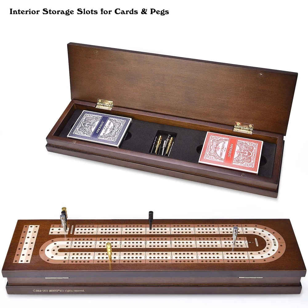 AMEROUS Wooden Cribbage Board Game Set With Magnetic Lock - Metal Pegs - 2 Cards Classic & Puzzle Board Game Set - The Cribage board game set is a classic strategy game created in the 17th century. With its unique scoring system, it is fun and educational, promotes critical thinking skills and strategic thinking, and exercises the mind to develop learning skills and intelligence, and is very interesting for children and adults. (Note: not suitable for children under 3 years old) 3 Track Cribbage Board Game - With a more scientific upgrade, the 3-track cribbage board consists of 3 different colors, continuous 3 track board and scoring numbers annotated, metal pegs in 3 colors (chrome, brass and black), 9 in total, you can enjoy this strategy game with your friends and family, providing a special experience that brings endless fun Magnetic Lock & Excellent Design - Our travel cribbage board game set with foldable design, easy to carry and storage, and provides a large storage space, with storage slots, very convenient to store playing cards and pegs, magnetic lock design, more secure, do not have to worry about losing any object. The bottom is covered with a soft fleece cloth to prevent scratching and sliding High Quality Material & Perfect Applicability - This travel cribbage board with card storage set is made of top quality solid wood with excellent sturdiness, not easy to damage, superb craftsmanship and cutting technology, smooth surface, won't scratch your hands. This board game set is ideal for home, office, travel, game room, family gatherings, picnics, birthdays, parties Meet Your Needs & Gifts - This complete set has everything you need: 1 foldable wooden Cribbage board, 2 decks of standard playing cards, 9 cribbage pegs and user guide, size: 14.7 x 4 x1.7inch, simple and fun game, this is also the most popular puzzle game this year, you can give it to your family and friends on birthdays, Christmas, New Year's Day, Children's Day, anniversaries, etc AMEROUS, a professional Board Games brand manufacturer. We have been in this industry for many years and have successfully created a variety of intellectual toys, which have now become the benchmark of this industry. We are committed to customer satisfaction, high-quality materials, and exquisite craftsmanship, excellent design, considerate service. Cribage Board Game is a classic strategy game that's fun for the whole family! Created in England in the early 17th century, this fun card game promotes critical thinking skills, is fun for children and adults, and is a great way to exercise your brain. Basic Rules: The number of players: 2, 3, 4 people, 2 people games are more common, and a traditional cards is used. The game requires the use of a cribbage Board, wooden and rectangular with rows of drilled holes. This is the game’s scorekeeping device and players each use two pegs to track points, leapfrogging one peg over the other from turn to turn. We have provided rule instructions for beginners. You can easily learn the rules, so everyone can start enjoying Cribage Board Game right away! Not only helps to develop intelligence, but also cultivates a tenacious and enterprising spirit. ☛The bottom is covered with soft velvet felt to prevent sliding and scratching ☛Made of high quality wood material, smooth surface, neatly cut, no sharp edges, won't hurt your hands ☛Perfect for travel, easy to carry, suitable for indoor and outdoor ☛Perfect for family game nights, trips, sleepovers, parties, get-togethers and more to start a fun time with your friends and family ☛Suitable for almost all ages, seniors, kids, adults, etc. Also can be used as the perfect gift ☛With a large storage space, you can easily store playing cards, metal cribbage pegs and cribbage game instructions without worrying about losing ☛Size: 14.7 x 4 x1.7inch Package Include: 1 x Cribbage Board 9 x Metal Pegs 2 x Playing Cards 1 x Instructions Shipping We offer FREE shipping on all orders! We ship within Three business days of payment, usually sooner. We use a selection of shipping services such as UPS, FedEx, USPS etc. We only ship to the lower 48 states, no APO/FPO addresses or PO Boxes allowed. Local pickups and combined shipping options are not provided at this time. Return You can return a product for up to 30 days from the date you purchased it. Any product you return must be in the same condition you received it and in the original packaging. Please keep the receipt. Payment We accept payment by any of the following methods: PayPal Please pay as soon as possible after winning an auction, as that will allow us to post your item to you sooner! Feedback Customer satisfaction is very important to us. If you have any problem with your order, please contact us and we will do our best to make you satisfied. Contact Us If you have any queries, please contact us via ebay. We usually respond within 24 hours on weekdays. Please visit our eBay store to check out other items for sale! Thank you for shopping at our store.