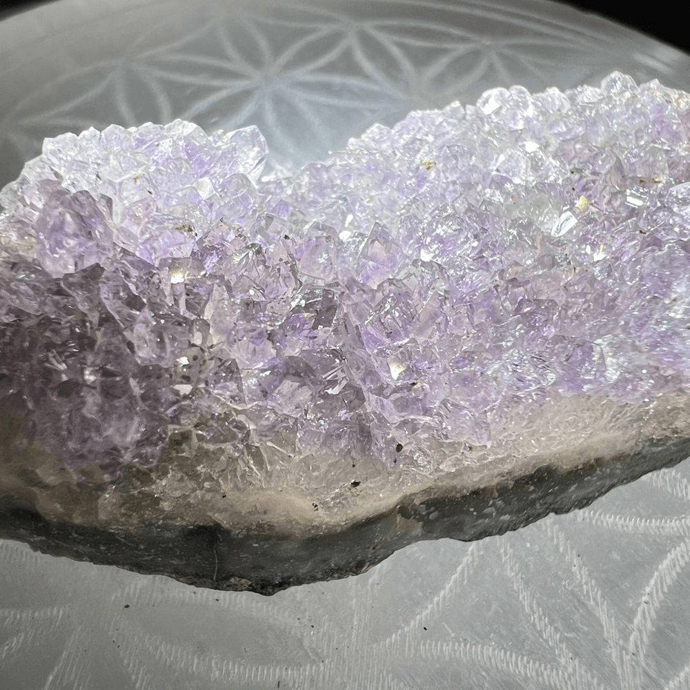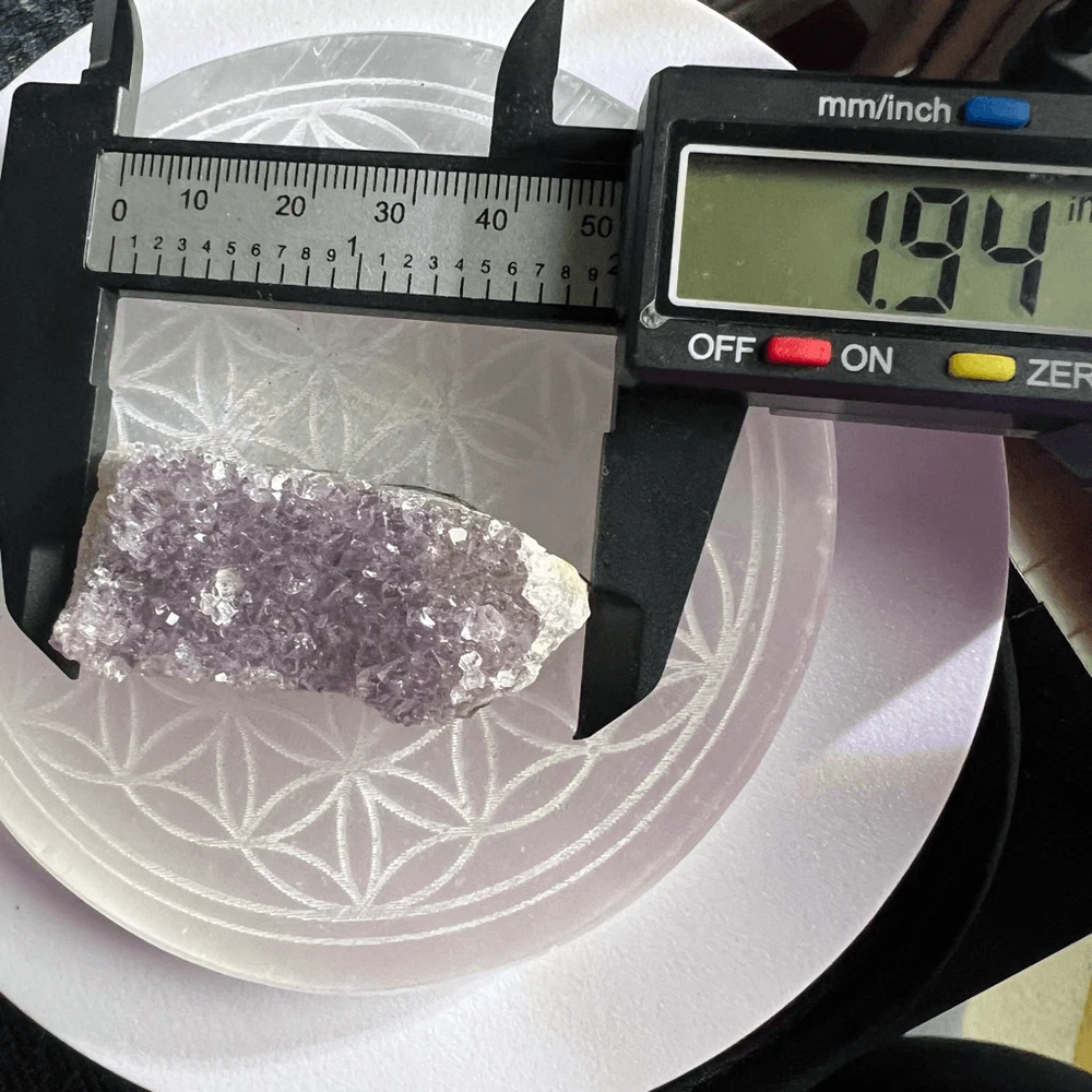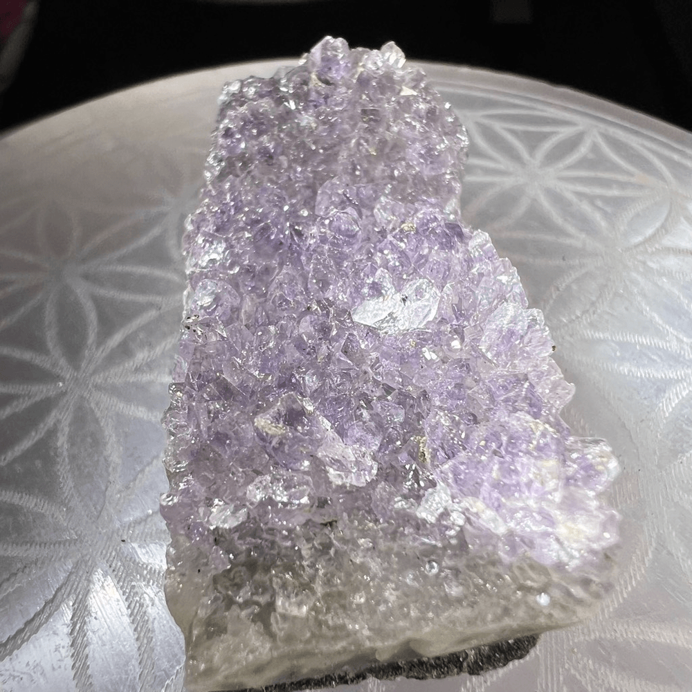 Amethyst Crystal Druzy Cluster (#3) ***LISTING IS FOR ONE ITEM *** An amethyst cluster is a stunning violet-hued crystal formation, characterized by its multitude of interconnected, pointed crystals. This exquisite specimen radiates tranquility and spiritual energy, making it a popular choice for meditation and stress relief. Amethyst is renowned for its ability to enhance intuition, promote emotional balance, and aid in sobriety. Its harmonizing properties create a soothing ambiance, ideal for enhancing one's spiritual practice and promoting a sense of inner peace and clarity. Approximate Measurements 30.70 grams 1.94” x 0.82” x 0.71” Please note natural stones are one of a kind and tend to have imperfections. Certian Lighting may alter the crystal’s color display in photos. Smoke Free | Pet Free Environment