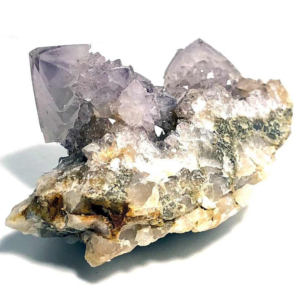 Cactus Quartz or Spirit Quartz Size Approximately 3 cm x 5 cm x 3.5 cm 48 g View My Other Items For Sale Visit My eBay Store Add me to your Favorite Sellers A cactus or spirit quartz is a quartz crystal that is encrusted by a second generation of smaller crystals grown on its prism faces. These crystals were first discovered in 1986 in the Magaliesberg Mountain Range near Pretoria, South Africa. It occurs as quartz, citrine and amethyst, and comes in a wide range of colors, including purple amethyst, violet amethyst, smoky, milky clear and golden citrine. FAQ/Tips Crystals are priced by quality, color and size. Purple amethyst is more highly prized and will cost more for a smaller lesser quality crystal. Lavender is the most common color and where you will find the best quality/value for price Crystals change colors with changes in type angle and intensity of light. Color may also vary between monitors. Pictures were taken in bright natural light. We do our best to give you many views so you can judge the quality of the given crystals. If you have questions please ask before bidding or buying. Many of the crystals have special color properties: Many have phantoms, not just the ones we?ve indicated. Some have ?floating? purple tips. The placement of darker purple against purple or white crystals appears to change as the crystal is turned. Many are a mixture of citrine and amethyst. The ones called ?Golden Healers? or ?Sunshine? have a rainbow effect on crystal faces. We value your feedback please contact us with problems. Items are returnable. Track Page Views With Auctiva's FREE Counter