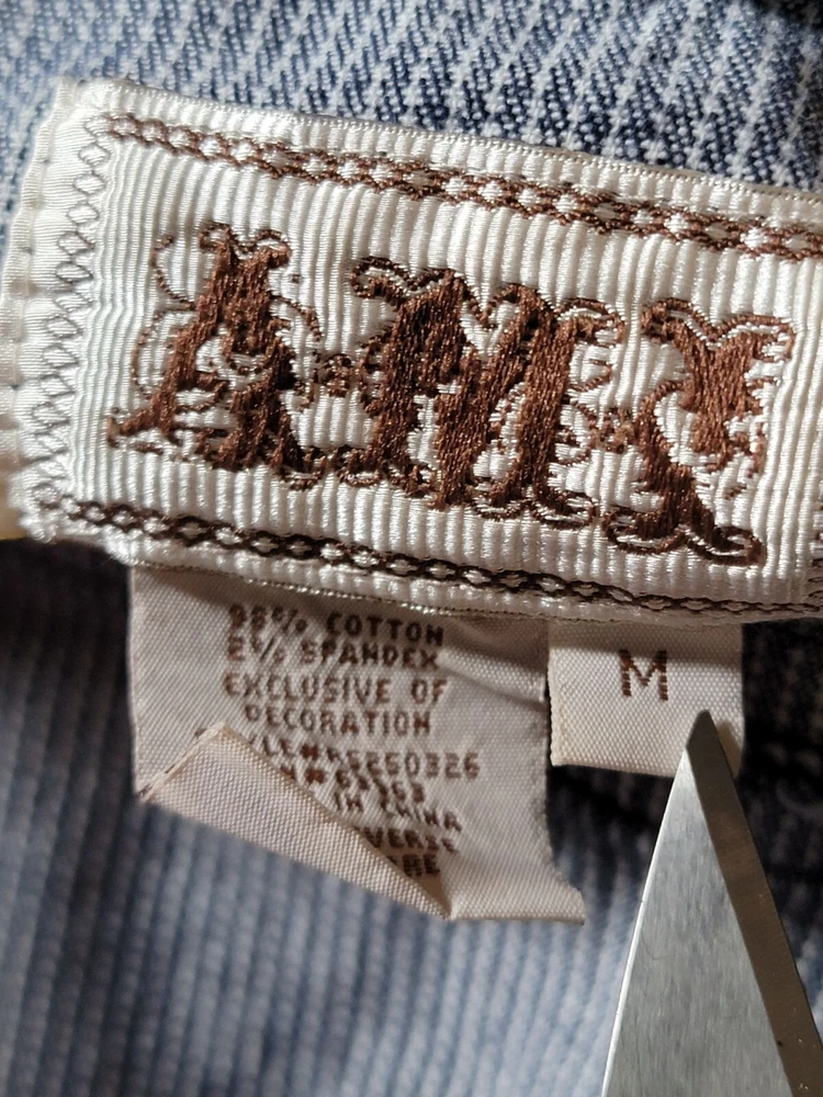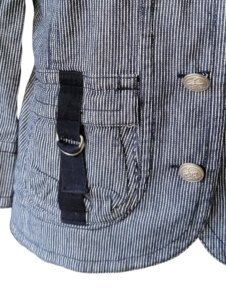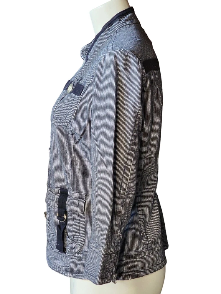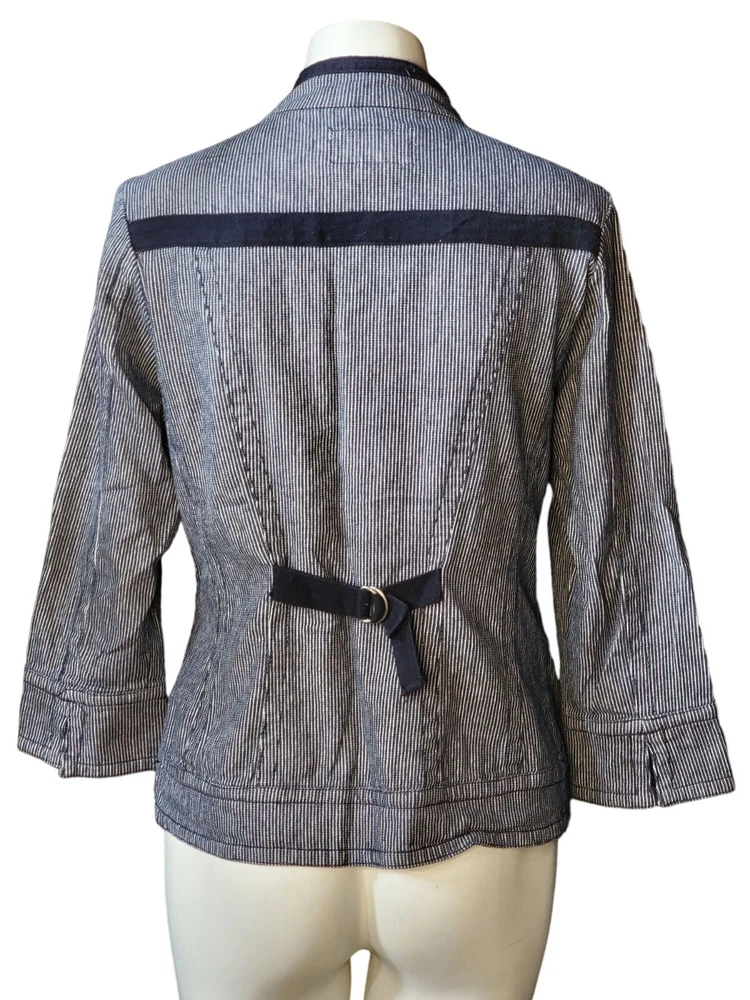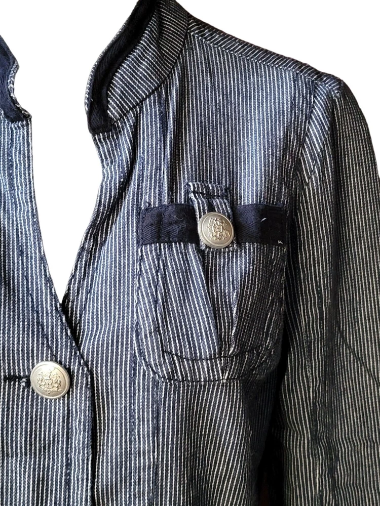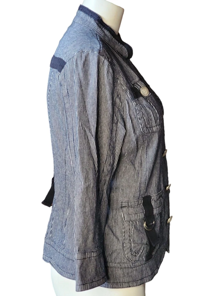 Elevate your style with this chic chambray pinstripe jacket in medium blue and white. Perfect for any occasion, this jacket features 3/4 sleeves and metal buttons for a modern touch. • Medium blue chambray • White pinstripe design • 3/4 sleeve length • Metal button details • Stylish and versatile Features: • High Collar • V Neckline • Large Metal Buttons • Adjustable straps on back at waistline • 2 chest pockets with flaps and button closure • 3/4 Sleeve, Multiple Outer Pockets • Stripes • 2 waist pockets with flaps & strap closures • 98% Cotton, 2% Spandex • Fitted Jacket, Adjustable Size: Womens Medium Flat Lay Measurements Pit to pit 20 in / 51 cm Sleeve 19 in / 48 cm Length 23.5 in / 60 cm Condition: Pre-Owned Good Good condition Gently used No rips, stains, tares, or pilling No visible signs of wear Measurements are found in the description Please review all photos and descriptions closely before purchasing. Thank you! Smoke free workspace Please read the description for further details and measurements, Thank you!
