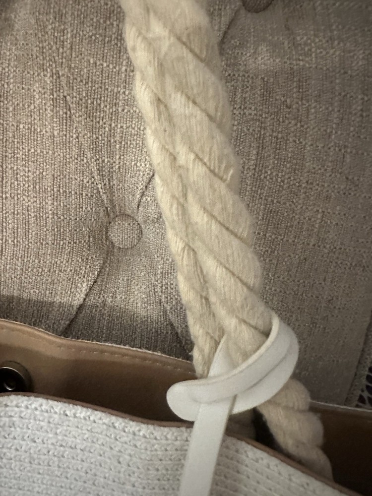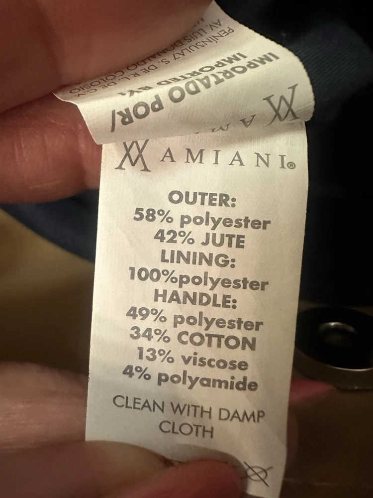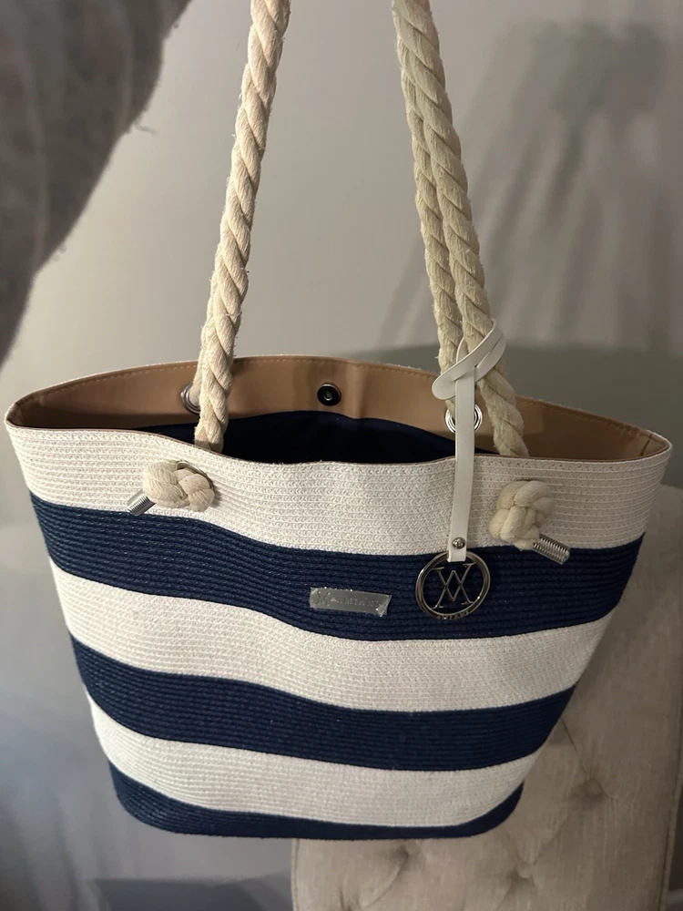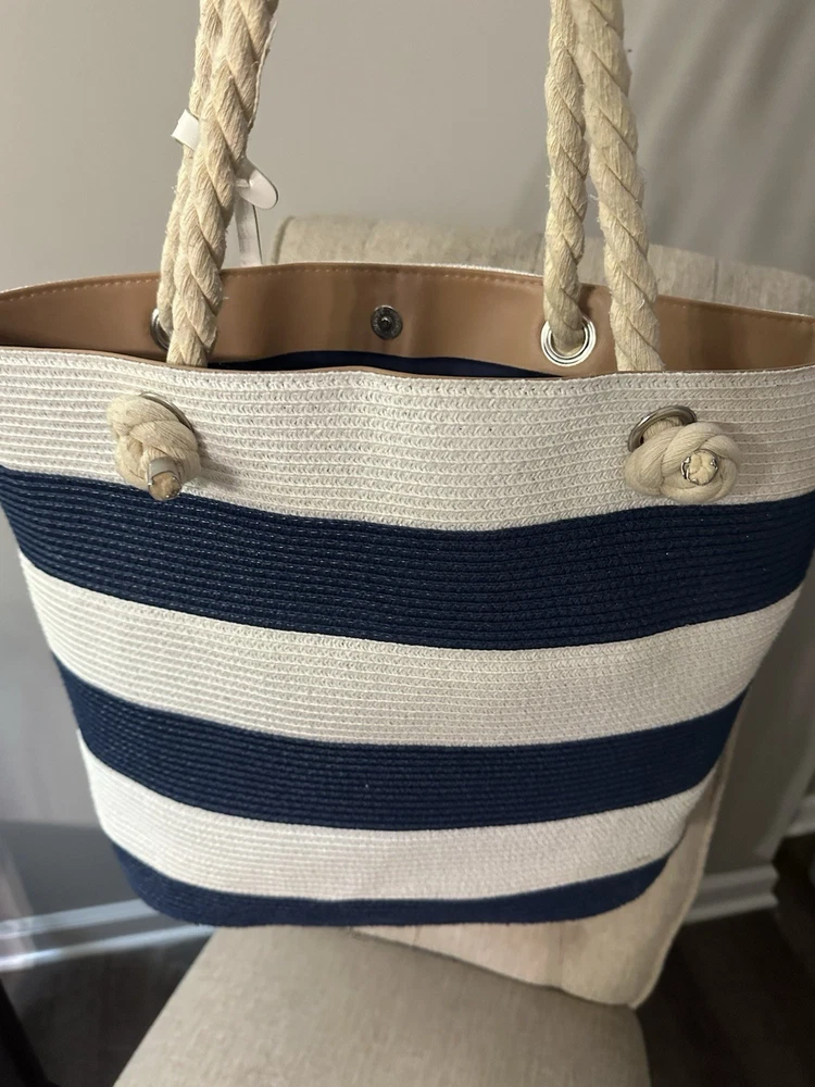 Closure: Magnetic Lining Color: Blue Theme: Beach Exterior Material: Jute, Polyester Model: Amiana Handle Style: Double Handles Lining Material: Polyester Country/Region of Manufacture: Mexico Bag Height: 14 Hardware Color: White Department: Women Style: Tote Handle/Strap Color: White Size: Large Exterior Color: White And Blue Handle/Strap Material: Polyester Brand: Amiana Pattern: Striped