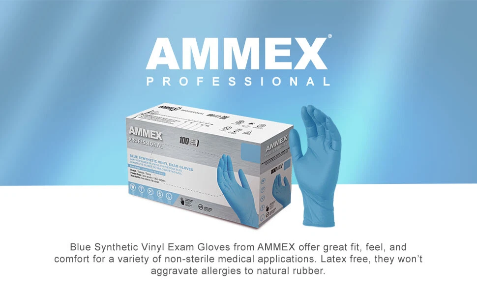 Stretch synthetic blue vinyl exam gloves from AMMEX are an economical alternative to latex and nitrile that deliver a high degree of comfort. These examination gloves deliver dependable barrier protection for doctors, nurses, dentists, dental hygienists, and in home caregiver environments. Latex-free medical gloves are ideal for those allergic to natural rubber, while powder free means no messy residue. Available in sizes S to XL and sold 100 per box, 10 boxes per case. Specifications: 3 Mil Exam Grade Stretch Synthetic Vinyl Latex and Powder Free Smooth Polymer Coated Non-Sterile Single Use Only Disposable Glove Basics: Material Stretch vinyl mimics nitrile's feel of durable, form-fitting, flexible gloves that can reduce hand strain and fatigue, with excellent tactile sensitivity. Texture Vinyl is less elastic than nitrile and latex, giving it a looser fit and a smooth, comfortable feel. Because the gloves are latex free, they help eliminate allergic reactions to latex protein. Thickness At 3 mil, these light-duty vinyl gloves provide a dependable barrier protection environmental contaminants. Product Dimensions : 9.4 x 4.7 x 2.4 inches; 1.21 Pounds Item model number : VSBPF44100BX Department : Unisex-adult UNSPSC Code : 46181500 Manufacturer : AMMEX Size 100 Count (Pack of 1) Material Vinyl Brand Ammex Color Blue, Box of 100 About this item vinyl Imported All of our products will have an updated look in coming months. You may continue to see previous packaging, or a mix of new and old, as we sell through our inventory. Rest assured that they both contain the same high-quality gloves. AMMEX Stretch Synthetic Blue Vinyl Exam Gloves are constructed from a 3-mil blend of PVC and synthetic elastomers. They measure 9.5 inches from fingertip to cuff. Stretch synthetic vinyl mimics latex’s feel of durable, form-fitting, flexible gloves that can help reduce hand strain and fatigue, with excellent tactile sensitivity. These examination gloves deliver dependable barrier protection for doctors, nurses, dentists, dental hygienists, and in home caregiver environments. Latex-free medical gloves are ideal for those allergic to natural rubber. AMMEX offers a range of exam-grade light-duty gloves in nitrile, vinyl, and latex that protect against pathogens and contaminants.