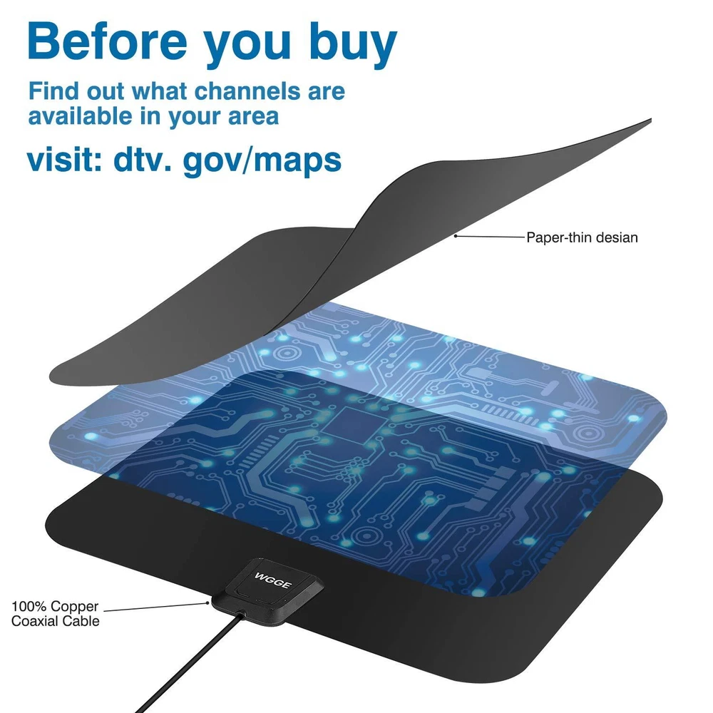 FULL HD CHANNELS: With UPGRADED 2024 antenna no more need to pay a HUGE bill on TV. Our HD antenna can receive FULL HD Channels like ABC, CBS, NBC, PBC, Fox and SO MUCH MORE. With amplified tv antenna start to access all of the news, sitcoms, kids and sports programs! ADVANCED TOOL FOR LIFE TO RECEIVE THE CHANNEL WITHOUT MONTHLY BILL! 300 MILES RANGE: The indoor HDTV antenna can reach up to 300 miles and can be placed almost anywhere in your Home. Digital antenna constantly scans for new channels as they're made available for broadcast. Hang the indoor antenna on a window or wall, or better position where owns better reception of your House. FUHD CRYSTAL-CLEAR TV & HD SOUND QUALITY: smart tv antenna adopts upgraded with new Generation Smart Switch control Powerful Amplifier Signal Booster with built-in Smart IC Chip Next generation & Crystal Clear Filter Technology to picks up signals within 300 miles range. The new technology filters out cellular and FM signals resulting in clearer picture, low noise and access to more free broadcast TV signals with enhanced gain, range and frequency performance. 17 ft Coaxial Cable &USB Power Adapter: Digital TV Antennas Include Standard Coax Cables With Stronger Copper Wiring This Coaxial Cable of Durable Construction Removes Signal Interference Bringing Superior HD Reception And Powerful Signal Reliability Smart USB Power Adapter With Built-In Overvoltage Protection Will Help You If there Is Not USB Output For Connecting TV Antenna To The Power Supply Note: Please remember to re-scan for channels after moving the Antenna. Please switch the amplifier to "short range" if your house is very close to the broadcast tower (within 35 Miles).roduct, 12 months manufacturer warranty and 24/7 hours customer service High-quality product, 12 months manufacturer warranty and 24/7 hours customer service
