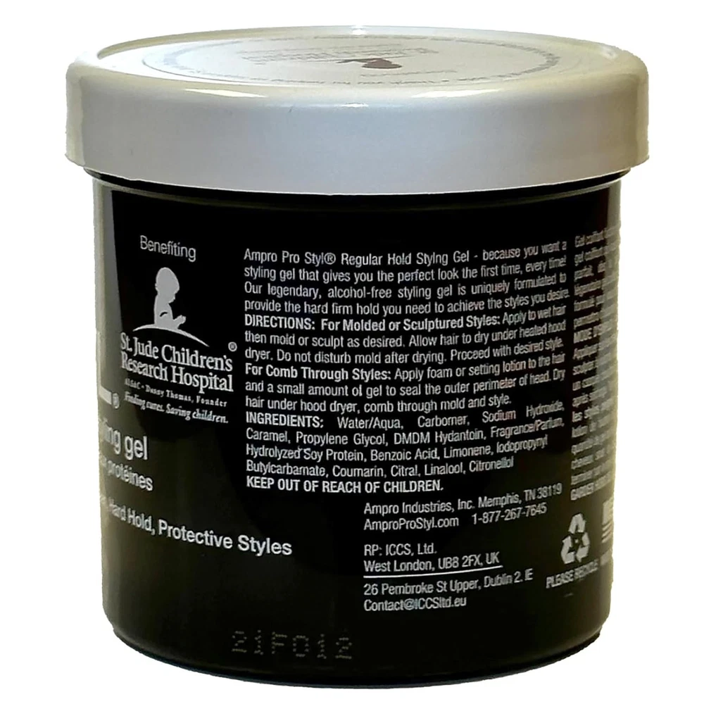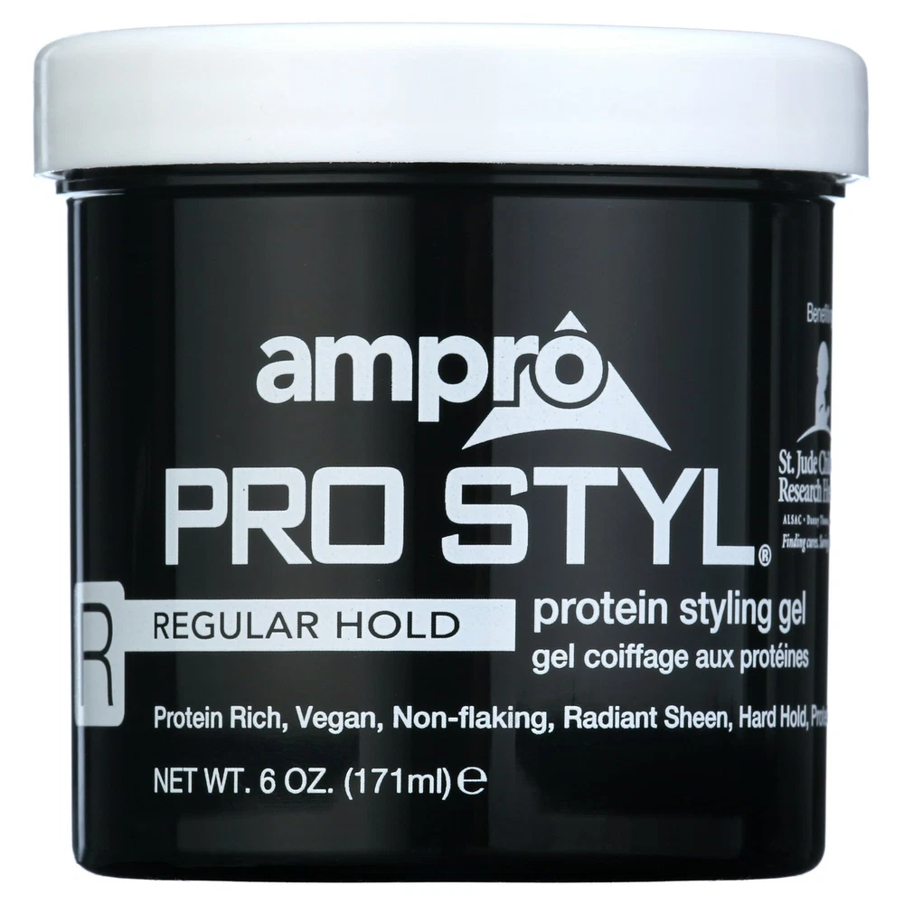Product Description Ampro Pro Styl Regular Hold Protein Hair Styling Moisturizing Gel, Unisex, 6oz (3 Pack) Ampro Pro Styl Regular Hold Protein Unisex Styling Gel - because you want a styling gel that gives you the perfect look the first time, every time! Our legendary vegan, alcohol-free styling gel is uniquely formulated to provide the hard, firm hold you need to achieve the styles you desire. This gel is designed for sculpting and molding hair styles and for protective hair styles with resistant hair textures. SAY GOODBYE TO FLYAWAYS. With this wonder-working gel, you can define your natural hair and tame lose strands with a firm, non-greasy hold, while also giving your hair a fresher, healthier shine. PROTEIN RICH FORMULA. Strengthen your hair with this protein-enriched gel, to boost your hair's resilience and leave it looking and feeling healthy. It protects your hair during styling and is great for natural hair and textured styles. GOODBYE FLAKES AND GREASE. Enjoy soft, manageable waves and curls by using this non-greasy gel. The moisturizing formula is non-flaking and distributes easily throughout your hair, to help create any hairstyle on any hair texture. A LEGACY PRODUCT LINE. Ampro, which stands for American Products, is a leading beauty manufacturer, established since 1947. We produce top-quality personal care products for hair, body, and skin, free of alcohol, parabens, sulfates, and dyes. MULTICULTURAL HAIR CARE PRODUCTS. Ampro is continuously expanding its hair care line by adding exciting new products, like our Shine 'n Jam Magic Fingers, the Ampro Pro Styl Olive Oil Styling Gel, and our newest kid's line, Ampro's Beautiful Child. Ingredients Water/Aqua, Carbomer, Sodium Hydroxide, Caramel, Propylene Glycol, DMDM Hydantoin, Fragrance/Parfum, Hydrolyzed Soy Protein, Benzoic Acid, Limonene, Iodopropynyl Butylcarbamate, Coumarin, Citral, Linalool, Citronellol