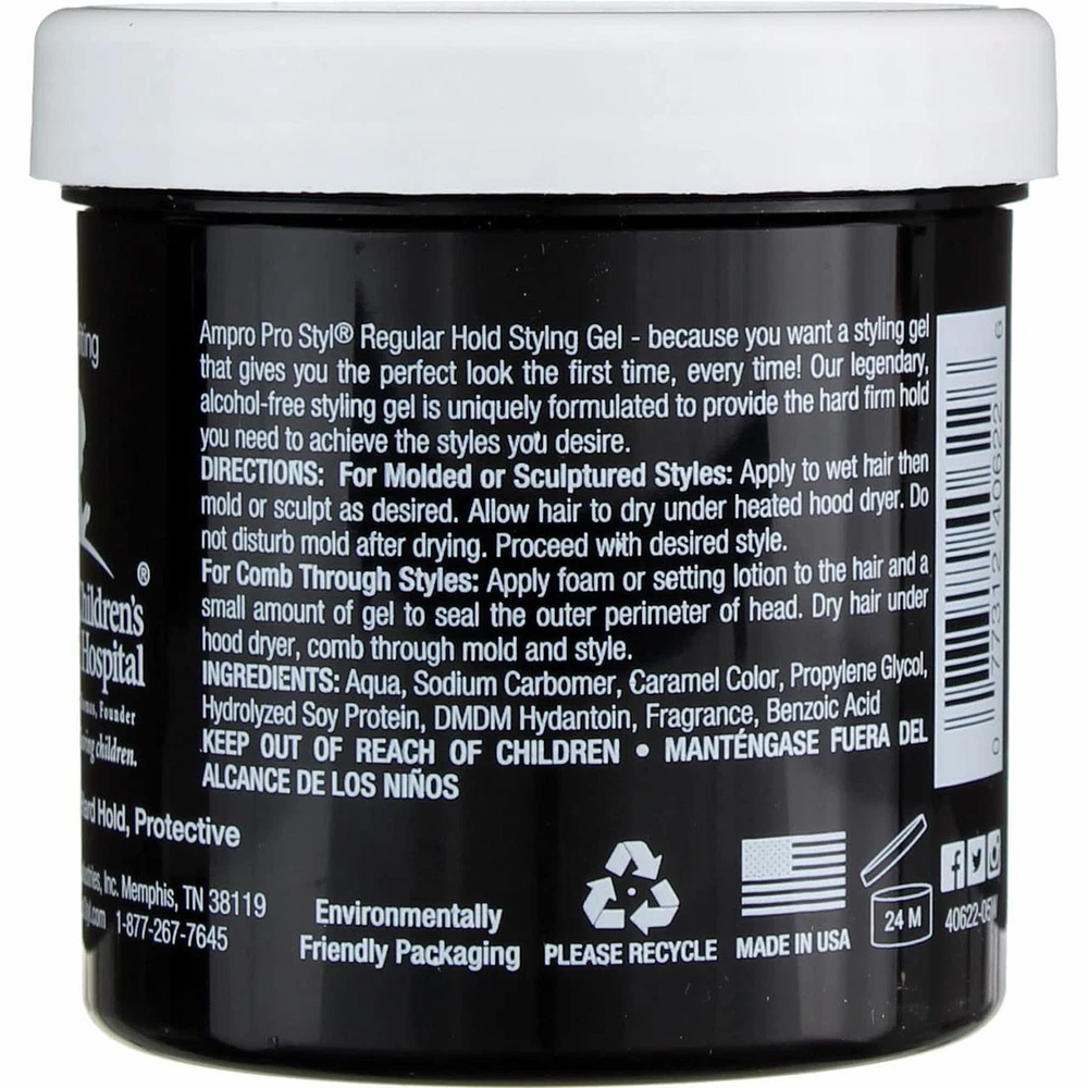 Product Description Ampro Pro Styl Regular Hold Protein Hair Styling Moisturizing Gel, Unisex, 6oz (4 Pack) Ampro Pro Styl Regular Hold Protein Unisex Styling Gel - because you want a styling gel that gives you the perfect look the first time, every time! Our legendary vegan, alcohol-free styling gel is uniquely formulated to provide the hard, firm hold you need to achieve the styles you desire. This gel is designed for sculpting and molding hair styles and for protective hair styles with resistant hair textures. SAY GOODBYE TO FLYAWAYS. With this wonder-working gel, you can define your natural hair and tame lose strands with a firm, non-greasy hold, while also giving your hair a fresher, healthier shine. PROTEIN RICH FORMULA. Strengthen your hair with this protein-enriched gel, to boost your hair's resilience and leave it looking and feeling healthy. It protects your hair during styling and is great for natural hair and textured styles. GOODBYE FLAKES AND GREASE. Enjoy soft, manageable waves and curls by using this non-greasy gel. The moisturizing formula is non-flaking and distributes easily throughout your hair, to help create any hairstyle on any hair texture. A LEGACY PRODUCT LINE. Ampro, which stands for American Products, is a leading beauty manufacturer, established since 1947. We produce top-quality personal care products for hair, body, and skin, free of alcohol, parabens, sulfates, and dyes. MULTICULTURAL HAIR CARE PRODUCTS. Ampro is continuously expanding its hair care line by adding exciting new products, like our Shine 'n Jam Magic Fingers, the Ampro Pro Styl Olive Oil Styling Gel, and our newest kid's line, Ampro's Beautiful Child. Ingredients Water/Aqua, Carbomer, Sodium Hydroxide, Caramel, Propylene Glycol, DMDM Hydantoin, Fragrance/Parfum, Hydrolyzed Soy Protein, Benzoic Acid, Limonene, Iodopropynyl Butylcarbamate, Coumarin, Citral, Linalool, Citronellol