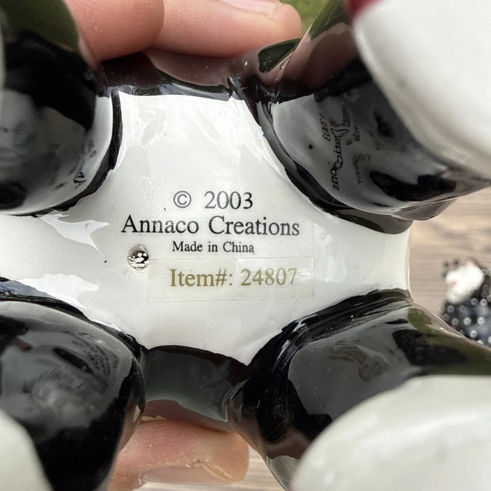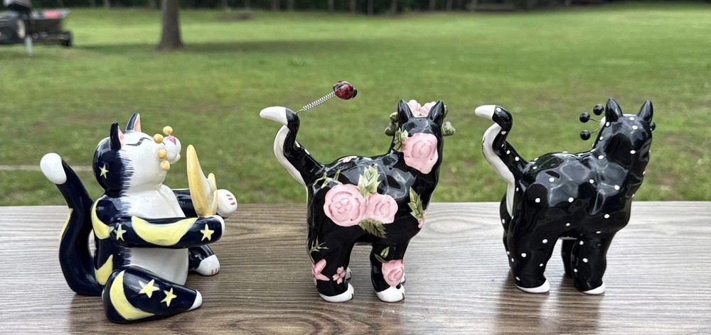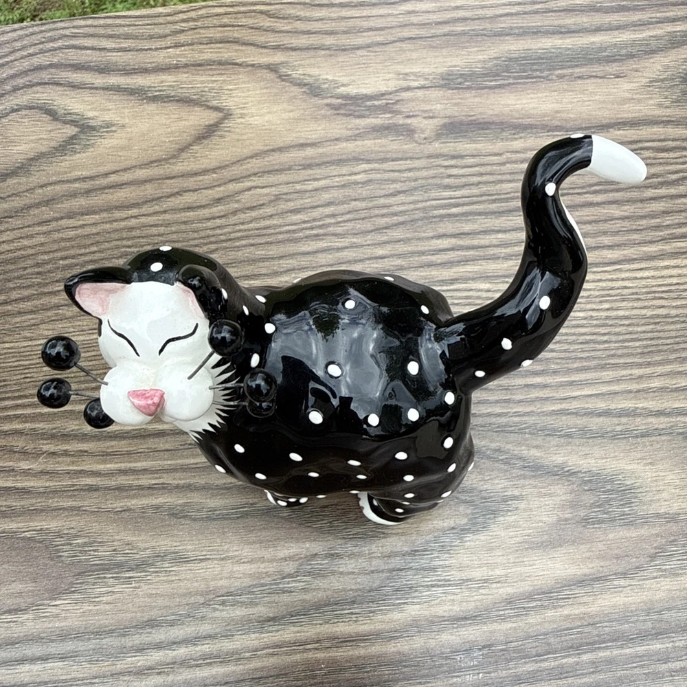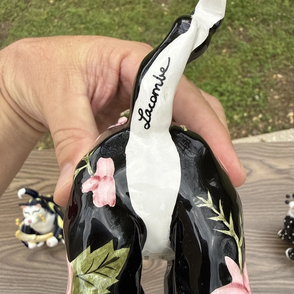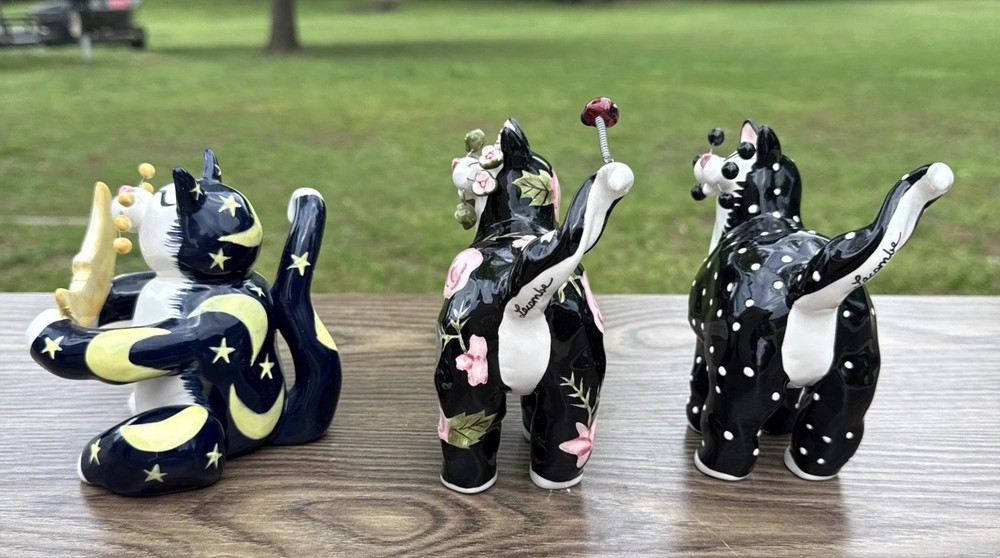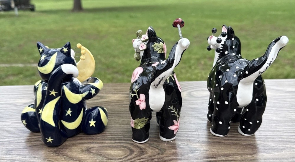 The Amy Lacombe WhimsiClay Cats Figurines #21045 #24807 and unnubered are charming collectible figurines of cats made of clay. Designed by Amy Lacombe, these whimsical figurines feature cats with a moon and floral dot design, adding a playful touch to any cat lover's collection. Made in China, these figurines capture the essence of the brand's playful and unique style, making them a delightful addition to any cat-themed decor.