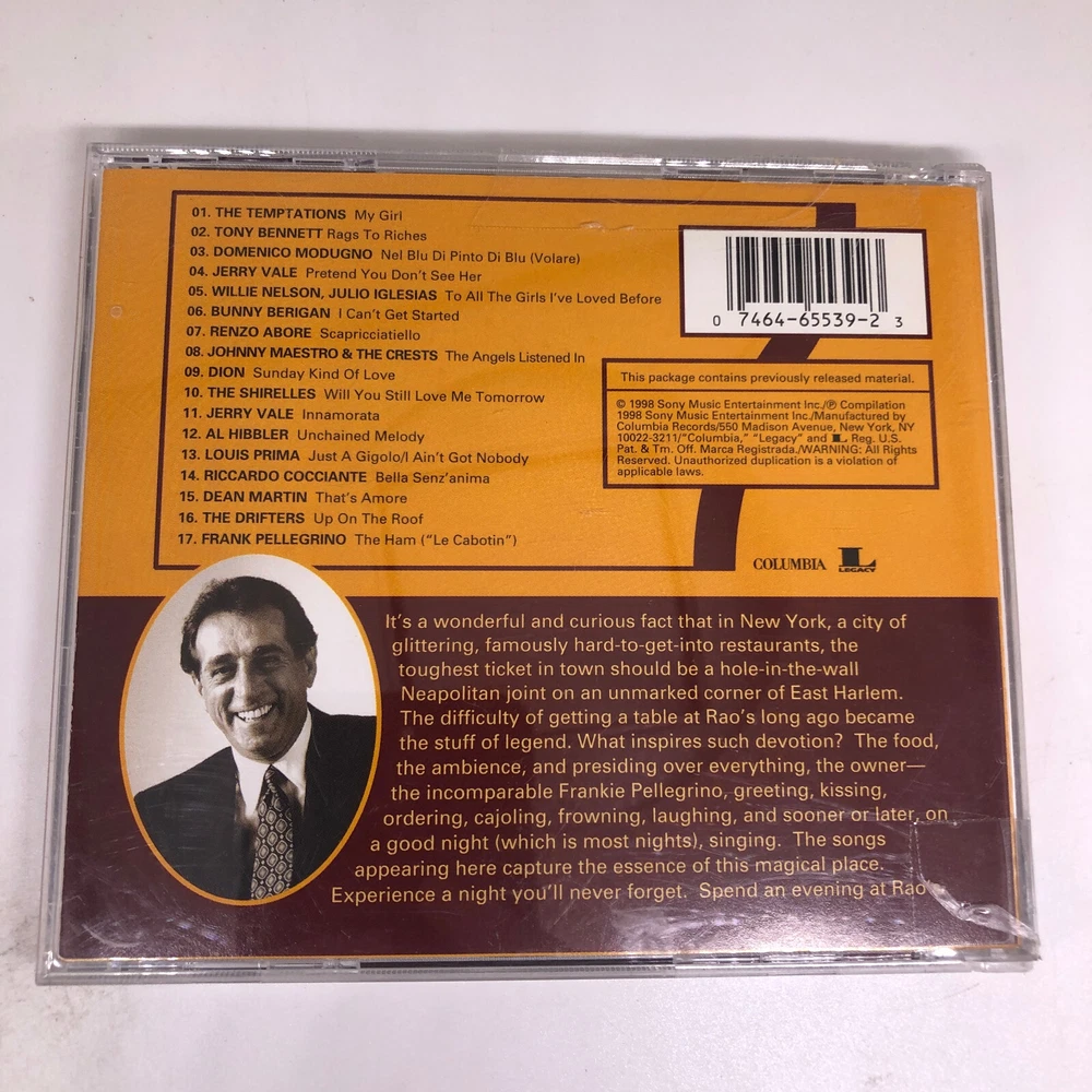 Case Type: Jewel Case: Standard Record Label: Columbia/Legacy Case Condition: Good (G) Format: CD gtin13: 0074646553923 Producer: Steve Berkowitz, Al Quaglieri (Compilation), Ettore Stratta Type: Album Release Title: An Evening at Rao's: Songs from an Italian Restaurant Release Year: 1998 CD Grading: Good (G) Seller Notes: “Guaranteed to play fine, some minor scratches and blemishes can be expected. Cases may be damaged.” UPC: 0074646553923 Run Time: 57 min. Artist: Various Inlay Condition: Good (G) Genre: Motown, R&B & Soul Style: Motown