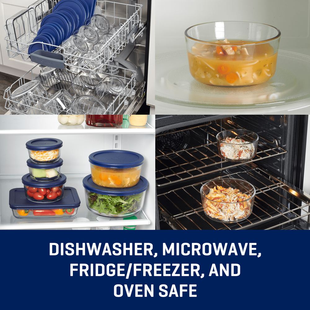 Anchor Hocking glass food storage containers with SnugFit lids are a kitchen essential. BPA-free plastic lids sit on glass containers that are extra-durable. The two pieces join together smoothly and tightly to store, transport, and reheat all manner of lunches, leftovers, and more. Glass is dishwasher (lids are top-rack safe), microwave, fridge/freezer, and oven safe up to 425°. INCLUDES: (4) 1-Cup Round, (3) 2-Cup Round, (4) 4-Cup Round, (2) 4.75- Cup Square and (2) 7-Cup Round food storage containers, (2) with (15) matching navy SnugFit lids. Unlike plastic, our glass storage doesn’t stain, warp, or retain smells. OVEN, MICROWAVE, DISHWASHER, FRIDGE/FREEZER SAFE GLASS: Our tempered-tough glass food storage set with lids is versatile but affordable. Prep, reheat, and store without worry. PROTECTS FOOD’S FLAVORS: Our glass storage containers with lids are made of pure glass that guards your food and protects its flavor. EXTRA DURABLE: These tempered-tough glass meal prep containers are built to withstand most kitchen and transport stresses. SnugFit Lids guard against most spills.