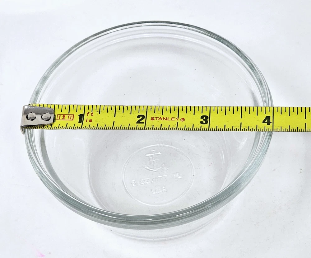Very nice clean bowls, no chips or cracks seen. Add a touch of vintage charm to your dessert table with this set of four Anchor Hocking custard bowls. The clear glass bowls are perfect for serving custard, pudding, or any other sweet treat. Each bowl has a capacity of 6 oz. and features a beautiful pattern that is sure to impress your guests. Crafted from high-quality glass, these bowls are durable and long-lasting. They are perfect for everyday use or for special occasions. The set includes both dessert bowls and a bowl set, making it ideal for serving custard in a variety of sizes. The Anchor Hocking brand is known for its quality and these bowls are no exception. Add them to your collection today!
