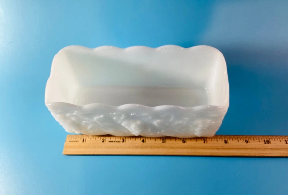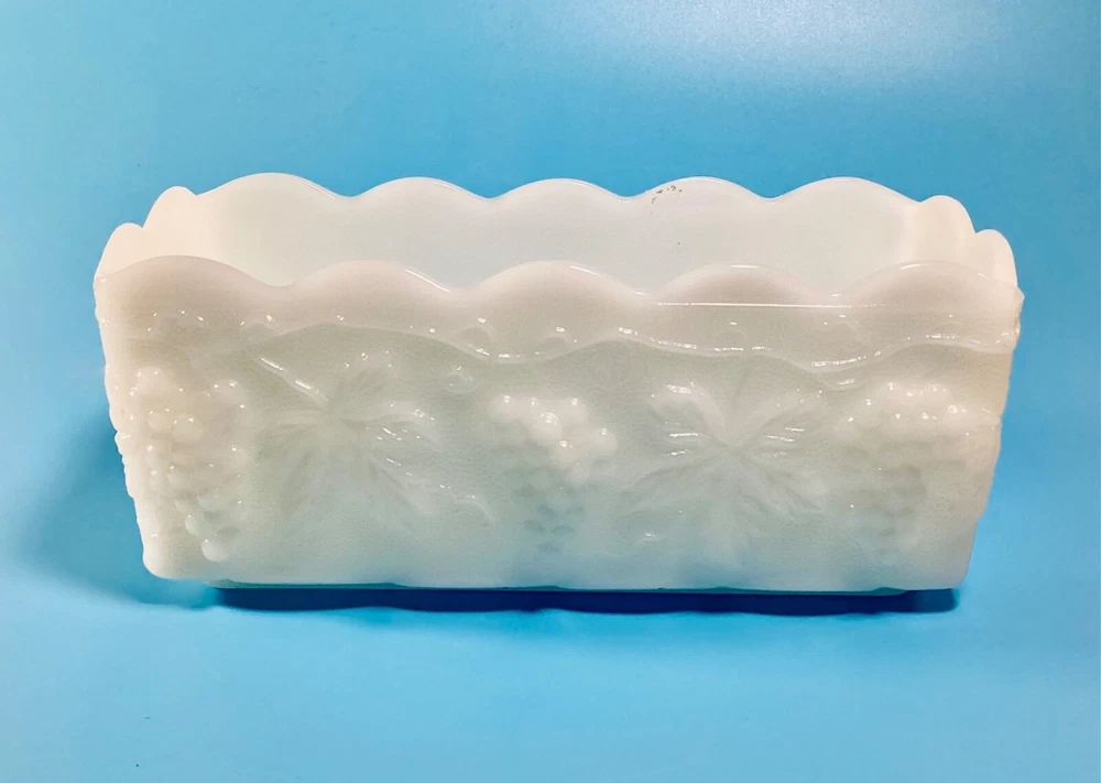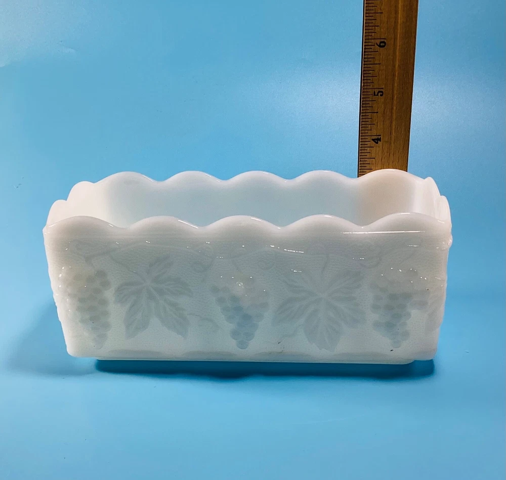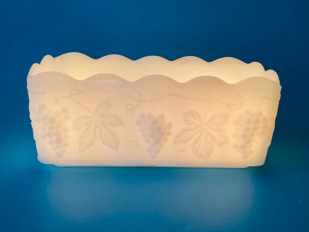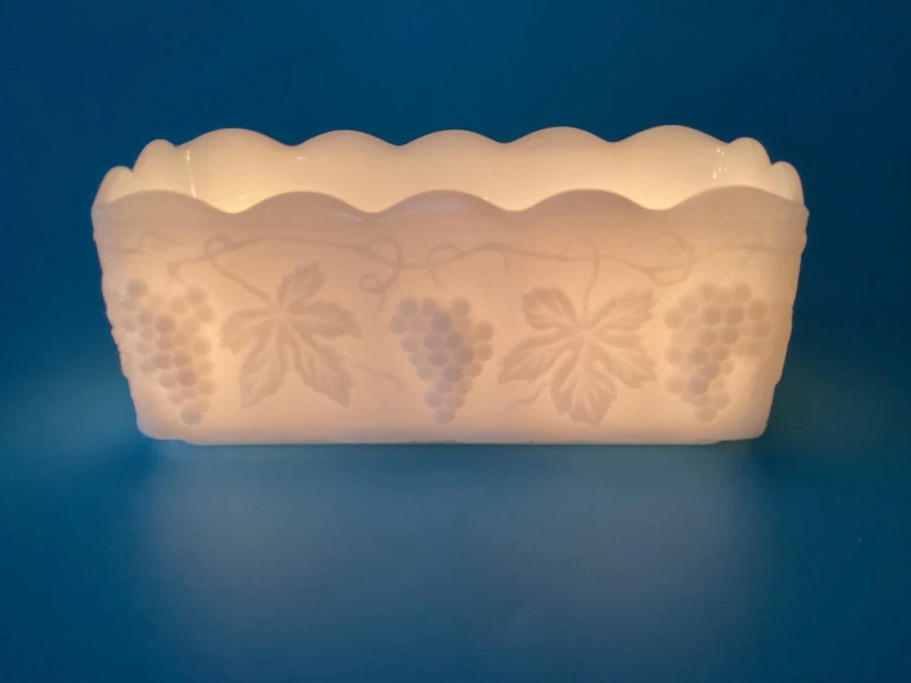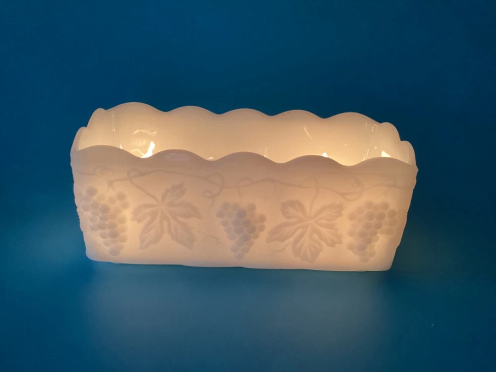 Anchor Hocking Fire King Ware USA Rectangle Milk Glass Planter Candle Holder is a stunning piece of mid-century modern decor. Milk glass production style gives it a glossy finish that complements the intricate Grapes & Leaves pattern. The item is signed by Fire King and the model is Anchor Hocking Fire King. It is suitable for flameless/LED candles, electric votive candles, and tea lights, making it a versatile addition to any room. The item is original and vintage, manufactured in the United States during the mid 20th century (1941-1969) and weighs 1lb 10oz. We kindly ask that you closely review the item descriptions, as well as photos. If unable to view photos, please contact us prior to check out. All items are researched and described to the best of our ability. We are passionate about finding new homes for antique and vintage items, but by no means experts. Any errors in descriptions are not intentional and NEVER intended to mislead a potential buyer. Photos will always reveal noticeable defects and considered as part of the description. Request Return to Seller within 5 days of receipt of your item and mailed back within 14 days of receipt. Item must be packed as it was received, photos of unpacking the item required for return. Buyer to pay return shipping to Seller, original shipping fee to Seller nonrefundable. All items are sold as is. Thank You for visiting our shop, please follow us so you are notified of new items that are added daily. **Non-smoking home.