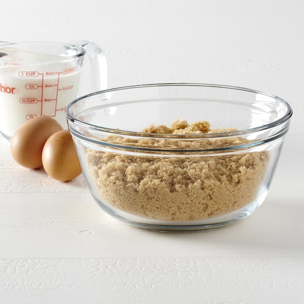 Anchor Hocking Glass Mixing Bowl, 1.5-Quart, Clear 1.5 Quart, Product Details Bowl Material: Glass Number of Pieces: 1 Brand: Anchor Hocking Color: Clear Style: Classic Special Feature: Durable Shape: Bowl Capacity: 1.5 Quarts Specific Uses For Product: Soup, Salad, Dessert, Cereal, Rice, Beans, Chili, Stews, Risotto, Casserole, Pho, Trifle, Puddings, Sauce, Dip Included Components: Glass Mixing Bowl Pattern: Solid Product Care Instructions: Dishwasher Safe Is Dishwasher Safe: Yes Is Microwaveable: Yes Material: Glass Product Dimensions: 7.25"W x 3.65"H Manufacturer: Anchor Hocking Size: 1.5 Quart Item Weight: 1.6 pounds Item model number: 77974 Is Discontinued By Manufacturer: No 1.5 Quart Capacity Durable Clear Glass Non-reactive with ingredients Dishwasher Safe Made by Anchor Hocking in the USA 1.5 Quart clear, glass mixing bowl from Anchor Hocking. Made of durable, clear glass. Mixing in glass assures no reaction with any ingredients like when using a metal bowl. Made in the USA.