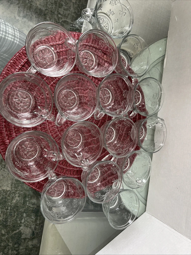 This is an Anchor Hocking Savannah Punch Set that includes 16 cups and 16 plastic hocks. The set features a mid-century modern style with a flower theme, made of pressed glass in clear color. It is an original vintage set from the United States, designed by Anchor Hocking. The cups and hocks are dishwasher safe and decorative, making them perfect for serving punch at gatherings. Open box , never used cups and plastic cups only
