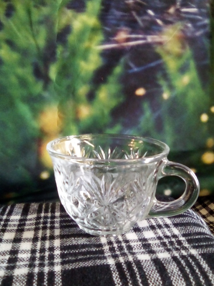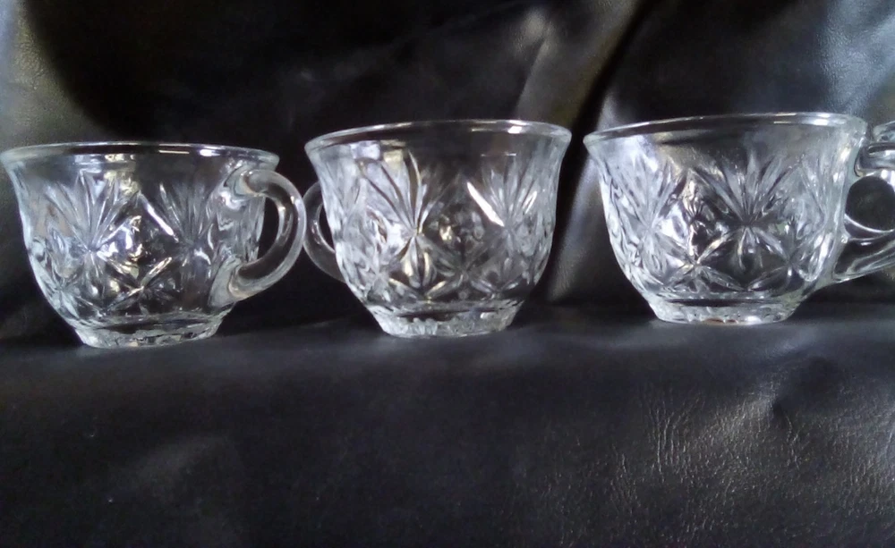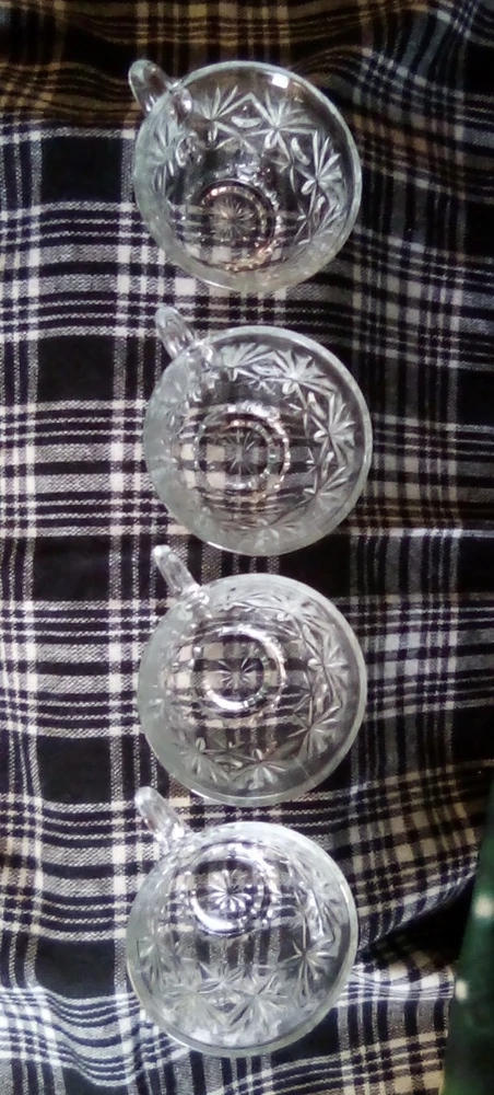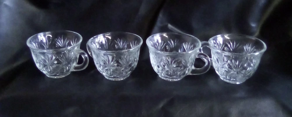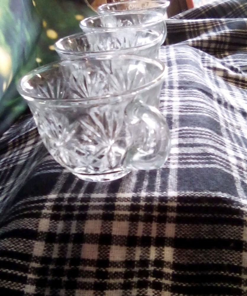 This product is a lot of four Anchor Hocking STAR OF DAVID punch cups made of clear glass with a starburst pattern. Each cup has a round shape, a 2-inch height, and a 3.5-inch width. These pressed glass cups are perfect for all occasions and can serve up to four people. The brand, Anchor Hocking, is known for its quality glassware, making these cups a stylish and practical addition to any kitchen or dining table.