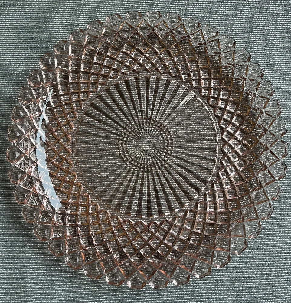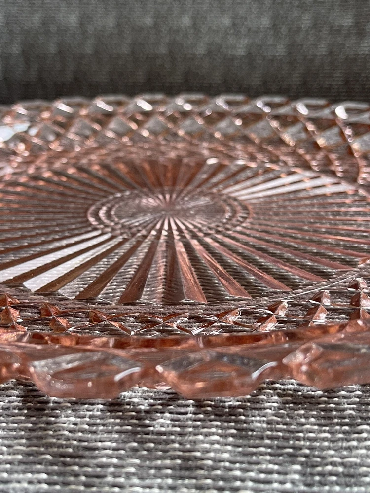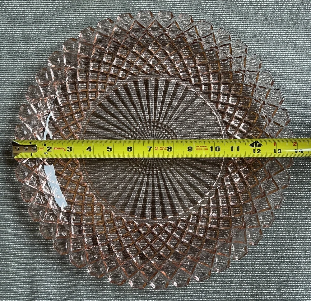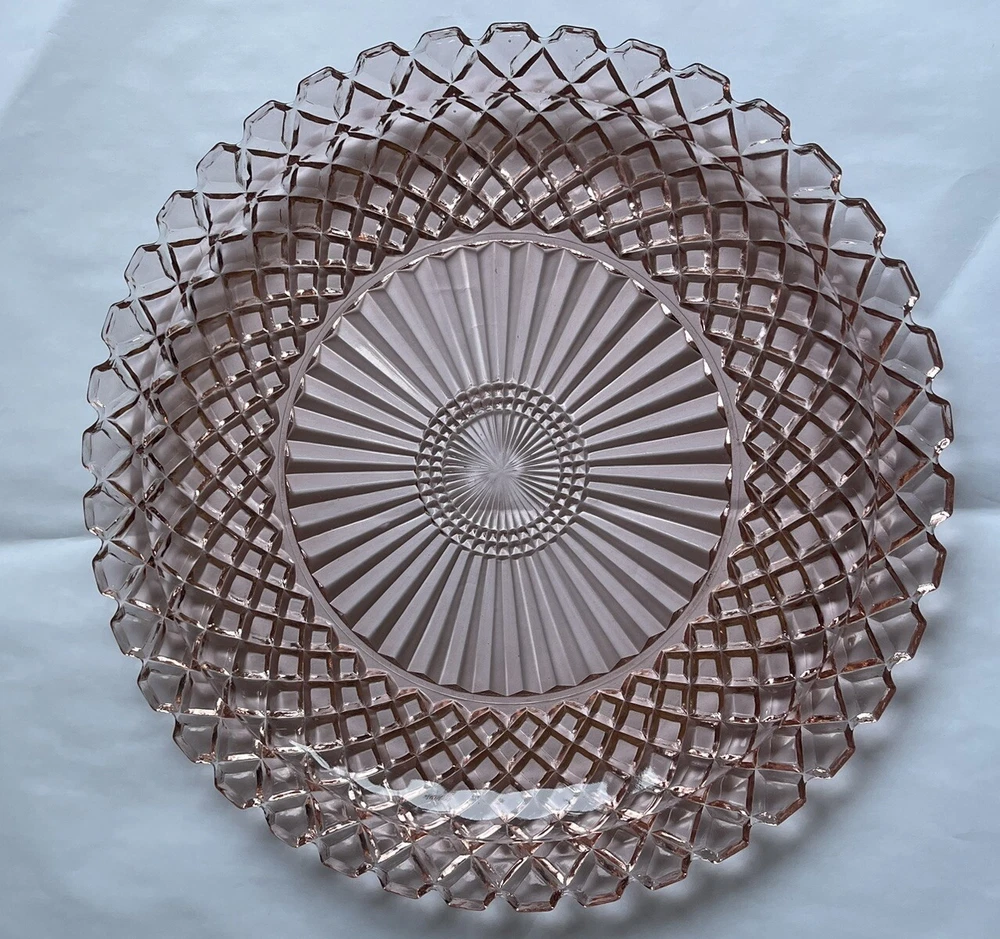 This beautiful 14-inch round cake plate is a stunning addition to any collection. The delicate pink Waterford/Waffle pattern is a true testament to the quality of Anchor Hocking's depression glass. This plate is perfect for all occasions and is sure to impress your guests. Crafted in the United States during the mid-century modern period, this licensed reproduction plate features a glossy finish and decorative design. While not an antique, it has the vintage charm of a bygone era and is sure to be a conversation starter. Add this plate to your collection of decorative cookware, dinnerware, and serveware today.