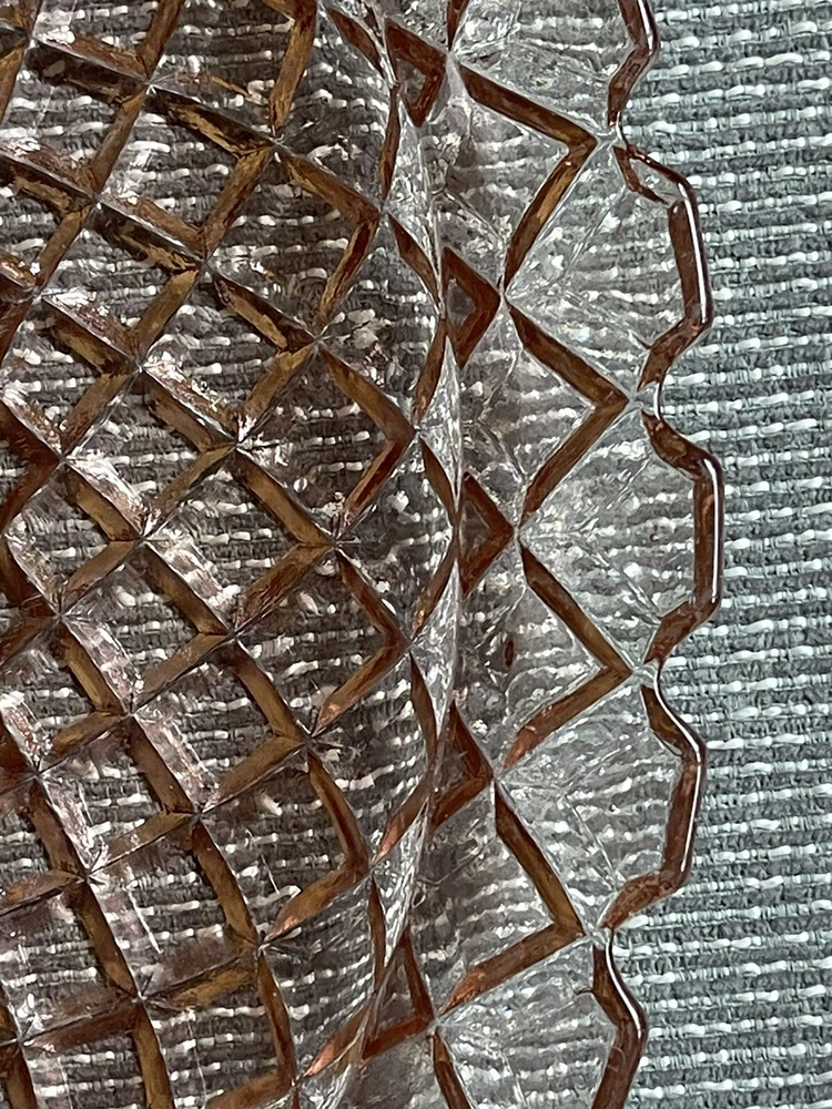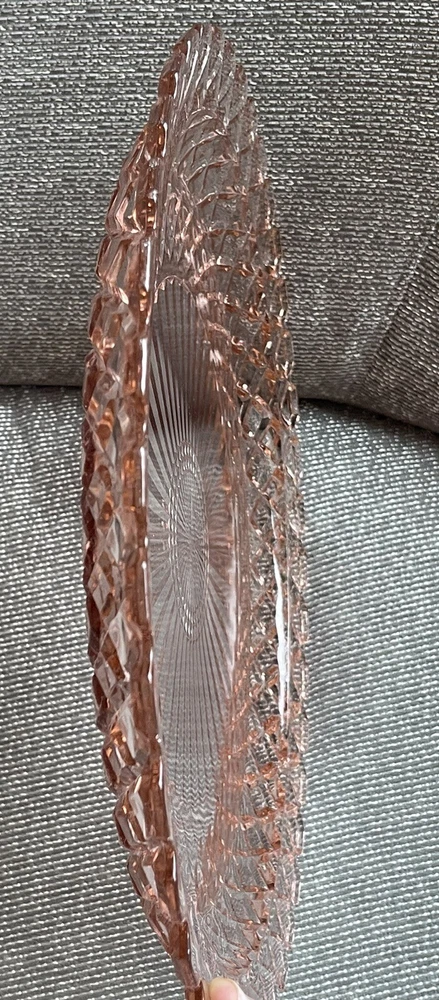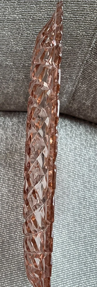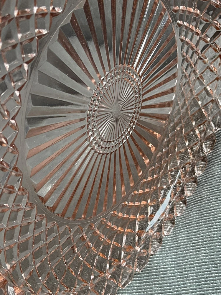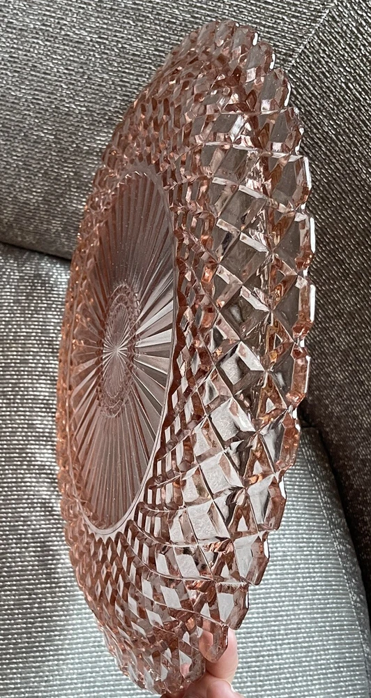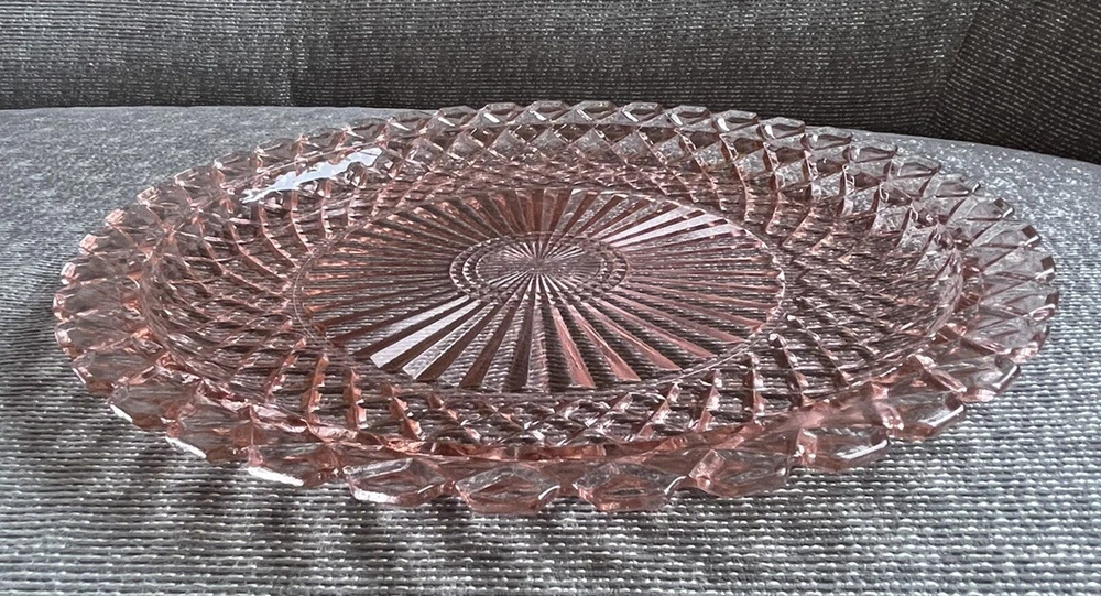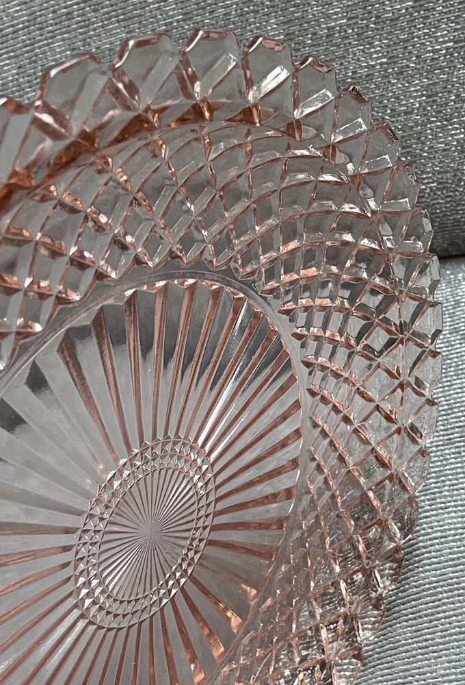 This beautiful 14-inch round cake plate is a stunning addition to any collection. The delicate pink Waterford/Waffle pattern is a true testament to the quality of Anchor Hocking's depression glass. This plate is perfect for all occasions and is sure to impress your guests. Crafted in the United States during the mid-century modern period, this licensed reproduction plate features a glossy finish and decorative design. While not an antique, it has the vintage charm of a bygone era and is sure to be a conversation starter. Add this plate to your collection of decorative cookware, dinnerware, and serveware today.