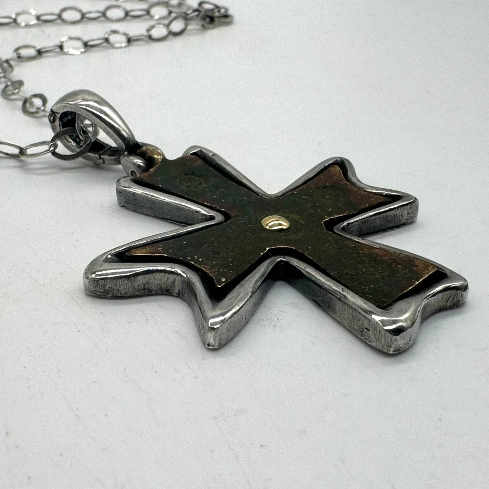 Ancient Byzantine Bronze Cross in Sterling Silver Setting & 20" Chain Ancient Byzantine Bronze Cross in Sterling Silver Setting & 20" Chain Byzantine Bronze Cross in Sterling Silver Setting & 20" Chain. The chain is a simple hammered oval link. The bale hinges on the cross and can actually open up to accommodate a larger chain or strain of beads. The cross in the bezel setting (not including the bale) measures 1.83" by 1.83". Marked 925 / 18k / Italy. The 18k is from the center nail which holds the cross into the sterling setting. SHIPPING: Shipping is First Class in the US. I will spring for the insurance! Most items are mailed within 24 hours of receiving payment. If you need expedited shipping, or Express shipping, please ask. Shipping is from 70767. Our aim is happy customers. We leave feedback for you; please do the same for us if you are happy with your item. If there is a problem, please contact us before leaving low feedback or low DSR's. We answer most email within 24 hours. We appreciate your business and want you for a repeat customer. Please save us a favorite seller and check back each week for new items. Listing and template services provided by inkFrog