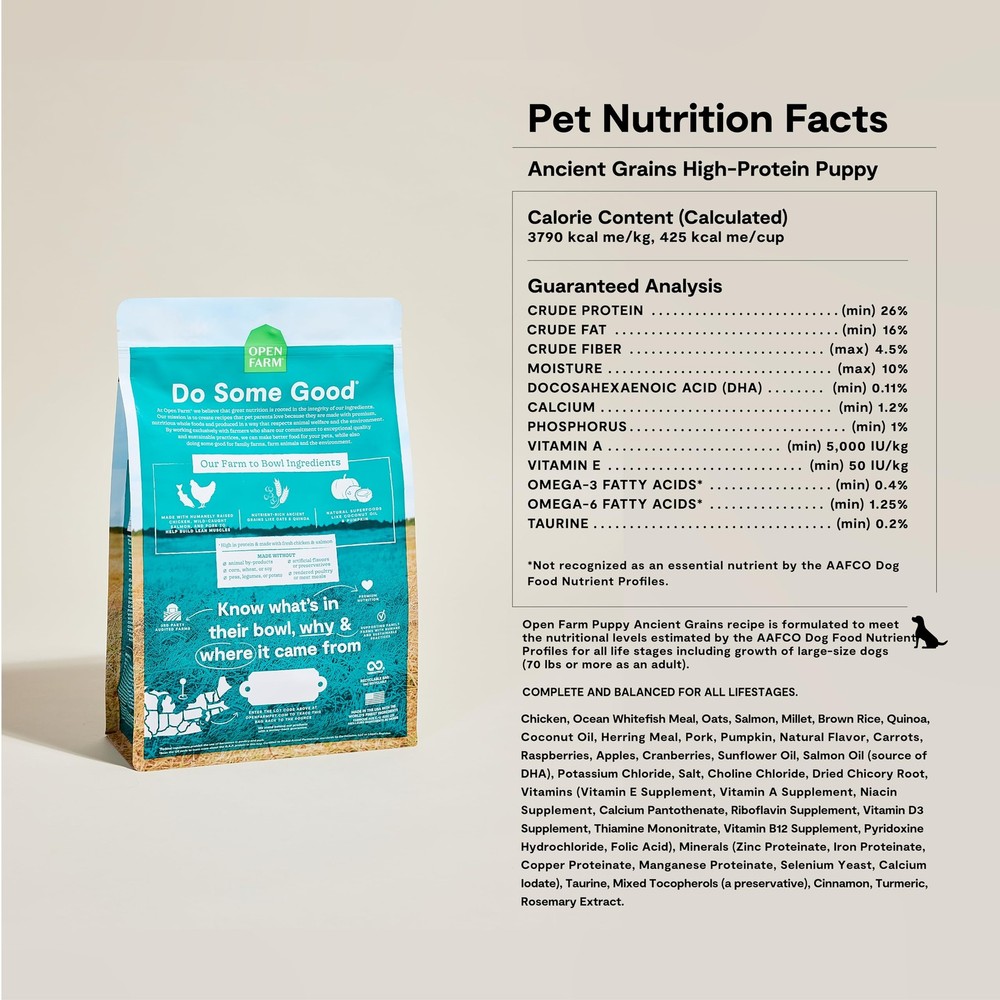 Bring a wholesome blend of nutrient-dense ancient grains to their bowl Give your puppy the wholesome nutrition they deserve with Ancient Grains Dry Dog Food. This thoughtfully crafted kibble is a protein-packed complete and balanced meal, featuring Ocean Wise recommended, wild-caught salmon and humanely-raised chicken. Nutrient-dense ancient grains combined with essential micro- and macronutrients and natural antioxidants to support a healthy immune system. Non-GMO fruits and veggies, and superfoods like pumpkin, quinoa, and coconut oil. Free of peas, potatoes, and legumes, this 100% traceable recipe is formulated for optimal nutrition. Heart-healthy and highly digestible Wholesome, unrefined ancient grains like the oats and quinoa in this recipe are rich in protein, fiber, vitamins, and minerals. Often recommended for less active dogs or as dry dog food for seniors, this dog kibble is great for sensitive stomachs or those with frequent loose stool, and legume and potato sensitivities. A healthy, grain-inclusive complete and balanced diet This protein-packed kibble is formulated specifically to help growing puppies thrive. This balanced dog food pairing of 90% animal protein mixed with ancient grains is the best of both worlds. Natural superfoods like pumpkin and coconut oil combine with essential vitamins and nutrients to create a balanced and optimal nutritional profile. Our ingredients pass the sniff test. - Ethically & Sustaibaly sourced proteins - Non-GMO pumpkin - Non-GMO oats - Coconut oil - Non-GMO quinoa - Non-GMO carrots Wholesome & Highly Digestible Ingredients - This high protein dog food blends ancient grains like oats and quinoa with real meat to make this recipe rich in protein, fiber, vitamins, and minerals. A Healthy, Grain-Inclusive, Complete & Balanced Diet - This wild-caught salmon & humanely-raised chicken dog food recipe also features non-GMO fruits and veggies, and superfoods like pumpkin, quinoa, and coconut oil. Recommended For Sensitive Stomachs - Unrefined ancient grains are often recommended for less active dogs or seniors, sensitive stomachs or those with legume and potato sensitivities. Made with Non-GMO Fruits & Veggies - Free of peas, potatoes, and legumes, this 100% traceable recipe has no artificial flavors, preservatives, or additives for optimal nutrition & peace of mind. Traceable and Transparent Ingredients - We use 3rd party certified ingredients, vetted and tested, and you can trace every single ingredient to its geographic origin