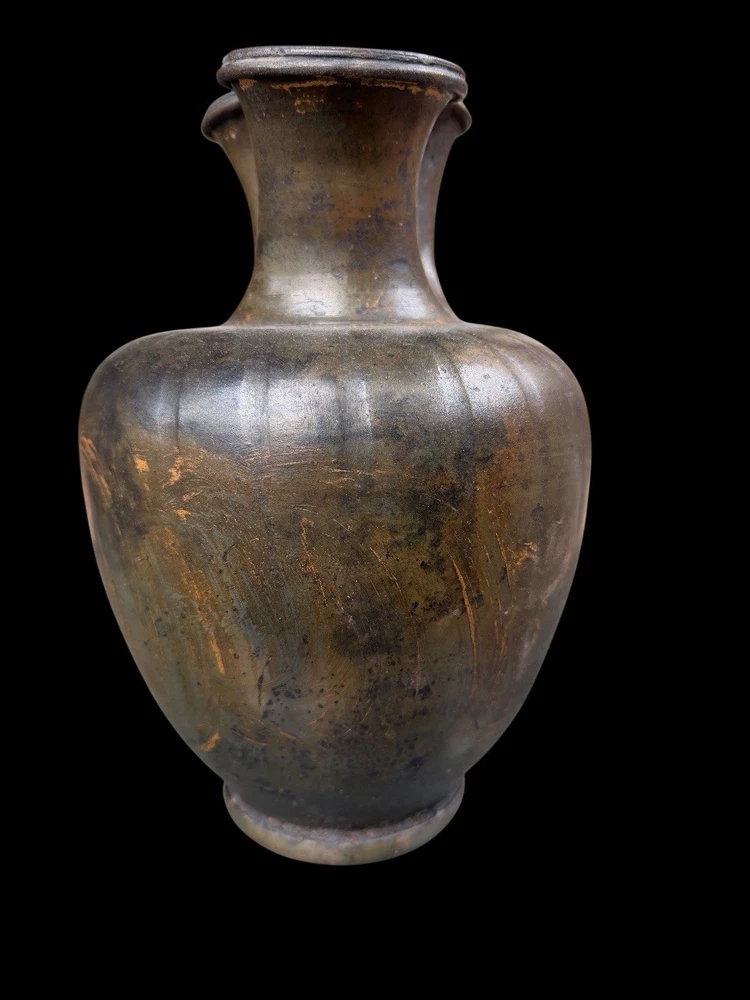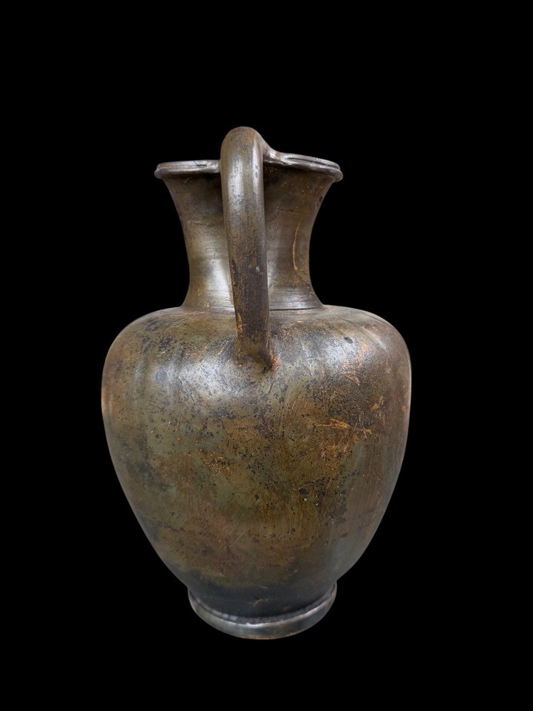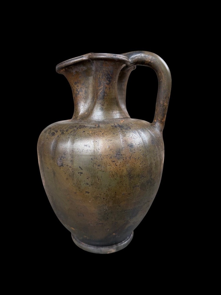 A GREEK BLACK-GLAZED TREFOIL OINOCHOE SOUTH ITALIAN, CIRCA LATE 4TH CENTURY B.C. The broad ovoid body dipping slightly at the shoulders toward the concave neck, a raised fillet at the join, the plain handle tapering toward the body, a reserved band above the foot Measures 25 cm x 16 cm Private ex collection Francé years 80