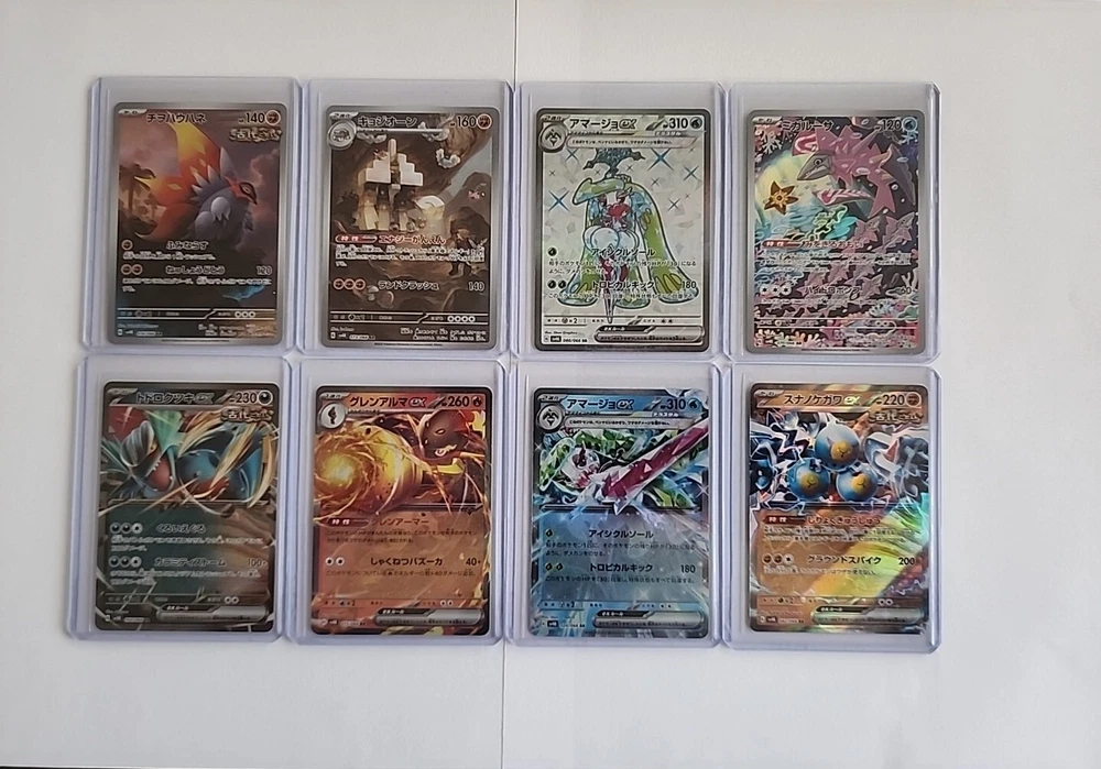U.S. Seller!!! Bundle Lot of 8 EX, SR, & AR Pokémon cards from the New Japanese set Ancient Roar. All cards were freshly pulled from packs, and each one was immediately put into a sleeve and top loader. All cards shown in the photos are the exact cards that you will receive. The cards are: Sandy Shocks ex, Roaring Moon ex, Tsareena ex, Armarouge ex, Tsareena ex SR, Veluza AR, Garganacl AR, and Slither Wing AR. The cards will be packaged with cardboard around the cards, bubble wrapped, and placed inside a bubble mailer. Please see photos for details and condition.