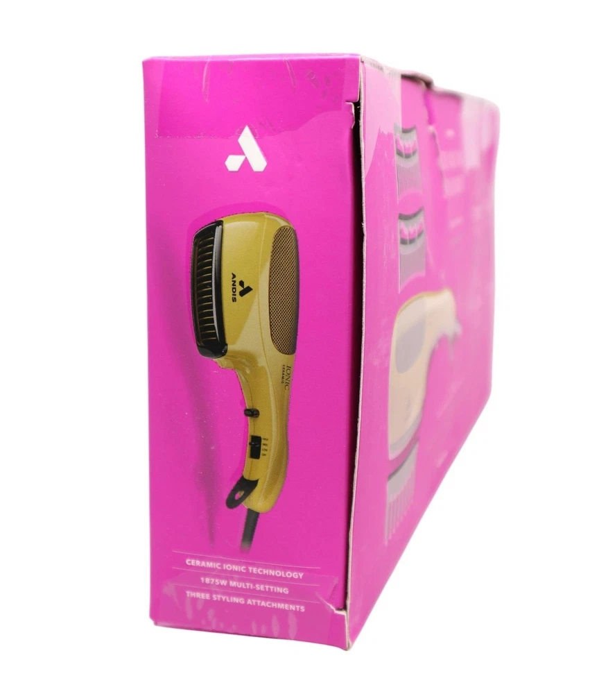 Andis At-Home 1875-Watt Ceramic Tourmaline Ionic Styling Hair Dryer Set - Gold The Andis styler 1875W ionic/ceramic dryer features 1875 watts of drying power. Ionic technology breaks up water molecules, resulting in quicker drying time, and the ceramic even-heat technology preserves natural oils and seals in moisture. It has a high velocity airflow with 3 air/heat settings, a cool-shot button that locks in style, turbo boost for high speed, and dual voltage for worldwide travel. Includes: soft-bristle attachment, wide tooth comb and fine tooth comb. Features NO FRIZZ & NO FUSS: Get rid of the frizz. Boost shine and manageability with the Frizz-Free 3-in-1 Hair Dryer, which uses sophisticated ionic technology to produce up to 50% more ions for improved manageability and frizz-free shine. STYLING CONTROL: 3 heat or 2-speed options to create your distinct sand style, and an old Shot button to keep your style in place. Includes 3 attachments for natural texture, body and shine, detangling, and a dual-row straightening comb for sleek, smooth styles. IONIC CONDITIONING: Natural ion output reduces frizz and enhances the natural luster of your hair. A concentrator nozzle is incorporated for concentrated airflow to smooth and sleek hair. LEADER IN HAIR DRYERS: Andis provides a wide range of hair dryers for every hair type and style, from conventional bonnets to high-tech dryers with cutting-edge technologies. Even-heat Ceramic technology preserves natural oils and seals in moisture - creating smooth, silky, frizz-free hair. 3 heat or speed settings for styling control. Details Product Dimensions: 11.25 x 2.13 x 3.5 inches Item Weight: 1.63 pounds Shipping Weight: 1.63 pounds Manufacturer: Andis Item color: Gold Item model number: 82125 Item MPN: 82125 Item part number: 82125 Fast & Free Shipping Orders are shipped out within 2-3 business days usually and delivered to your doorstep as quickly as possible. Competitive Pricing Our competitive prices are some of the lowest that you will find on the internet. Rest assured that you're getting a good deal when purchasing from us. 30-day Money Back Guarantee We are committed to making sure that you leave this transaction satisfied. If you're unhappy with the product for any reason, you may return it back for your money-back or a replacement if available within 30 days.