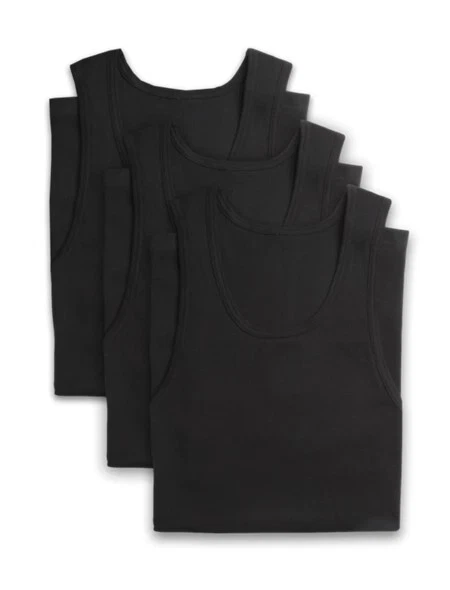 This Andrew Scott men's A-shirt pack includes three solid black cotton shirts in size 5XL. The shirts feature a sleeveless design with a round neckline and are perfect for big and tall men. They are machine washable and have a breathable fit, making them ideal for athletic activities. The brand is based in Bangladesh and is not vintage. The shirt pack is categorized under clothing, shoes, and accessories for men.