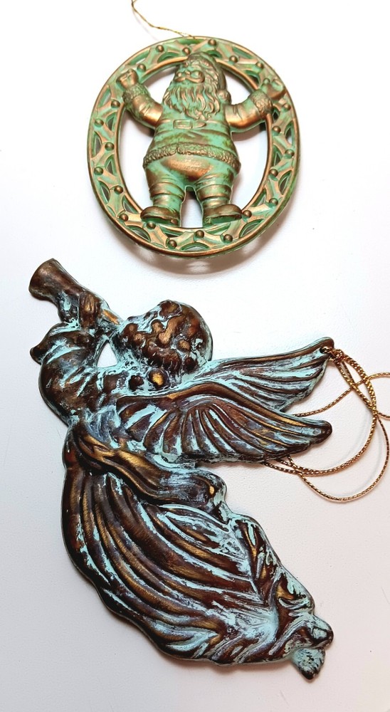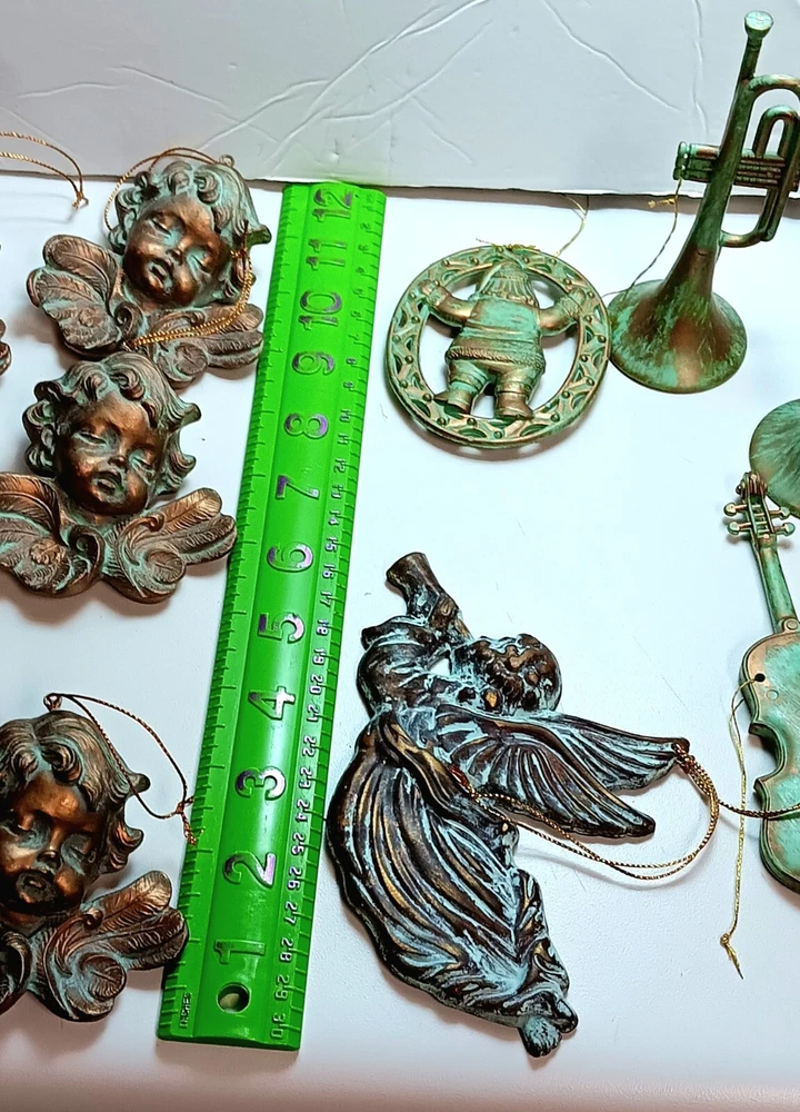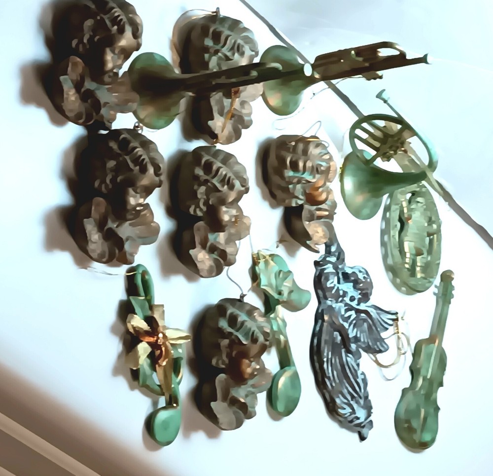 Angel Cherubs Musical 14 Piece Christmas Ornaments Plastic Antique Green Gold Finish. Gently pre-loved great condition. The lot consists of 6 resin/plastic 4"-6" Cherubs, one 6" metal angel blowing trumpet (Taiwan), 4 musical plastic/resin 4-6" instruments, 2 musical plastic/resin 4" notes, and one 3.5" Santa. See photos.