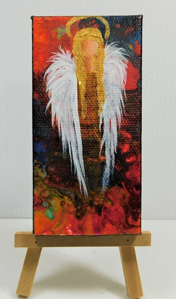 This is a colorful painting by Rain Crow featuring a guardian angel watching over humanity to bring passion for our life goals. Display as is on a mini easel or add a frame to make it seem larger. It is mini art and can be used as a way to introduce your child to the art World. Use in doll houses or as desk or bedside decor. Easel in photos not included. 4" x 2" x 3/8" Title: Angel of Passion Canvas Signed on back Varnished. Please ask questions before purchase. Note: The photos are zoomed in to provide details. They may appear extremely large in the photos. Please see actual size above. COMBINED SHIPPING is available automatically at checkout. I cannot hold items after you pay. ALL items must be paid for at the same time. ANG-2x4-3/8-4