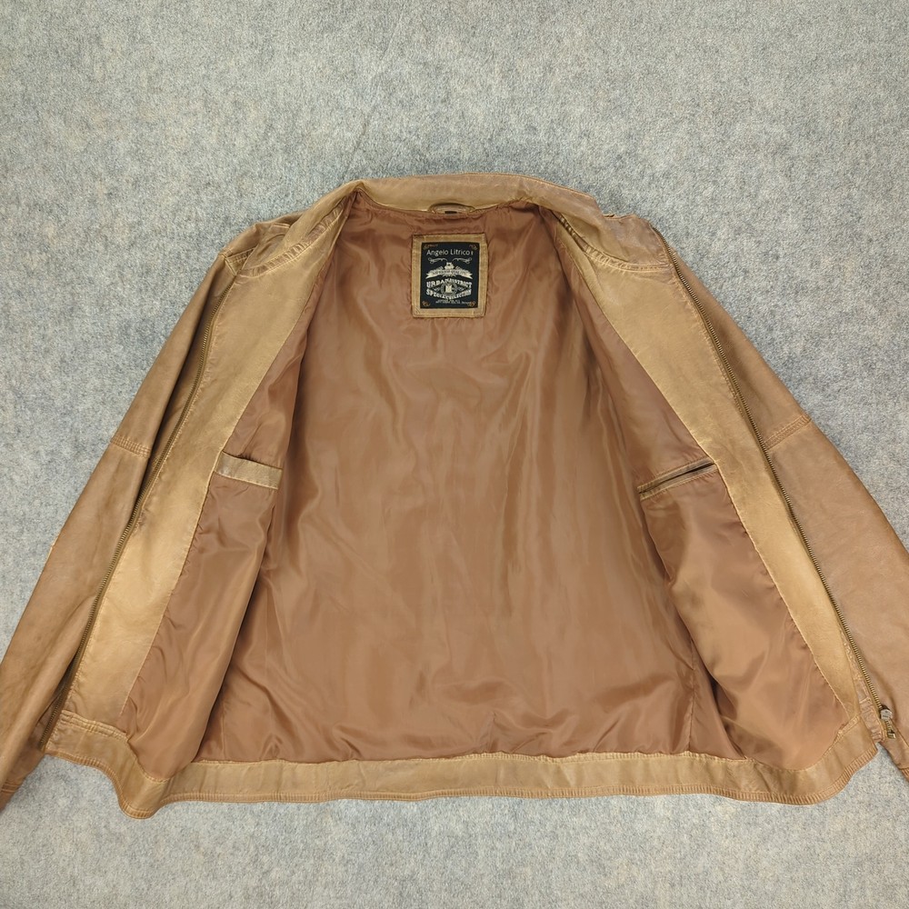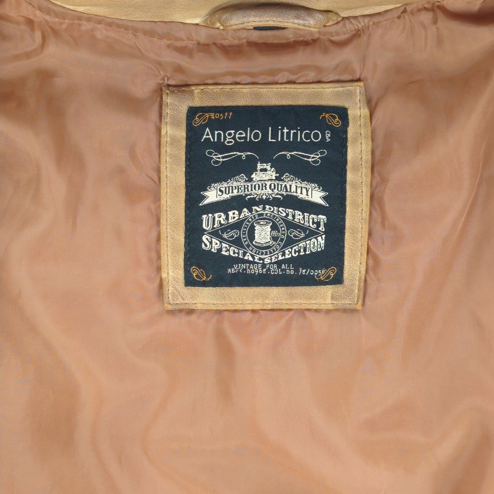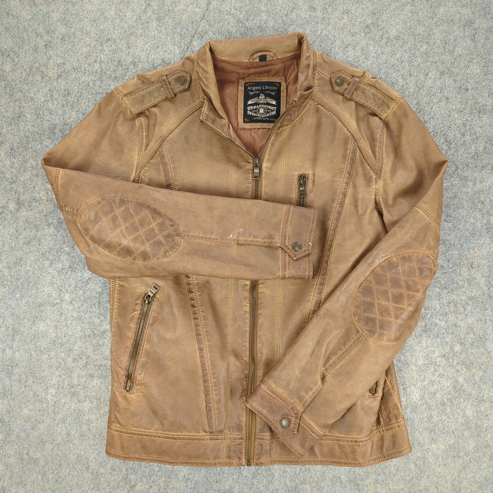 Angelo Litrico Jacket Mens Medium Brown Leather Urban District Biker Retro Style Condition: Good used condition with light overall wear, some light marks on sleeves, and minor signs of use throughout—no major flaws. Please see photos for details. Shell: Genuine leather exterior with a soft brown finish, showing natural patina and vintage-inspired wear Lining: Smooth brown polyester interior with inside chest and side pockets Features quilted oval elbow patches for extra durability and style Epaulet details at shoulders, three front zippered pockets, front zip closure, and side waist adjusters Brand: Angelo Litrico, "Urban District Special Selection Superior Quality" collection (see label for details) Approximate tag size: Medium (Mens) Measurements (for reference only, see photos for exact visualization): - Chest (pit to pit): About 21 inches - Back length (collar seam to hem): About 27.5 inches - Sleeve length (shoulder to cuff): About 25 inches Classic retro moto/biker style perfect for casual or urban wear Color: Brown leather with matching brown lining