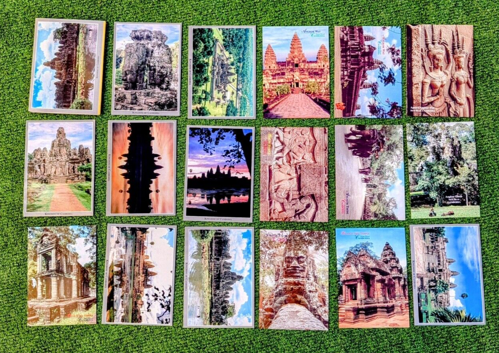 New-old-stock, mint condition, and unused. 17 glossy postcards featuring professionally photographed images 8 postcards from the Kingdom of Cambodia series featuring Angkor Wat and other Cambodian temples and architectural wonders. 9 postcards pictures from the Siem Reap Cambodia series featuring Angkor Thom and more. 5LS
