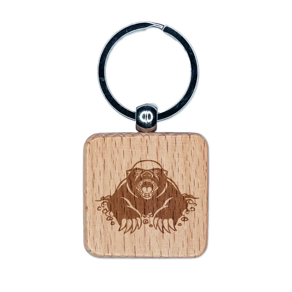 Angry Honey Badger Engraved Wood Square Keychain Tag Charm