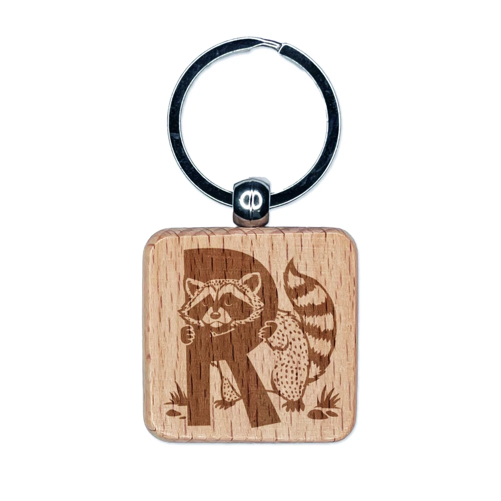 Animal Alphabet Letter R for Raccoon Engraved Wood Square Keychain Tag Charm
