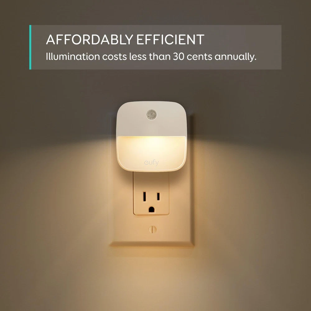 eufy by Anker, Plug-in Night Light, Warm White LED, 4-pack, Product Details Base Material: Plastic Product Dimensions: 2.4"D x 2.4"W x 1.7"H Item Weight: 0.31 Pounds Lamp Type: Night Light Shade Color: Warm White Shade Material: Plastic Switch Type: Touch Style: 4-Pack Brand: eufy Color: White Special Feature: Dawn-To-Dusk Light Source Type: LED Material: Plastic Room Type: Kitchen, Bedroom Power Source: plug-in_electric Shape: Lustre Controller Type: Remote Control Number of Light Sources: 1 Connectivity Technology: USB Included Components: light night Bulb Shape Size: B10 Mounting Type: Plug in Number of Items: 4 Lighting Method: Up/Down Light Control Method: Touch Water Resistance Level: Not Water Resistant Installation Type: Plug In,Countertop,Tabletop Number of Pieces: 4 Efficiency: high Voltage: 110 Volts Is Cordless?: No Size: 4-pack Manufacturer: eufy Item Weight: 5 ounces Item model number: AK-T1303121 Is Discontinued By Manufacturer: No Maximum Compatible Wattage: 0.4 Watts Special Features: Dawn-To-Dusk Batteries Included?: No Batteries Required?: No Wattage: 9 Watts Is Discontinued By Manufacturer : No Product Dimensions : 2.4 x 2.4 x 1.7 inches; 4.96 ounces Item model number : AK-T1303121 Manufacturer : eufy Base Material: Plastic Product Dimensions: 2.4"D x 2.4"W x 1.7"H Item Weight: 0.31 Pounds Lamp Type: Night Light Shade Color: Warm White IDEAL LIGHTING: Provides the right amount of glare-free lighting to guide you in the dark. AUTOMATIC ILLUMINATION: Automatically turns on only when ambient lighting becomes insufficient. ENERGY EFFICIENT: Requires less than 30 cents a year to operate. Based on 12 hours of usage per day and 0.11/kWh. COMPACT SIZE: Does not obstruct the second outlet. Plug-In Night Light The Compact And Automatic Night Light From eufy, the brand that lights up your life • Delightful solutions that make your house a home • Smart technology and innovative design that make your life easier • Created by the same team as Anker—renowned for exceptional quality and innovation Extremely Economical To conserve energy, the built-in light sensor only activates illumination when it is dark. eufy Plug-In Night Light requires less than 0.30 cents a year to operate. Ideal Low-Light Lighting eufy Plug-In Night Light emits just the right amount of illumination to guide without dazzling. Nighttime navigation to the bathroom or kitchen has never been easier. Fire-Resistant Material eufy Plug-In Night Light uses UL V0-certified plastic to deter fires for absolute peace-of-mind. Inconspicuous Design Ivory color blends into outlets while the compact size keeps the second outlet free. The curved backplate adds to the svelte design while producing an even light. Note: Based on 12 hours of usage per day and 0.11¢/kWh.