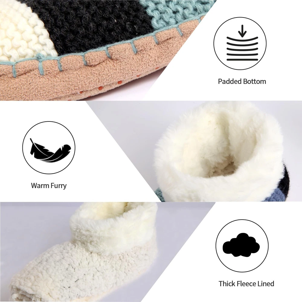 1 Warm, Fleece Lined - Our ankle knit slipper socks is fleece lined inside. These slipper socks for women provide optimal warmth and cozy comfort with the soft, plush fleece lining on the inside, perfect for winter or cooler months, making staying indoors a more enjoyable experience. They are warm and breathable. 2 Low Cut, Easy Put On- The low cut design of these women's slipper socks allows easy put on and take off, ensuring comfort without creating pressure around your ankles. They stay in place, do not slide down and keep your feet warm around the ankles. 3 Soft, Non Slip Bottoms - Designed with your safety in mind, these slipper socks feature non-slip silicone grip dots on the bottom, ensuring stable and slip-free movement on wooden or tiled floors. Don't make a "shlepping" sound when you walk, insulate your feet well from cold floors. 4 Cozy, Light Weight - Despite their warm lining, these slipper socks are lightweight, making them perfect for everyday use. They feel like stepping into a fluffy cloud, providing the ultimate comfort for your feet. A must have for cold feet on a cold winters day. Enjoy the fuzziness of the inner sock. 5 Nice Winter Present - These fuzzy women's slipper socks make a great winter present. Their warmth, comfort, and style make them a fantastic choice for birthdays, Christmas, and other holiday Great for around the house home.