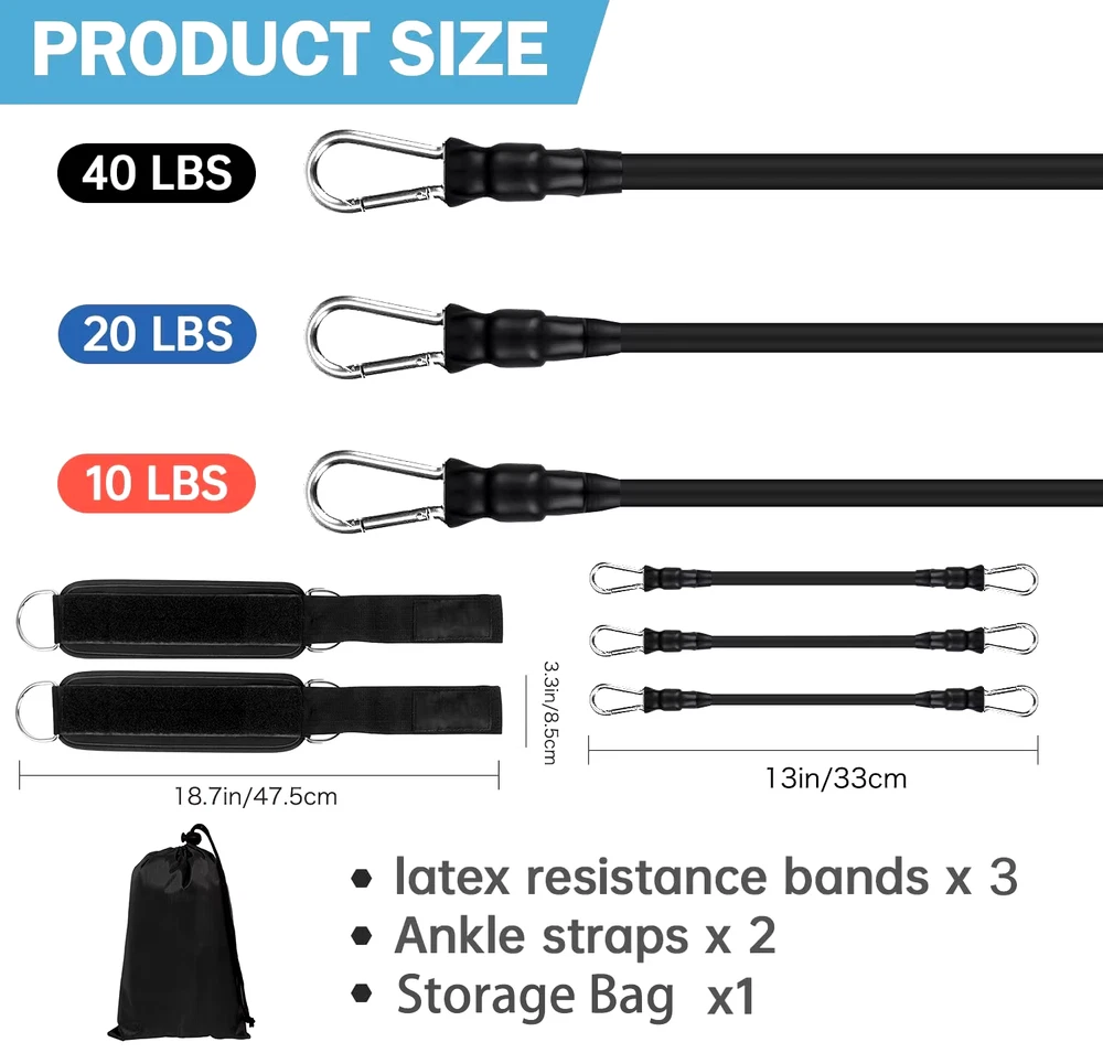 【3 Different Levels】 - 3 exercise bands, provide you with 3 level of resistance bands, 10/20/30 lb let you match. Adjustable design System can adapt to different people to exercise, training for 15 minutes every day, Get a bikini booty and ripped abs and be the envy of your friends at your next pool party. 【MULTIFUNCTION WORKOUT SYSTEM】 - Versatile exercise trainer designed for legs and buttocks, all in one design, can be used as Hip resistance bands, Ankle resistance training, Leg exercise band, Jump Trainer, Speed Training and so on. bring you health and beauty, great gift for friends and family. 【PERFECT DESIGN】 -Ankle Strap has a 100% high quality sponge, making it the most comfortable and Safety ankle cuff on the market. Neoprene ankle pad give you comfortable touch throughout full workout.Double D-ring secure band very well, More peace of mind for your legs and glutes training. 【GET NEXT LEVEL WORKOUT】 - By bring your workout to the next level with new Ankle resistance bands exercises, let you not only have sexy buttocks, and also get the strong strength legs. If you are a person who likes fitness, body sculpting, or a running, football, basketball, rugby player, we believe you will like it very much the ankle resistance bands with cuffs. 【PERSONAL HOME GYM】 - This ankle resistance band set includes 3pieces Tube bands, 1pair ankle Straps and mesh carrying case to allow you to perform the widest variety of resistance training exercises possible at home.You can also take your bands to Gym, Office, and even workout on vacation!