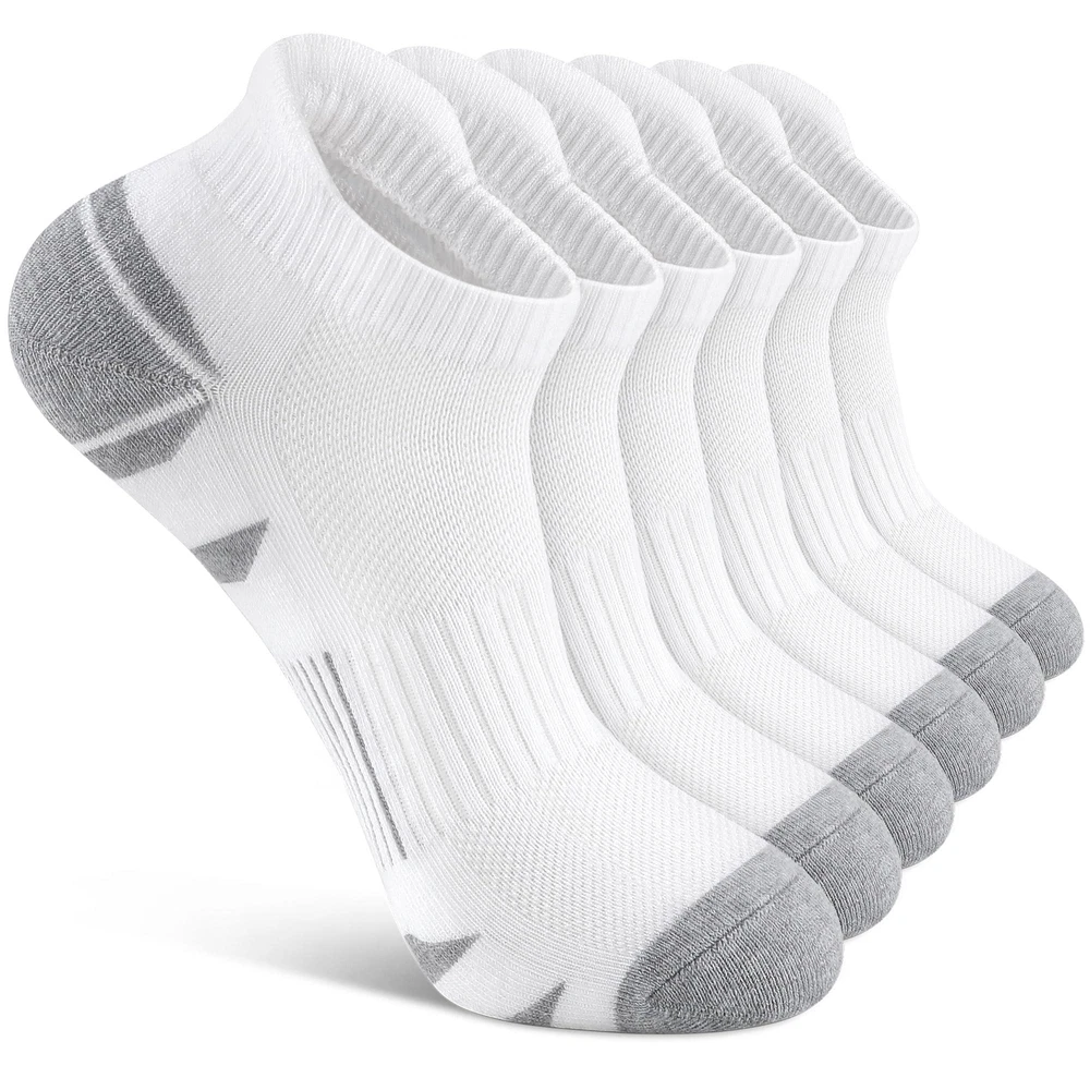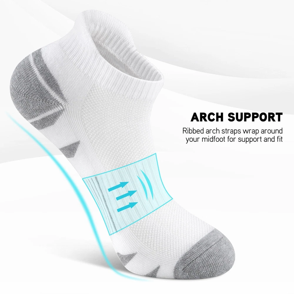 【Breathable & Soft】The upper mesh part of the athletic socks adopt advanced weaving technology, sweat-absorbent and breathable, release the heat and keep your feet dry and cool. The men's ankle socks are in great stretch and high quality, providing a great help to relax your feet. 【Comfortable & Cushioned】Our athletic cushioned socks adopt a seamless toe design, from toe to heel are padded with thick yarn to reduce the impact of friction and prevent foaming when moving. Full thick cushion padding in low cut ankle socks can reduce impact for a great comfort. 【No Slipping Off & Support】The elastic band holds the men ankle socks tightly around your ankle, keep the socks in position of your shoes. And proper compression in arch fits the individual shape of your foot, increase stability for a perfect fit when you exercise. Perfect sport socks for your running shoes, tennis shoes, or other sports shoes. 【Men Women Ankle Socks】ankle socks are designed for daily comfort wear, featuring a soft and cozy texture that makes them perfect for exercise. Low cut design could almost be hidden inside many shoes. Ideal performance socks for hiking, walking, running, camping, mountaineering, traveling. 【3 Sizes to Choose】We offer low cut ankle socks a choice of 3 sizes from M to XL in Black White Gray, meet the demands of you as well as your family and your friends.