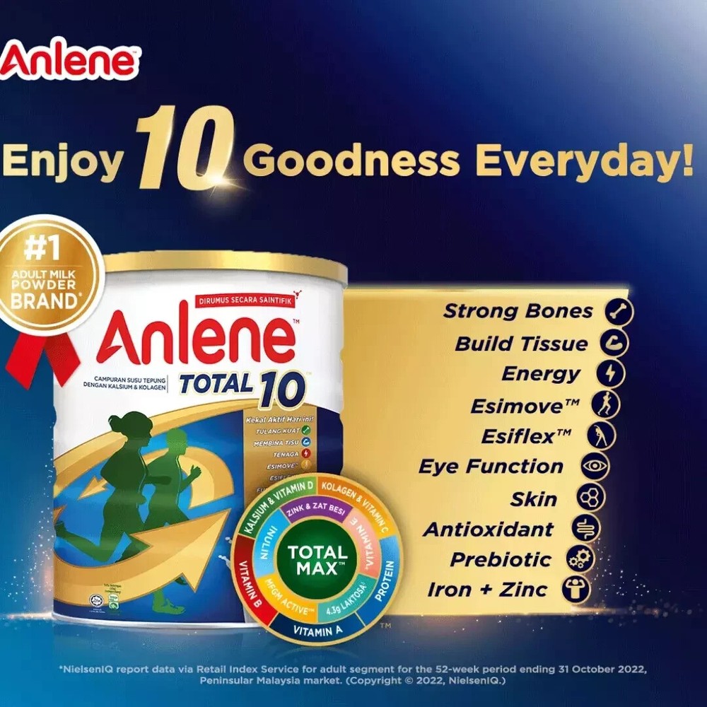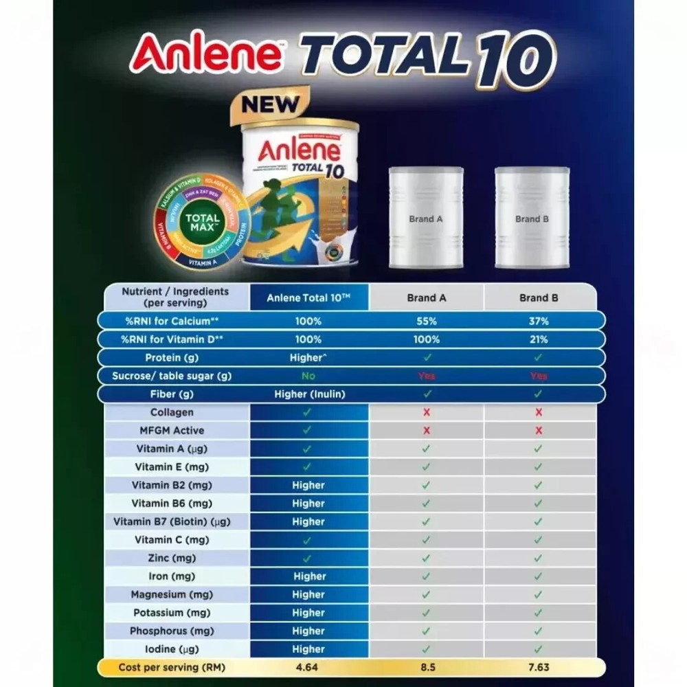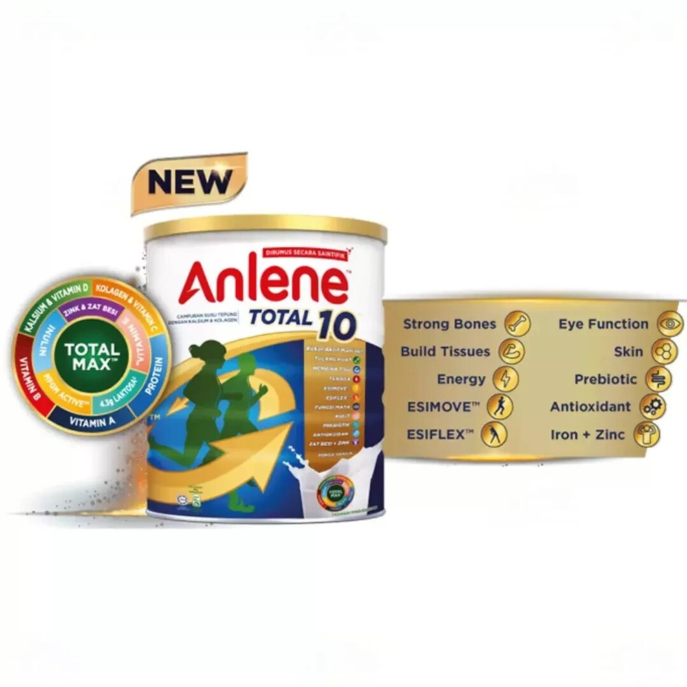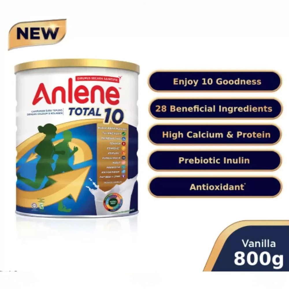 1 X Anlene Total 10 High Calcium & Collagen Adult Milk Powder 800g Ensuring our diet is always balanced may be difficult and as we age, our body becomes less efficient in absorbing some nutrients. Hence, it's crucial to make smart choices when it comes to food selection. Get the important nutrients every day to help maintain an active and meaningful lifestyle, even as we age. Anlene Total 10 is scientifically formulated with 28 beneficial nutrients & ingredients, including high calcium, high protein, MFGM Active, Collagen, Prebiotic, and lower lactose. Enjoy the 10 goodness every day. Support your overall wellness with balanced diet and active lifestyle today! Compared to regular milk. Anlene Total 10 only contains 4.3g lactose in each 200ml serving. Regular milk contains 8.6g lactose per 200ml serving. New Zealand Food Composition Database Reference. Direction for Use: Add 5 tablespoons (55g) of milk powder to 1 glass (200ml) of warm water and stir. Drink 2 glasses in a day. Ingredients: Maltodextrin, Cow's Milk Solids (Whole Milk Powder, Milk Protein Concentrate, Whey Protein Isolate & Buttermilk Powder^), Inulin, Minerals (Calcium Carbonate, Potassium Citrate, Magnesium phosphate, Potassium Chloride, Ferric Pyrophosphate, Magnesium Oxide, Zinc Oxide, Copper Sulphate, Manganese Sulfate, Sodium Molybdate, Sodium Selenite, Potassium Iodide, Chromium Chloride), Creamer Powder (Plant), Soy Protein Powder, Vitamins (Choline Bitatrate, Sodium ascorbate, Vitamin E acetate, Niacinamide, Biotin, Vitamin D3, Vitamin A acetate, Pyridoxine hydrochloride, Calcium pantothenate, Thiamine Mononitrate, Riboflavin, Vitamin B12, Folic acid, Vitamin K), Flavourings, Fish Collagen (0.2%), Emulsifier (INS 322, Soy lecithin). ^Source for Milk Fat Globule Membrane (MFGM). Phospholipid is a main component in MFGM PAYMENT We only accept payment via PayPal/Google Pay/VISA/Master Card. SHIPPING Please make sure you have read and understand all shipping information before you bid our items: · Please make sure your postal address is correct! · All item will be shipped within 4 business days , after receiving the full payment. The items shipped from Malaysia using Standard international postage and it normally take within 10-14 working days to deliver. · Express Shipping from Aboard with Full Tracking. Normally it takes 5-10 working days for delivery on all international order. If your item does not arrive within the time frame, please contact us via eBay message. · Standard Shipping from Abroad with Full Tracking. Normally it takes 10-14 working days for delivery on all international order. If your item does not arrive within the time frame, please contact us via eBay message. · Proof of shipment will be kept for future reference. · Your item will be packed up properly to avoid any damages. · To ensure a smooth delivery/transaction, please make sure your shipping address is verified and correct (which is associated with your PayPal account). We are not responsible for invalid addresses. Worldwide shipping available. CUSTOMS · Not responsible for your country’s customs. Please check with your country’s customs before you buy. · All the customs fee & taxes will be on the buyer’s responsibility. · Also allow some time for your country’s customs clearance time, because the delays usually come from Customs. · Seller are not responsible for item lost, but seller always keeps the proof of delivery. FEEDBACK We are always working hard for maintain high standards ***** of excellence and strive for 100% customer satisfaction. So your positive feedback is very important. If you have any problem with items received such as not as described or damaged, please message us. For any cases that you consider about the neutral and negative feedback, please contact our customer services executive for assistance. We will resolve your concern at your earliest convenience . We greatly appreciate your POSITIVE feedback . Please do NOT leave negative feedback without asking for help. Welcome you back to our store again.