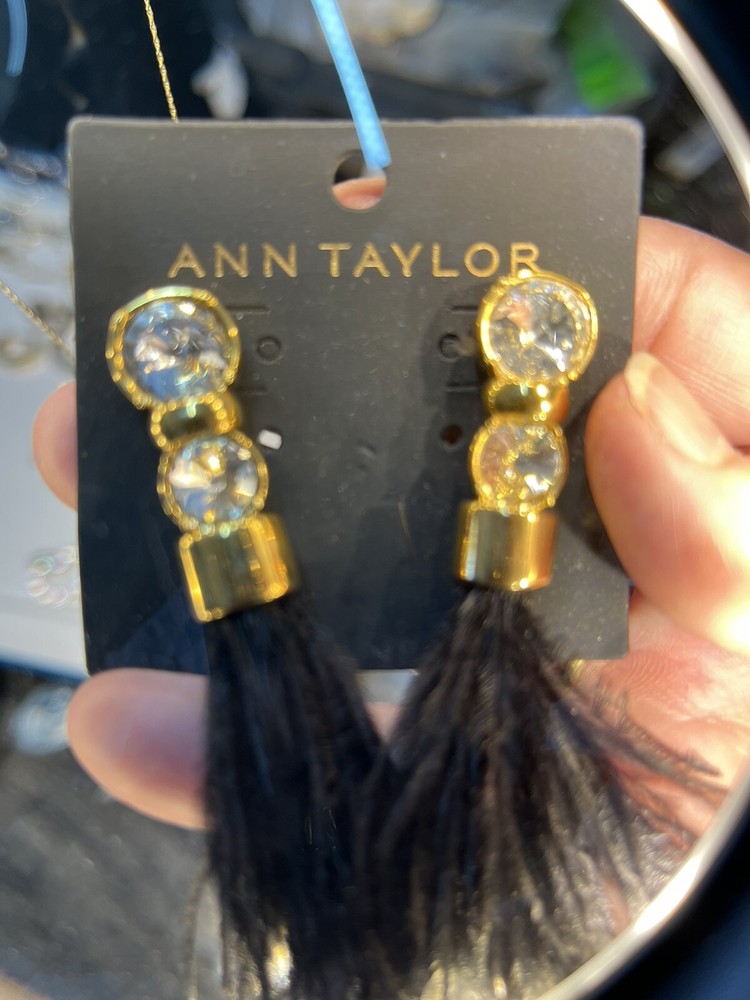 Add a touch of elegance to your outfit with these stunning Ann Taylor earrings. The pavé setting style and crystal with feathers make them a perfect accessory for any occasion. The goldtone base metal and threader closure add a touch of sophistication to the design. The drop/dangle style and clear crystal main stone color make them a statement piece that will complement any outfit. The earrings are perfect for those who value beauty and quality.