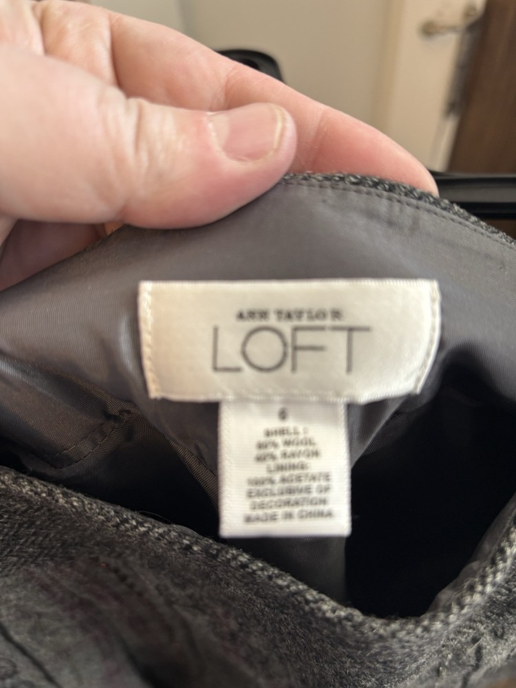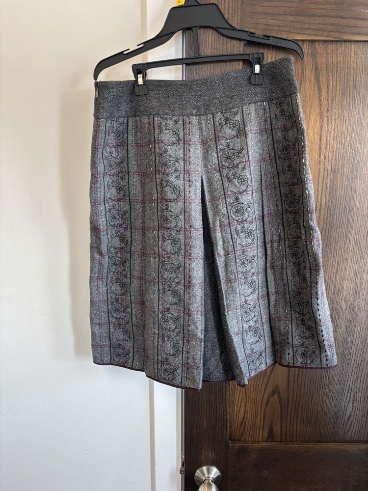 This size 6 Ann Taylor LOFT skirt is a stylish and elegant piece suitable for various occasions like travel, casual outings, formal events, or business settings. The gray A-line skirt is made of a high-quality blend of wool and rayon in a tweed fabric, featuring pleats, beaded accents, and intricate embroidery for a designer touch. It is knee-length and lined, perfect for the winter, fall, and spring seasons. This classic and sophisticated skirt exudes an American city-chic vibe, making it a versatile addition to any woman's wardrobe.