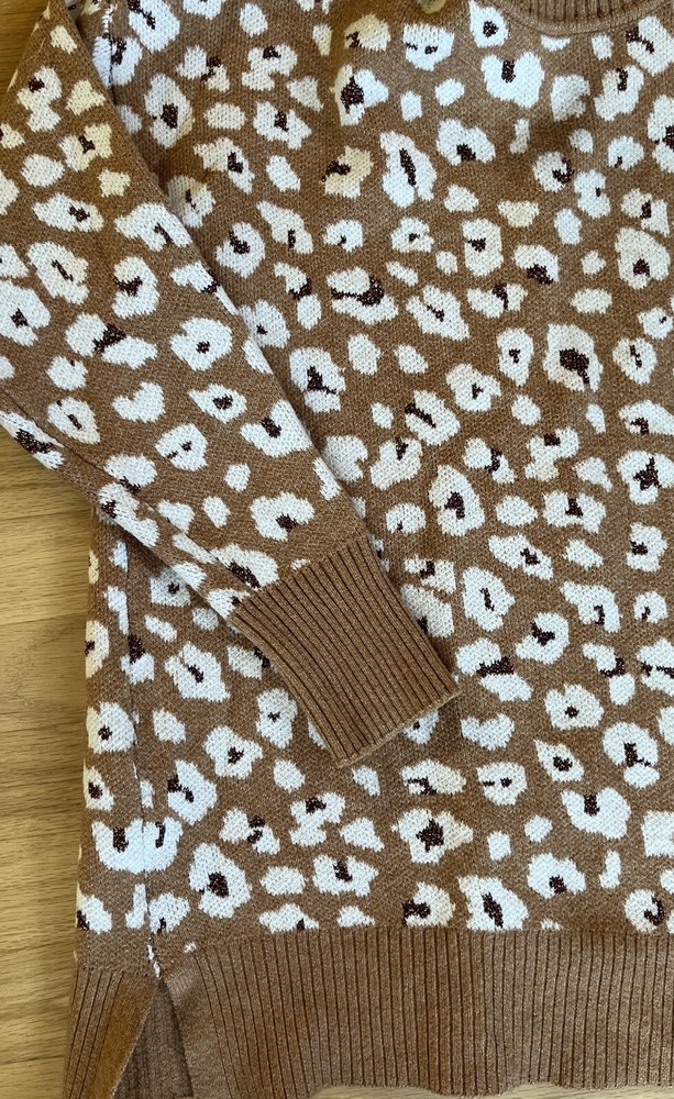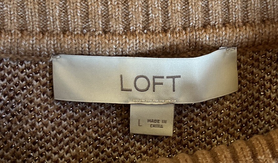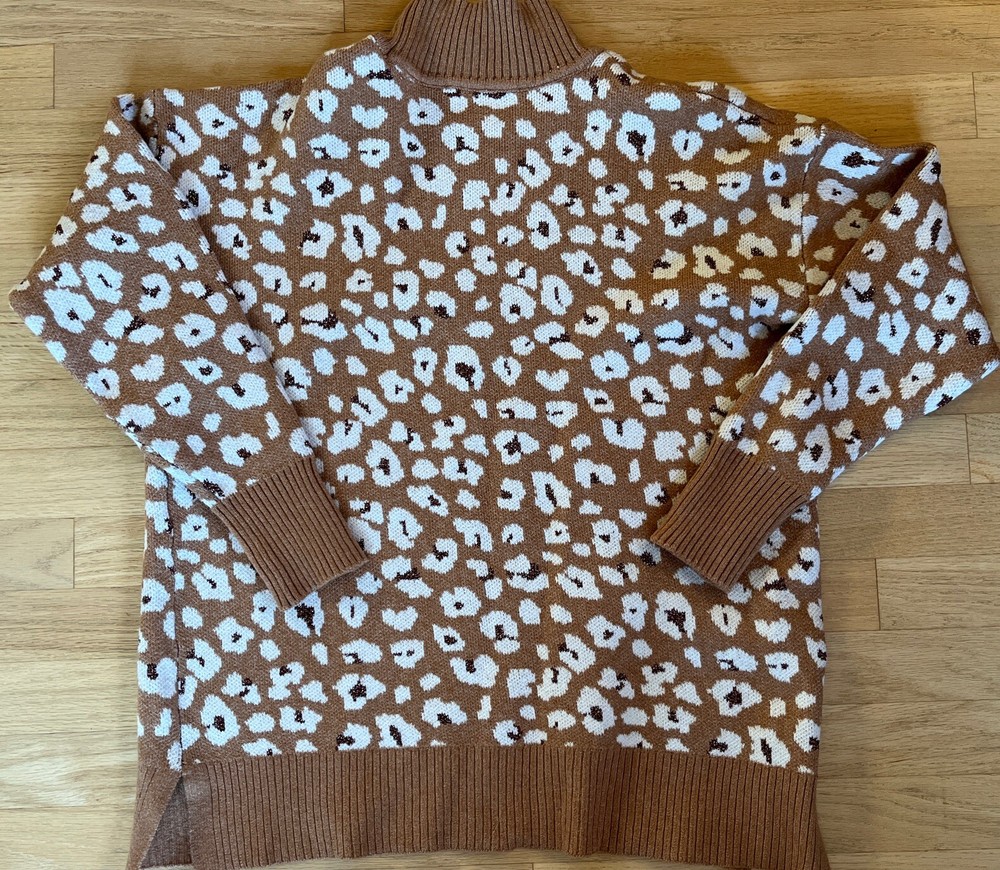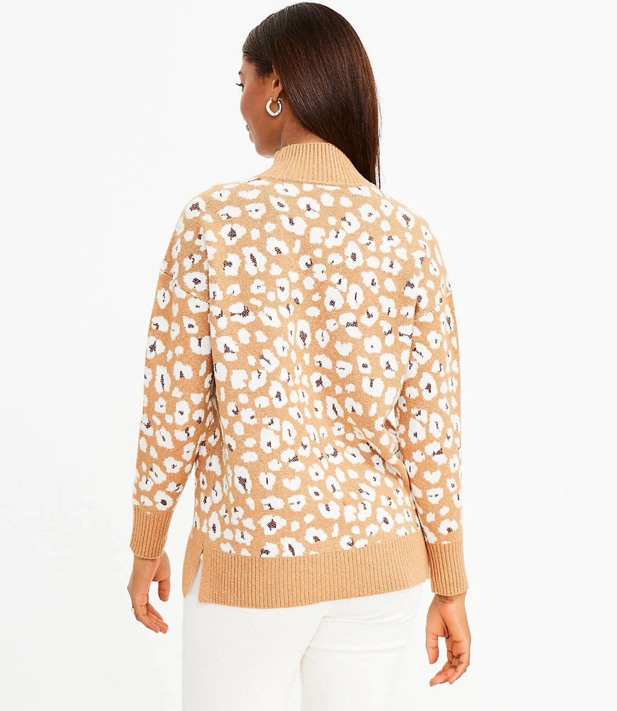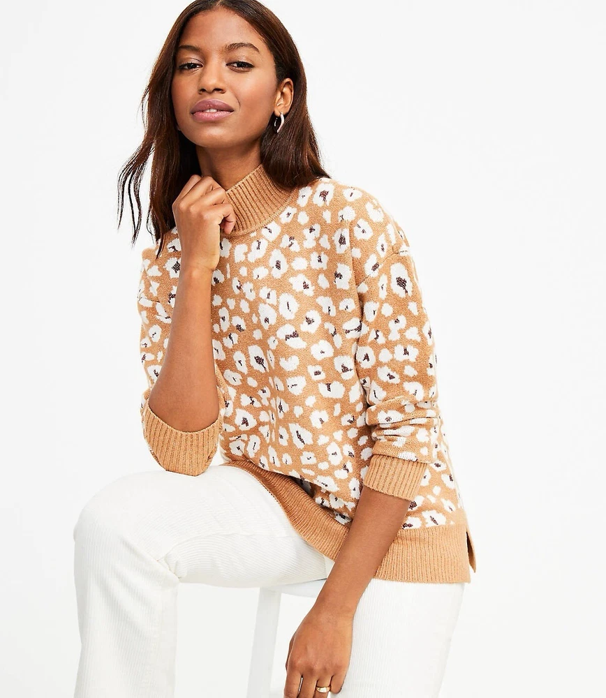 Elevate your wardrobe with this stunning Ann Taylor LOFT sweater. The oversize pullover features a unique camel color with an eye-catching leopard print accent. The mock neck and asymmetrical sleeve add a touch of elegance to the sweater, making it perfect for any occasion, whether it's casual or for business wear. The tight-knit polyester, spandex, metallic, cotton, and acrylic material offers stretch and comfort, making it ideal for the winter and fall seasons. This designer sweater is a must-have for any fashion-conscious woman.