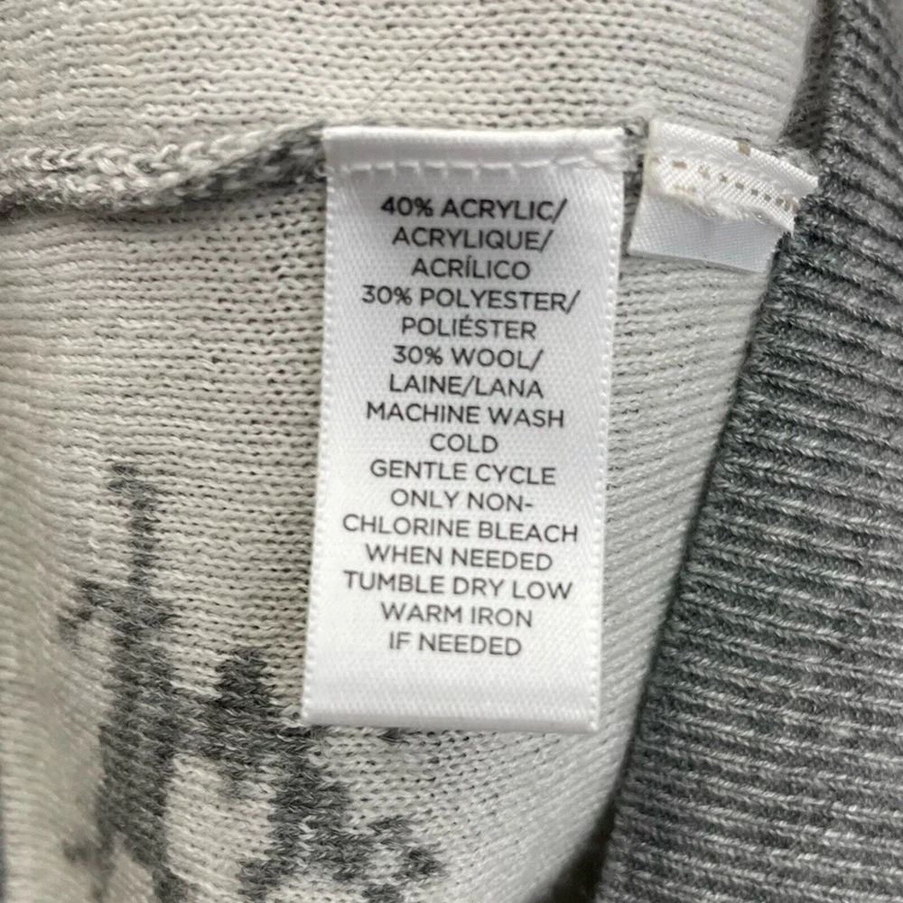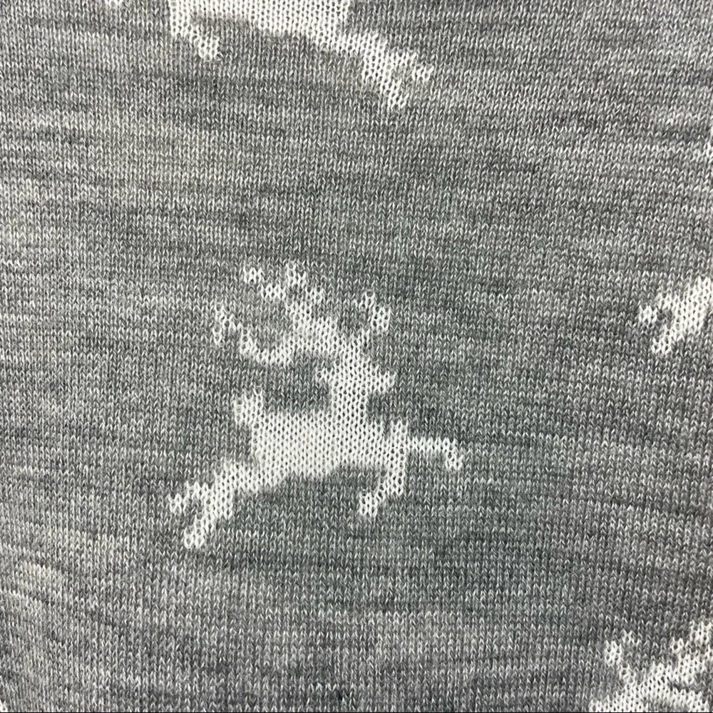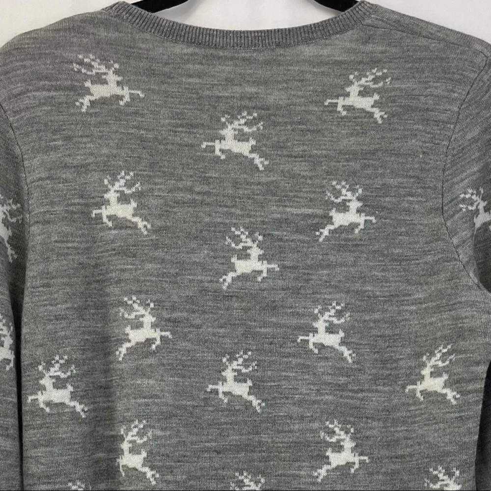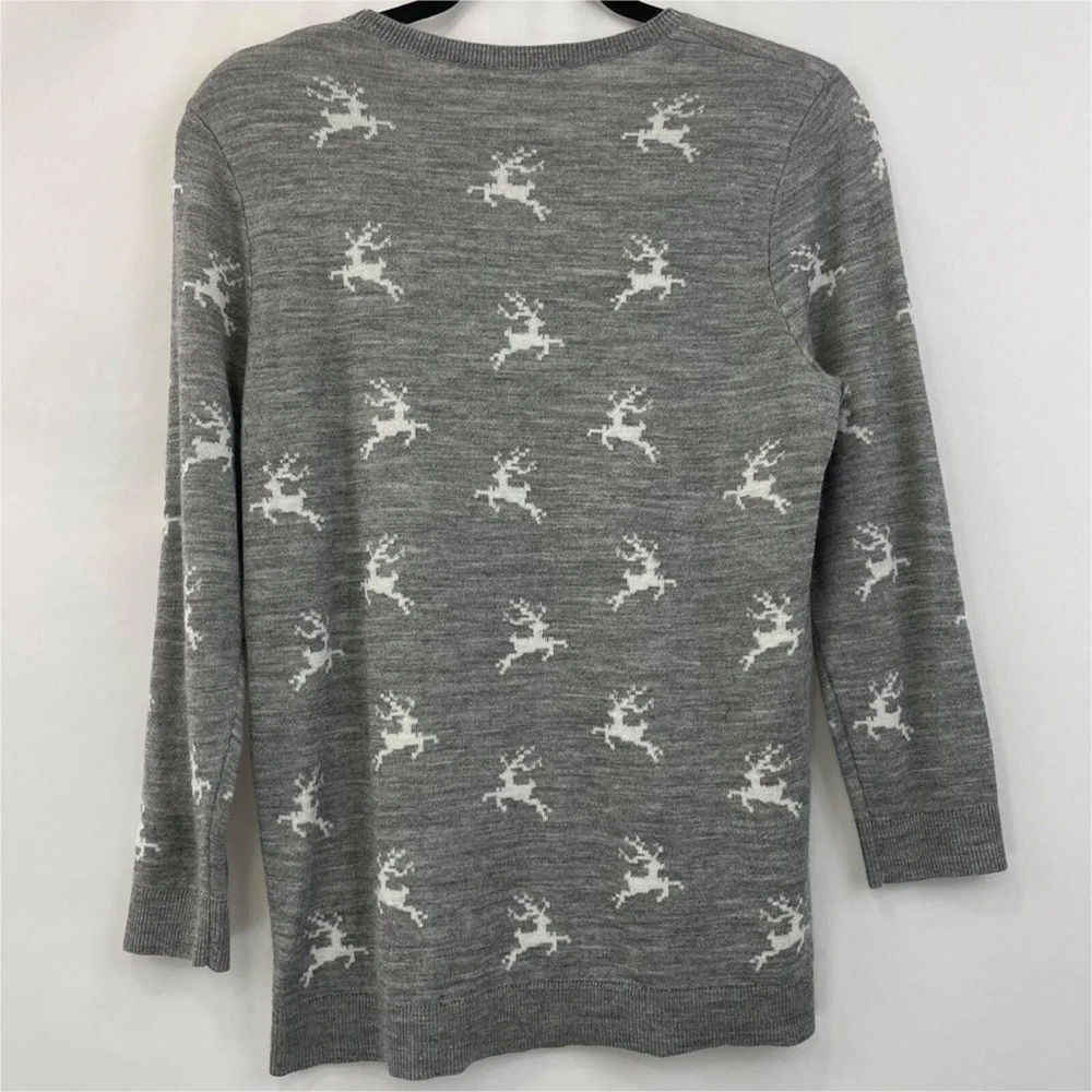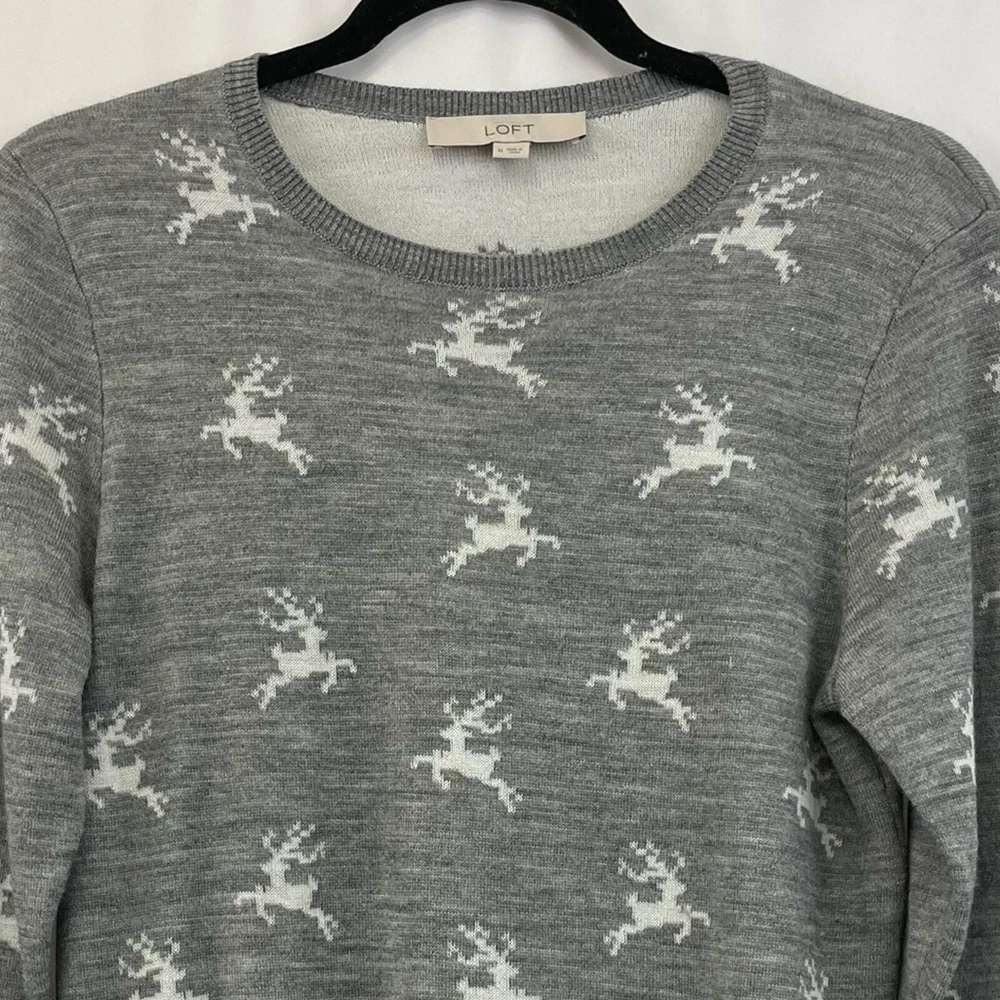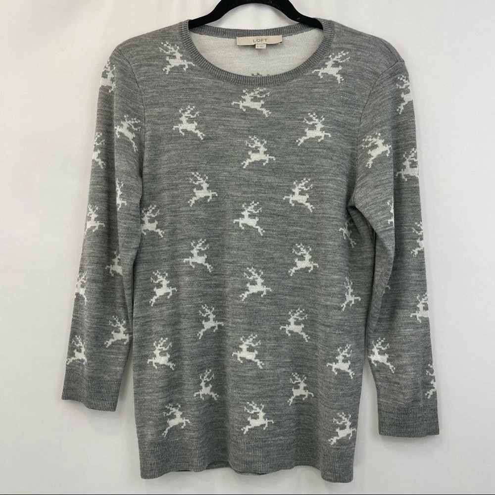 Loft holiday sweater. Gray with white reindeer print. Wool blend. Size small. Excellent preowned condition. Measurements are taken when laid flat and are approximate: armpit to armpit 18.5 inches, length from shoulder 25.5 inches.
