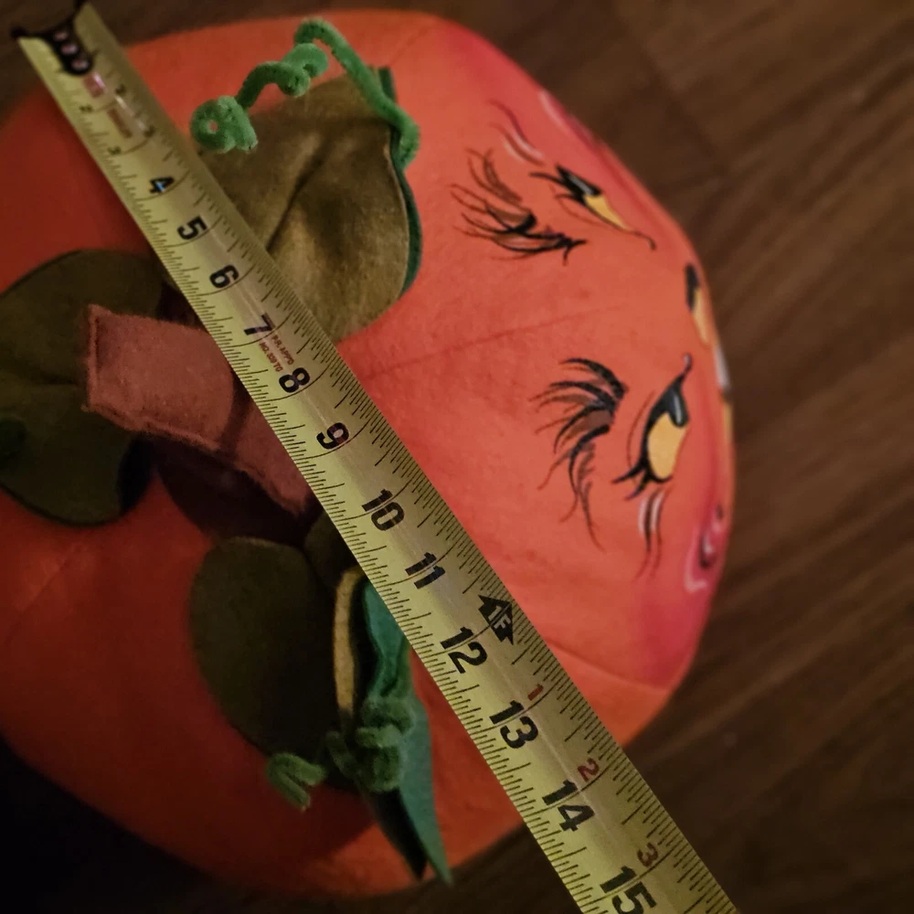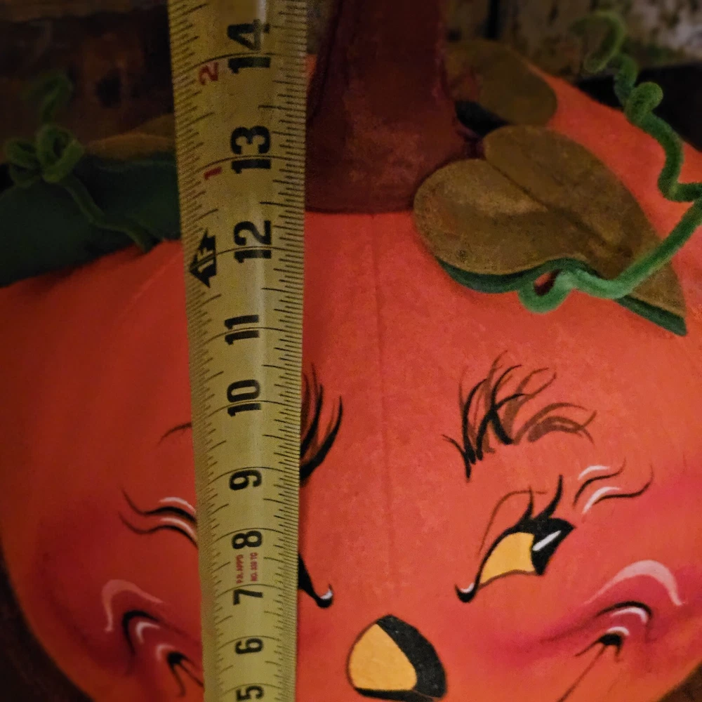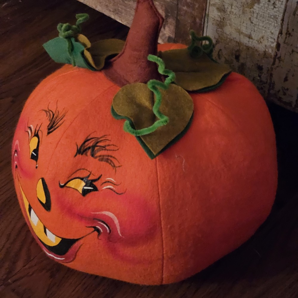 The Annalee Pumpkin Jack-o'-lantern is a vintage Halloween decoration from 1991. Made of orange felt, this kitschy anthropomorphic piece adds a fun and festive touch to any Halloween display. Large see measurements