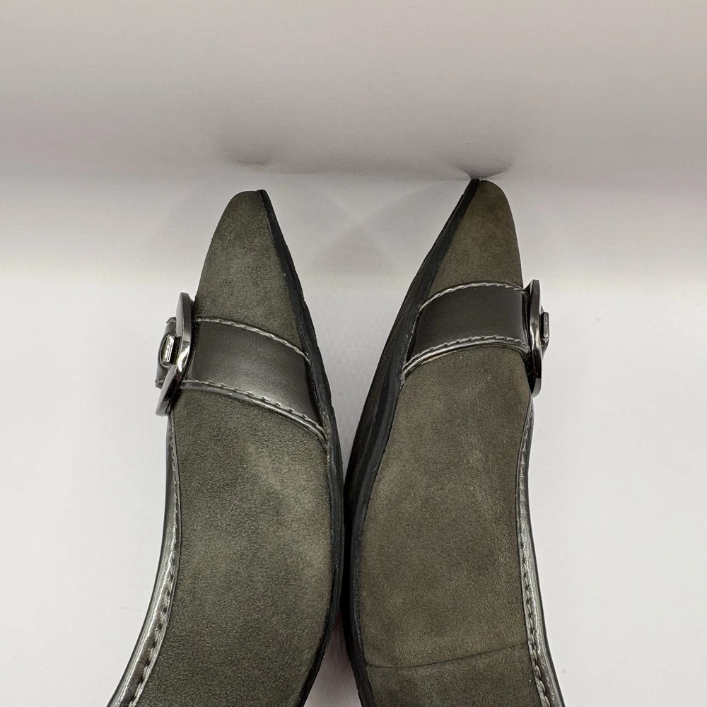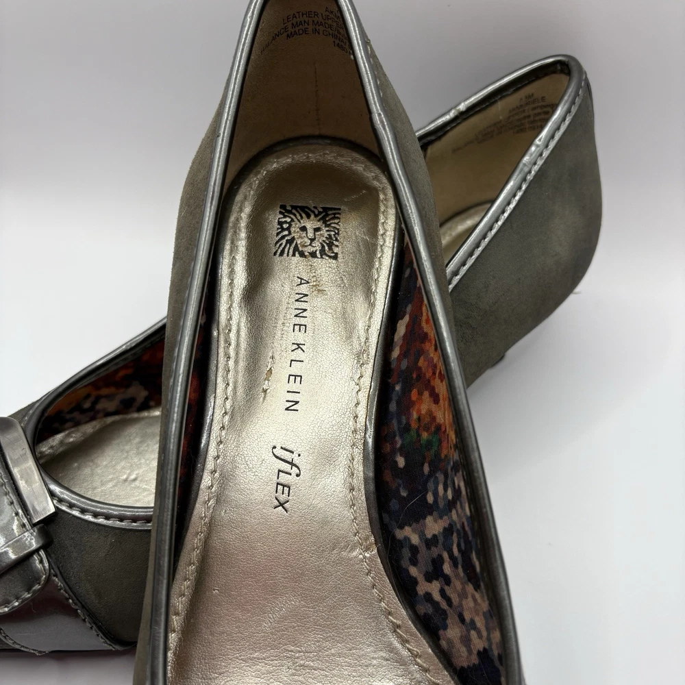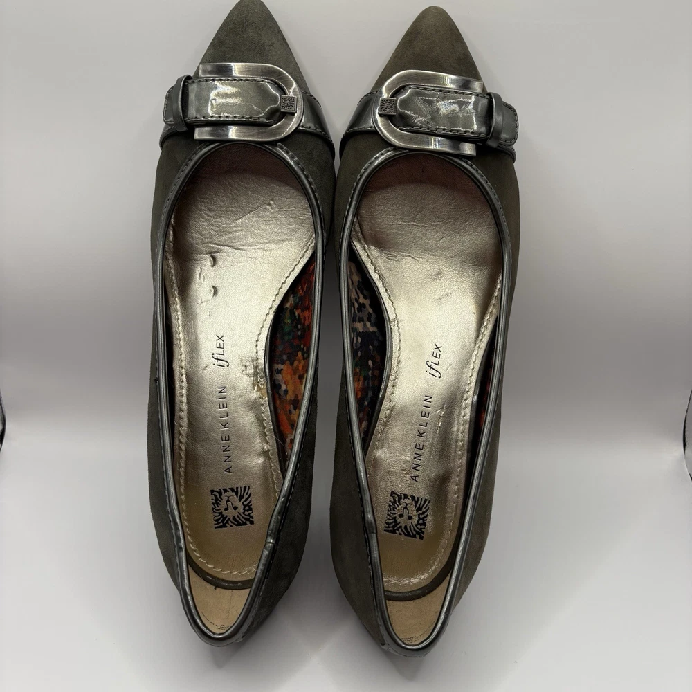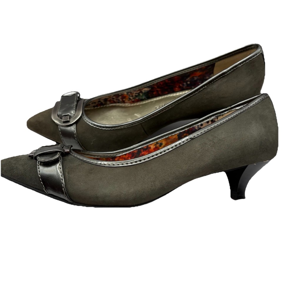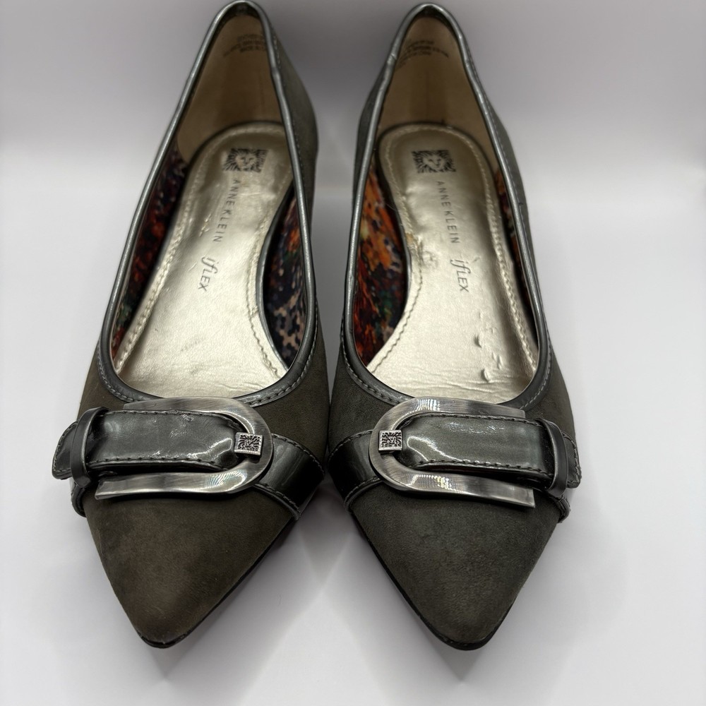 Heel Height: Low (1-1.9 in) Occasion: Business, Workwear, Casual, Christening Brand: Anne Klein US Shoe Size: 7.5 Type: Heel Upper Material: Leather Color: Gray Department: Women Toe Shape: Pointed Toe Shoe Width: M Heel Style: Kitten Country of Origin: China Features: Buckle Style: Pump