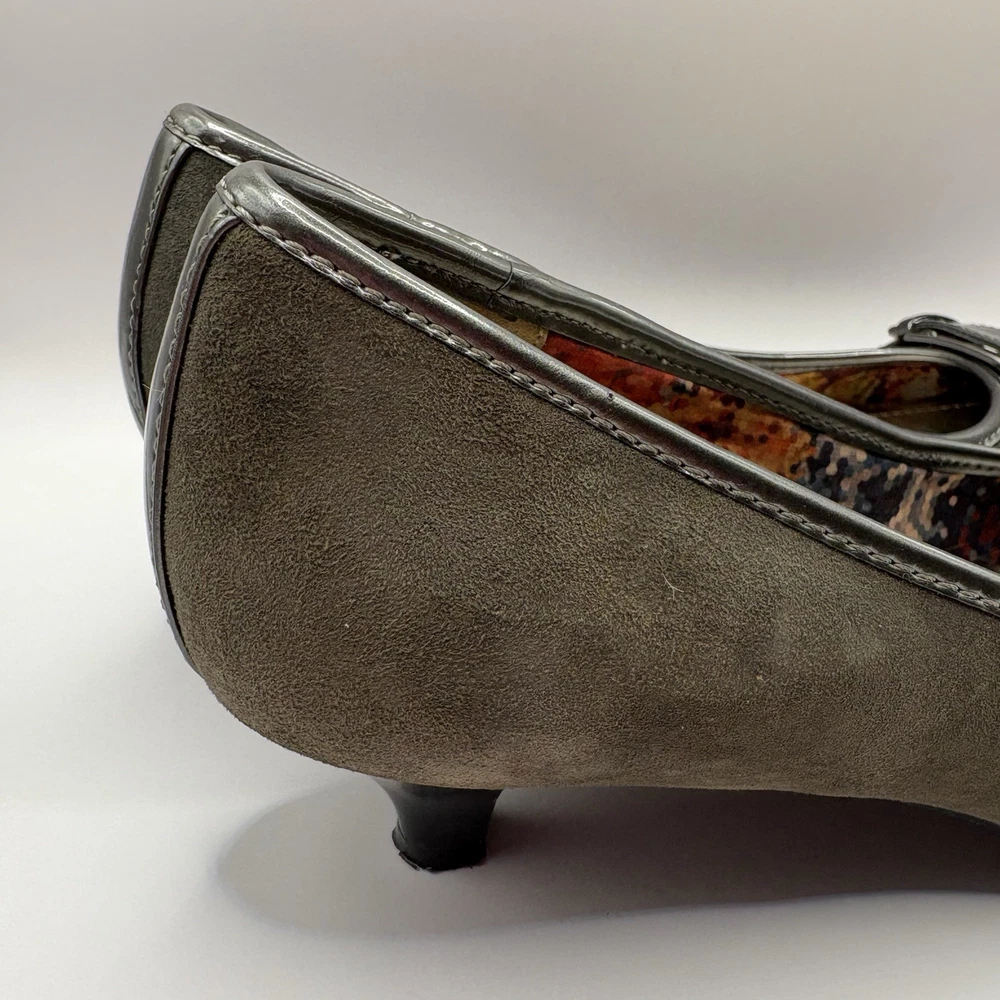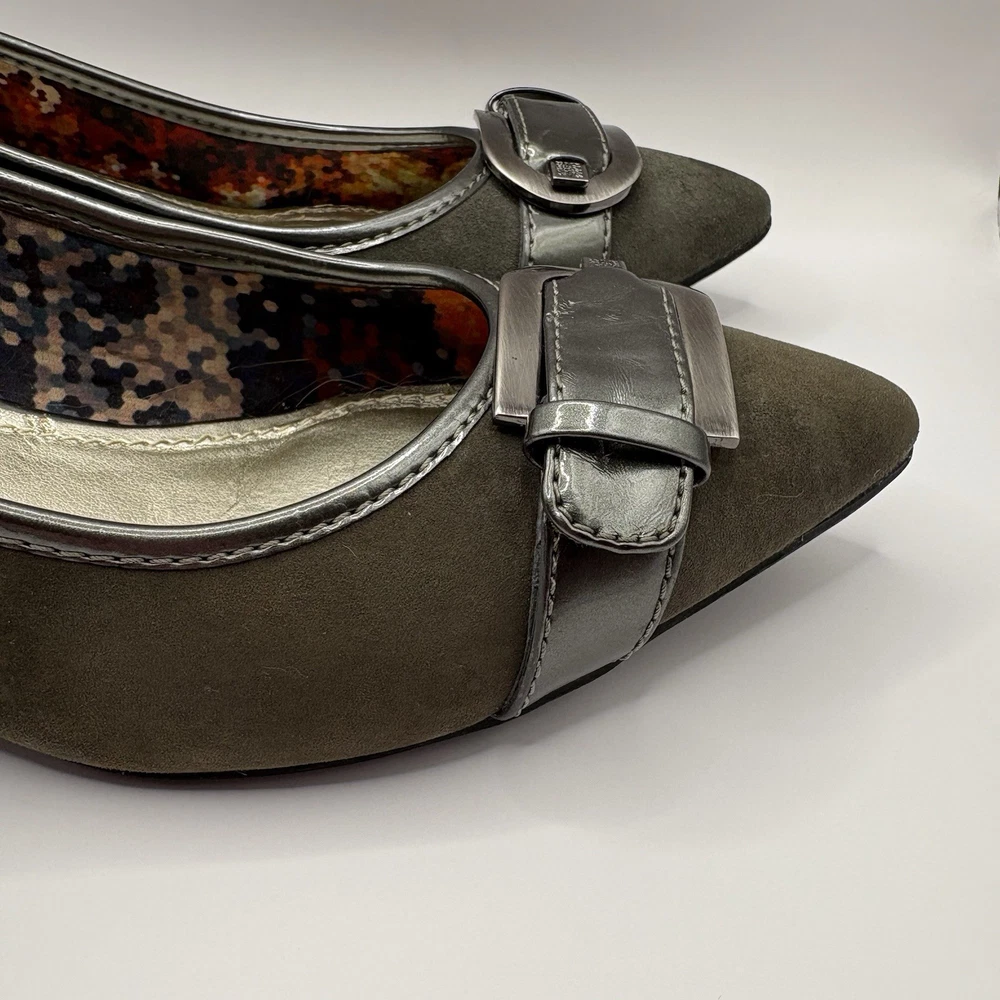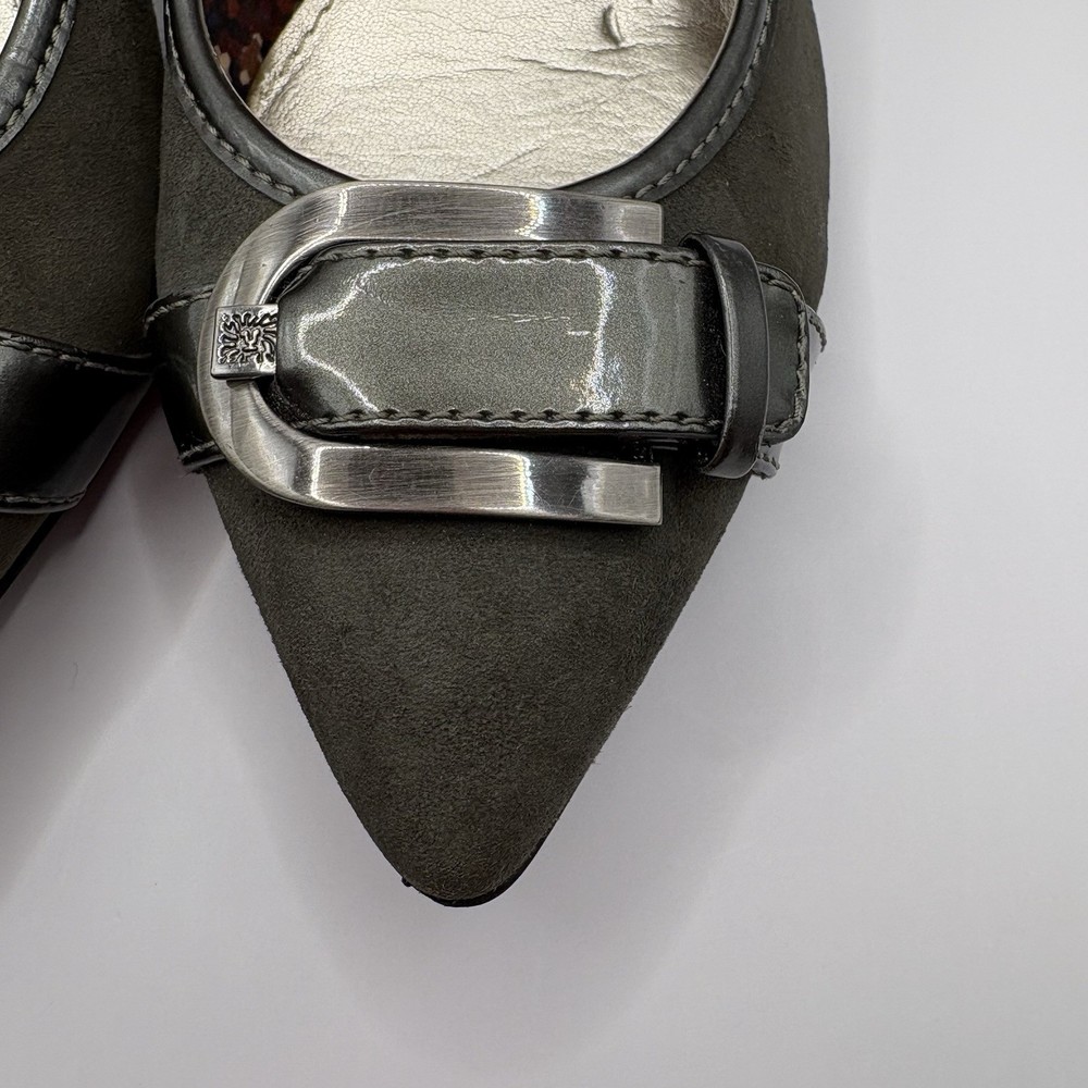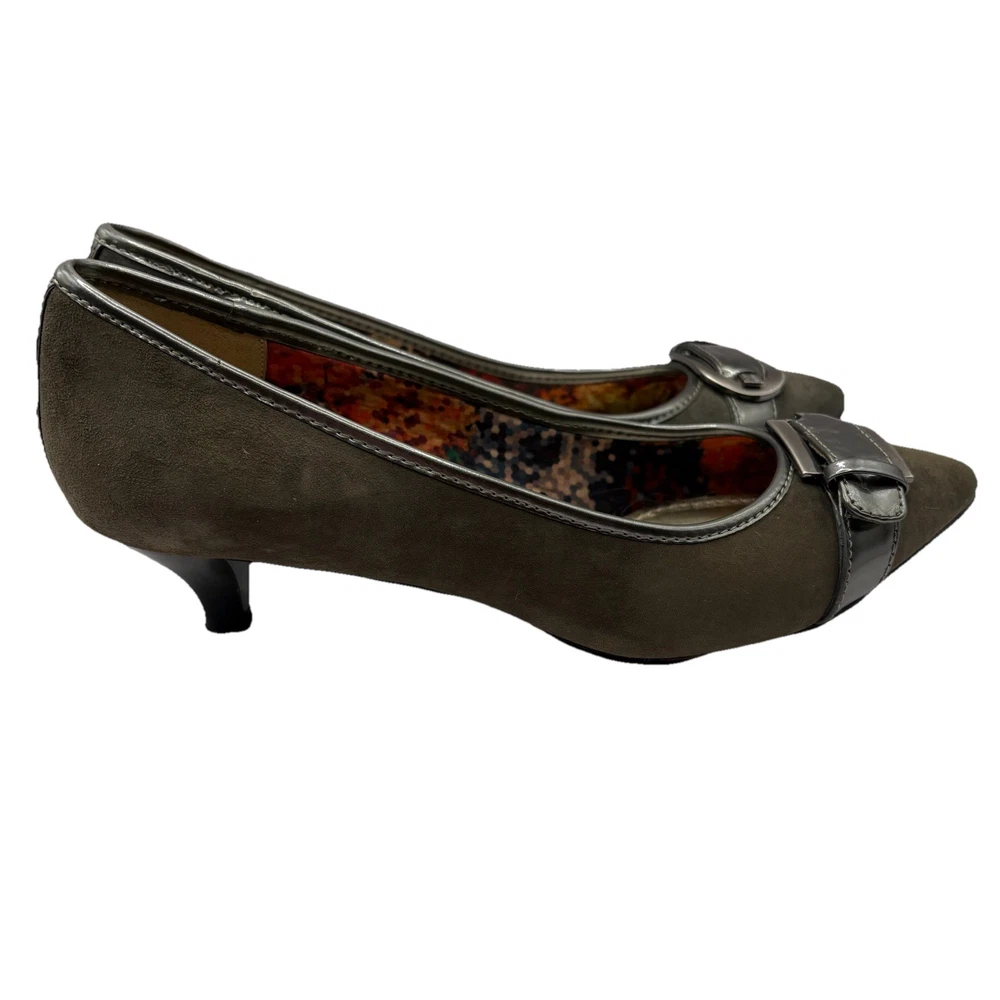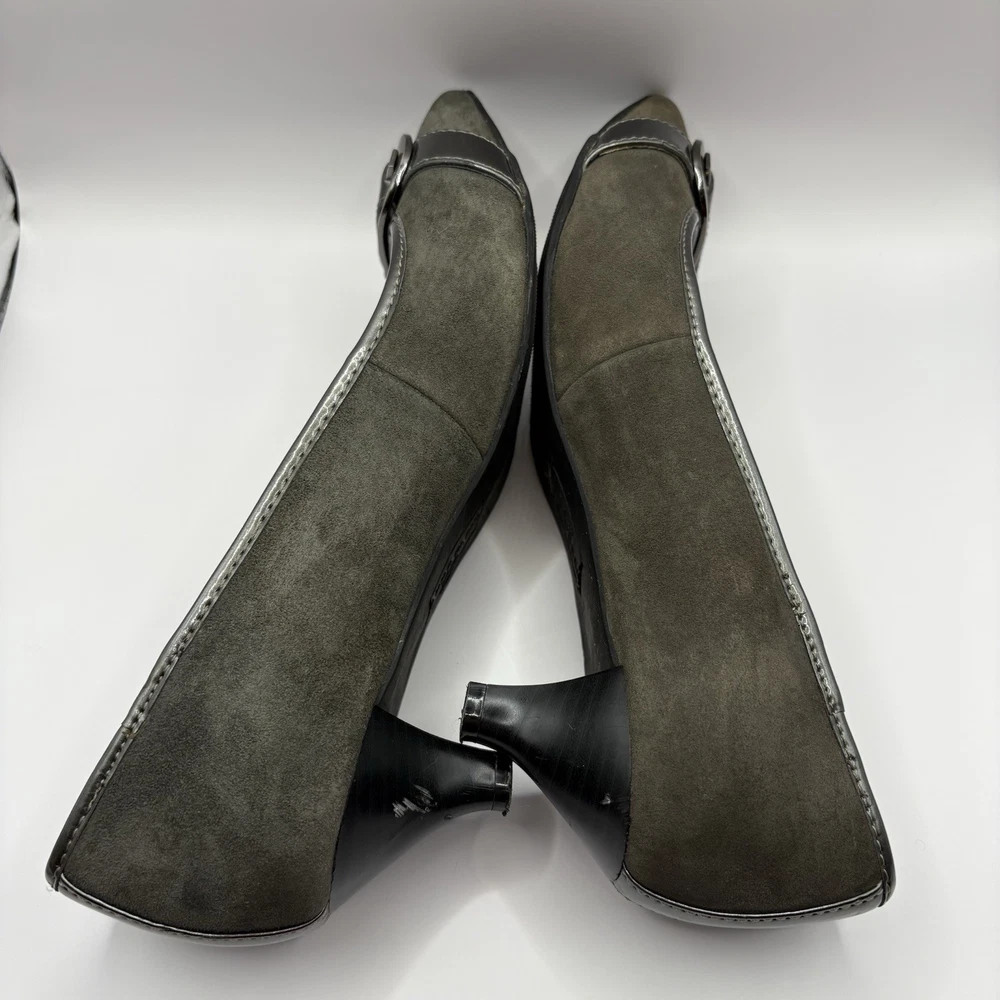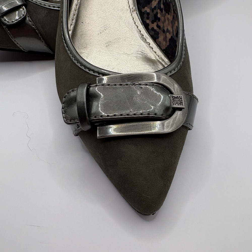 Heel Height: Low (1-1.9 in) Occasion: Business, Workwear, Casual, Christening Brand: Anne Klein US Shoe Size: 7.5 Type: Heel Upper Material: Leather Color: Gray Department: Women Toe Shape: Pointed Toe Shoe Width: M Heel Style: Kitten Country of Origin: China Features: Buckle Style: Pump