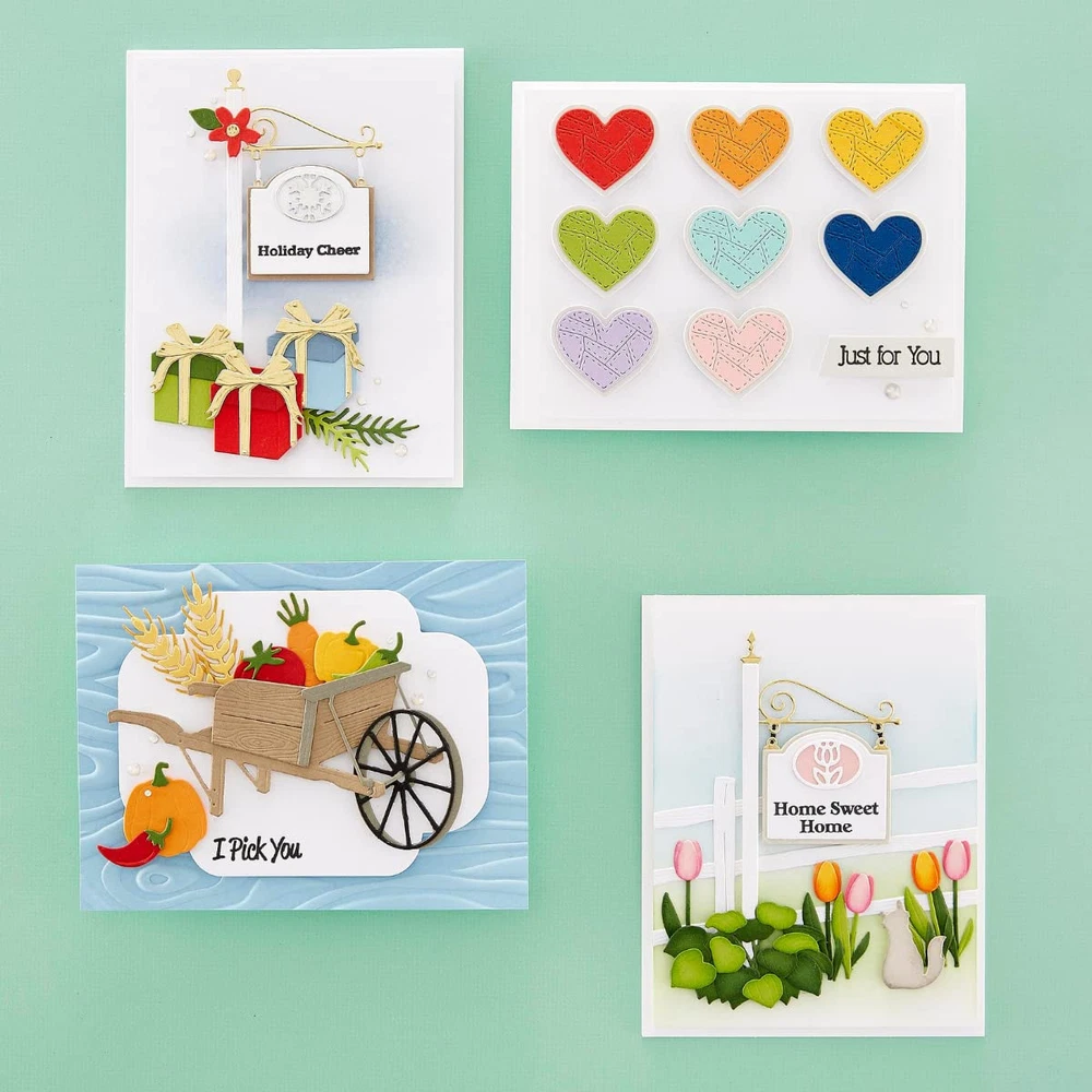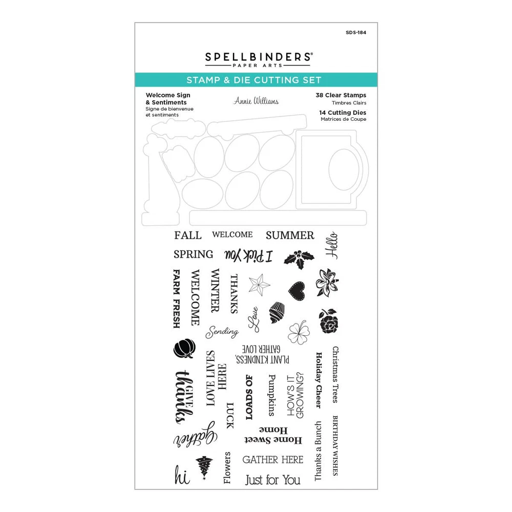Welcome Sign & Sentiments Clear Stamp & Die Set is from the Country Road Collection by Annie and is the perfect set for this collection! The 14 thin metal cutting dies and 38 clear stamps makes a combination of sign designs with a few that can land inside of a card. Die-cut a detailed sign with so many features that are hard to decide which to create first! What a fun set! The clear stamps are designed to be used with an acrylic block. Country Road is Annie ’ debut collection with . This offering creates a wonderful rural backdrop. It includes all the details such as a wheelbarrow, florals, wooden signs to even fencing parts, and more. A clear stamp set provides not only a wonderful wood sign but sentiments and images to tie everything together. Bring a part of the countryside into your projects! Approximate Size: Dies: Wood Post: 3.86 x 0.20 in./9.80 x 0.50 cm Rounded Post Top: 0.46 x 0.30 in./1.20 x 0.80 cm Pointed Post Top: 0.57 x 0.30 in./1.40 x 0.80 cm Outer Sign: 1.59 x 1.45 in./4.00 x 3.70 cm Sign Inlay: 1.47 x 1.33 in./3.70 x 3.40 cm Oval Inlay (Blank and 6 Decorative): 0.87 x 0.62 in./2.20 x 1.60 cm Straight Hanging Post: 2.12 x 0.19 in./5.40 x 0.50 cm Wrought Iron Sign Hanger: 1.94 x 0.73 in./5.00 x 1.90 cm Hanging Chain (2 pcs): 0.06 x 0.62 in./0.20 x 1.60 cm Hanging Sign Hardware (2 pcs): 0.21 x 0.29 in./0.50 x 0.80 cm Stamps: Home Sweet Home: 1.31 x 0.38 in./3.30 x 1.00 cm Holiday Cheer: 1.26 x 0.15 in./3.20 x 0.40 cm Birthday Wishes: 1.36 x 0.11 in./3.50 x 0.30 cm How's It Growing?: 1.04 x 0.36 in./2.60 x 0.90 cm Christmas Trees: 1.28 x 0.13 in./3.20 x 0.30 cm Give Thanks: 1.22 x 0.39 in./3.10 x 1.00 cm Large Welcome: 1.27 x 0.18 in./3.20 x 0.50 cm Small Welcome: 0.91 x 0.13 in./2.30 x 0.30 cm I Pick You: 1.10 x 0.32 in./2.80 x 0.80 cm Sending: 0.75 x 0.28 in./1.90 x 0.70 cm Hello: 0.63 x 0.28 in./1.60 x 0.70 cm Thanks: 0.89 x 0.15 in./2.30 x 0.40 cm Love: 0.59 x 0.25 in./1.50 x 0.60 cm Farm Fresh: 1.33 x 0.14 in./3.40 x 0.40 cm Luck: 0.49 x 0.15 in./1.50 x 0.40 cm Plant Kindness: 1.21 x 0.42 in./3.10 x 1.10 cm Loads of: 1.02 x 0.14 in./2.60 x 0.40 cm Fall: 0.61 x 0.17 in./1.50 x 0.40 cm Spring: 0.87 x 0.18 in./2.20 x 0.50 cm Winter: 1.00 x 0.18 in./2.50 x 0.50 cm Summer: 1.09 x 0.18 in./2.50 x 0.50 cm Gather: 1.01 x 0.50 in./2.60 x 1.30 cm Hi: 0.34 x 0.43 in./0.90 x 1.10 cm Love Lives Here: 1.25 x 0.44 in./3.20 x 1.10 cm Thanks a Bunch: 1.35 x 0.14 in./3.40 x 0.40 cm Just for You: 1.25 x 0.24 in./3.20 x 0.60 cm Gather Here: 1.36 x 0.16 in./3.50 x 0.40 cm Flowers: 0.72 x 0.15 in./1.80 x 0.40 cm Holly & Berries: 0.70 x 0.45 in./1.80 x 1.10 cm Pumpkin: 0.50 x 0.45 in./1.30 x 1.10 cm Christmas Tree: 0.40 x 0.55 in./1.00 x 1.40 cm Cupcake: 0.35 x 0.49 in./0.90 x 1.30 cm Heart: 0.34 x 0.41 in./0.90 x 1.00 cm Star: 0.49 x 0.51 in./1.30 x 1.30 cm 4 Leaf Clover: 0.50 x 0.55 in./1.20 x 1.40 cm Rose: 0.43 x 0.54 in./1.10 x 1.40 cm Flower: 0.52 x 0.66 in./1.30 x 1.70 cm Welcome Sign & Sentiments Clear Stamp & Die Set is from the Country Road Collection designed by Annie The 14 thin metal cutting dies and 38 clear stamps makes a combination of sign designs with a few that can land inside of a card. Die-cut a detailed sign with so many features that are hard to decide which to create first! ' wafer thin etched dies are designed to cut cardstock, paper, metallic foil and other thin materials and can cut, emboss, and stencil with a single template Designed for the Platinum machines, but in most die cutting machines Various Sizes from 0.06" x 10.62" to 3.86" x 0.20"
