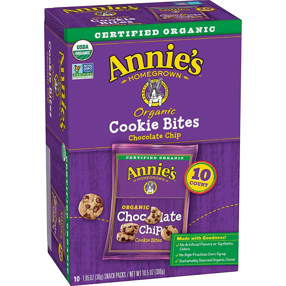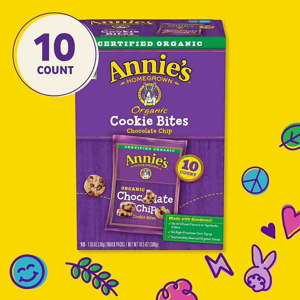Store New Arrivals Add to Favorite View Feedback Contact Fast deliveries to the customer's home Quality customer service John Make the customers happy! Annie'S Organic Chocolate Chip Cookie Bites, 10 Pouches, 10.5 Oz Description BITE-SIZE COOKIES: Annie's Chocolate Chip Cookie Bites are the little cookies that are big on taste, fun, and chocolatey goodness WHOLESOME INGREDIENTS: No artificial flavors, synthetic colors, or high fructose corn syrup CERTIFIED ORGANIC: They're non-GMO and certified USDA Organic for the goodness you'd expect from Annie's snacks ON-THE-GO TREAT: Perfectly portable dessert for lunches or an anytime treat CONTAINS: One 10.5 oz box of Annie's Organic Chocolate Chip Cookie Bites; 10 pouches Annie's Chocolate Chip Cookie Bites are the little cookies that are big on taste, fun, and chocolatey goodness! With real, organic chocolate chips and bite-size yumminess, kids and adults will come hopping to devour these scrumptious sweet treats. Best of all, they don't contain any high fructose corn syrup, artificial flavors, or synthetic colors. They're also non-GMO and certified USDA Organic. These bite-size treats are the perfect addition to lunches and snack bags for kids and teenagers alike! Grab a box of cookie bites to add fun, chocolate flavor, and hoppiness at snack time. Annie's makes products in over 20 family-friendly categories, from fruit flavored snacks and cereal to mac and cheese. For busy bunnies and families on the go, we help make life a little easier and more delicious by spreading goodness through tasty foods and kindness to the planet. Item model number 10013562493941 Unit Count 10.5 Ounce Style Round Number of Items 1 Product Dimensions 3.63 x 6 x 8.88 inches; 10.56 ounces Country of Origin USA Occasion Birthday Flavor Chocolate Chip Is Discontinued By Manufacturer No Size 1.05 Ounce (Pack of 10) ABOUT US We offer the best prices around on high quality products. Our E-store includes media such as books, movies, music and games while offering electronics, toys, sporting apparel, clothing, tools, general home, garden items and more. SHIPPING We are always working hard to ensure your package arrives as soon as possible. Please understand that some factors like weather, high postal traffic, and the performance of shipping companies are outside of our control. We offer free shipping to the lower 48 states and ship within 2 business days of payment, usually sooner. We do not accept P.O. Boxes. Please provide a physical address. For shipping outside of the continental USA, we only use eBay's Global Shipping Program. The item is shipped to KY and then sent to the rest of the world. International customers are responsible for all duties and taxes. Continue to 'check out' to calculate costs for shipping the item to your country. Messages regarding eBay's Global Shipping Program MUST be directed at eBay EXCLUSIVELY. RETURNS We offer a 30-Day Return Policy on items in which you are not completely satisfied with. You have the option of a full-refund or an exchange of the item. No returns are available on items shipped outside of the USA PAYMENT We accept PayPal. CONTACT US This page content is yet to come Please ad us to your favorite seller and visit again later Thank You CUSTOMER SATISFACTION We try our very best to make sure every customer is completely satisfied. If there's a problem, message us! We're happy to help. WE ACCEPT