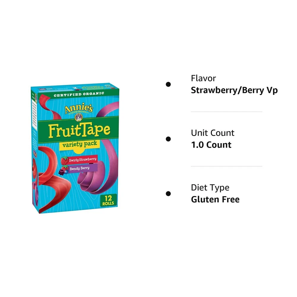 Annie's Organic Fruit Tape, Swirly Strawberry and Bendy Berry Flavors, Variety Pack, 12 Rolls, 9 oz Product Overview Product Name : Annie's Organic Fruit Tape, Swirly Strawberry and Bendy Berry Flavors, Variety Pack Size : 9 Ounces Total Count : 12 Rolls Brand : Annie's Category : Organic Snacks Introduction Discover the delightful and nutritious Annie's Organic Fruit Tape , available in a convenient variety pack that includes two irresistible flavors: Swirly Strawberry and Bendy Berry . Packaged with 12 rolls in total, this 9-ounce bundle offers a fun and fruity snacking experience that's perfect for kids and adults alike. Made with organic ingredients and free from artificial additives, Annie's Fruit Tape provides a wholesome and delicious way to enjoy a fruity treat. Key Features Organic and Nutritious Certified Organic : Crafted with certified organic ingredients, ensuring no synthetic pesticides or GMOs are used. Real Fruit Ingredients : Made with real fruit puree and juice, offering a natural and flavorful snacking option. Fun and Flavorful Variety Pack : Includes both Swirly Strawberry and Bendy Berry flavors, providing a delightful mix of tastes. Kid-Friendly Shapes : Fun tape shapes make these snacks engaging and enjoyable for children. Convenient and Practical Portable Snacking : Individually wrapped rolls make it easy to take these snacks on the go, whether for lunchboxes, picnics, or travel. Multi-Pack Convenience : With 12 rolls in each pack, there's plenty to share and enjoy. Detailed Specifications Product Details Weight : 9 ounces total (0.75 ounces per roll) Count : 12 rolls (6 of each flavor) Brand : Annie's Package Dimensions : 10 x 6 x 2 inches Ingredients and Nutrition Key Ingredients : Organic apple puree concentrate, organic tapioca syrup, organic sugar, organic strawberry puree concentrate, organic berry puree concentrate, organic lemon juice concentrate. Allergens : Gluten-free. Made in a facility that processes other allergens, so check packaging for detailed allergen information. Nutrition Information : Each serving provides essential nutrients. Detailed nutritional facts per serving are available on the packaging, including calories, sugar content, and vitamins. Benefits of Annie's Organic Fruit Tape Healthy and Wholesome Organic Ingredients : Made with high-quality organic ingredients that are free from synthetic pesticides and GMOs. Real Fruit Goodness : Contains real fruit puree and juice, ensuring a nutritious and natural snack. Deliciously Flavored Swirly Strawberry and Bendy Berry : Enjoy the delightful and vibrant flavors of strawberry and mixed berry. Appealing to Kids : Fun tape shapes and delicious flavors make these snacks a favorite among children. Perfect for Any Occasion Versatile Snacking : Great for school lunches, road trips, or as an afternoon snack. Shareable Pack : The pack of 12 rolls ensures you have enough to share with friends and family. Usage Suggestions Creative Snack Ideas Lunchbox Treat : Perfect addition to your child’s lunchbox for a wholesome and fun treat. Trail Mix : Combine with nuts and dried fruit for a homemade trail mix that’s perfect for hiking or road trips. Dessert Garnish : Use pieces of fruit tape to decorate cupcakes, cakes, or ice cream for a fun and fruity touch. Snack Platter : Include in a snack platter with cheese, crackers, and other finger foods for a delightful party treat. Customer Testimonials What Our Customers Are Saying "Favorite Snack for My Kids" : "My children absolutely love these fruit tapes. The strawberry and berry flavors are delicious, and I feel good knowing they’re eating something organic." - Jessica M. "Great for On-the-Go" : "These are perfect for keeping in my bag for a quick and healthy snack. The individual packaging is really convenient." - Michael L. "Fun and Tasty" : "The fun tape shapes and the great flavors make these a hit in our household. We all enjoy them!" - Emily S. Frequently Asked Questions Are these snacks gluten-free? Yes, Annie's Organic Fruit Tape is gluten-free, making it suitable for those with gluten sensitivities or celiac disease. What makes these snacks organic? Annie's Organic Fruit Tape is made with certified organic ingredients, meaning they are grown without synthetic pesticides, fertilizers, or GMOs. Can I recycle the packaging? Yes, the packaging is recyclable. Please check with your local recycling program for specific guidelines. Are there any artificial flavors or preservatives? No, Annie's Organic Fruit Tape is free from artificial flavors and preservatives, offering a natural and wholesome snacking option. How should I store these snacks? Store in a cool, dry place to maintain freshness. Once opened, keep the snacks in an airtight container for best results. Conclusion Annie's Organic Fruit Tape, Swirly Strawberry and Bendy Berry Flavors offers a perfect combination of delightful flavors, fun shapes, and wholesome ingredients. With the convenience of individually wrapped rolls in a 9-ounce variety pack, these snacks are ideal for any occasion, whether it's a quick treat, a lunchbox addition, or a snack for sharing with friends and family. Made with certified organic ingredients and free from artificial flavors and preservatives, Annie's Fruit Tape provides a nutritious and delicious snacking option you can feel good about. Enjoy the delightful flavors and make snack time more enjoyable with Annie's Organic Fruit Tape. Order your pack of 12 rolls today and experience the delicious and wholesome goodness of Annie's! FRUIT FLAVORED TAPE: Certified organic fruit flavored tape rolls are equal parts fun and delicious REAL INGREDIENTS: No artificial flavors, synthetic colors or high fructose corn syrup MADE WITH ORGANIC FRUIT JUICE: These fruit flavored snacks are made with organic pear juice concentrate (See nutrition panel for a complete list of ingredients; They are not intended to replace fruit or vegetables in the diet) GLUTEN FREE: Annie's organic 