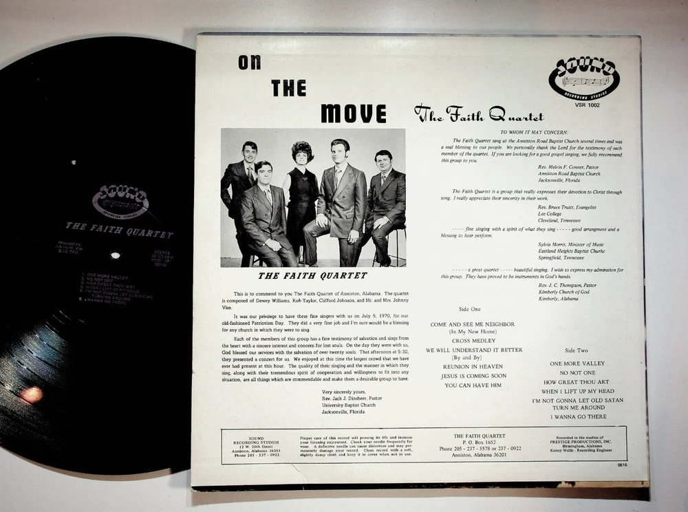 Yes we combine shipping for multiple purchases. Add multiple items to your cart and the combined shipping total will automatically be calculated. Anniston Alabama Faith Quartet Come And See Me Neighbor Gospel Christian Vinyl LP Record VG+ Vinyl / Jacket Grade Per Goldmine Standard: VG+ / VG+ Side One COME AND SEE ME NEIGHBOR (In My New Home) CROSS MEDLEY WE WILL UNDERSTAND IT BETTER (By and By) REUNION IN HEAVEN JESUS IS COMING SOON YOU CAN HAVE HIM Side Two ONE MORE VALLEY NO NOT ONE HOW GREAT THOU ART WHEN I LIFT UP MY HEAD I’M NOT GONNA LET OLD SATAN TURN ME AROUND 1 WANNA GO THERE This is to commend to you The Faith Quartet of Anniston, Alabama. The quartet is composed of Dewey Williams, Rob Taylor, Clifford Johnson, and Mr. and Mrs. Johnny Vise. It was our privilege to have these fine singers with us on July 5, 1970, for our old-fashioned Patriotism Day. They did a very fine job and I’m sure would be a blessing for any church in which they were to sing. Each of the members of this group has a fine testimony of salvation and sings from the heart with a sincere interest and concern for lost souls. On the day they were with us, God blessed our services with the salvation of over twenty souls. That afternoon at 5:30, they presented a concert for us. We enjoyed at this time the largest crowd that we have ever had present at this hour. The quality of their singing and the manner in which they sing, along with their tremendous spirit of cooperation and willingness to fit into any situation, are all things which are commendable and make them a desirable group to have. Very sincerely yours, Rev. Jack J. Dinsbeer, Pastor University Baptist Church Jacksonville, Florida THE FAITH QUARTET P. 0. Box 1652 Anniston, Alabama 36201 Recorded in the studios of PRESTIGE PRODUCTIONS. INC. Birmingham, Alabama Kenny Wallis - Recording Engineer Thank you for your business. Gallimoresgoods